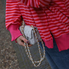 Deze Oversized Streep Sweater is een gedurfde en energieke eyecatcher, perfect om een flinke dosis kleur aan je garderobe toe te voegen. De sweater is uitgevoerd in een opvallend horizontaal streeppatroon in roze en rood. Dankzij de zeer ruime, oversized pasvorm, de verlaagde schoudernaden en de stoere 'inside-out' naden bij de mouwinzet en boorden heeft deze trui een uitgesproken moderne en nonchalante look.