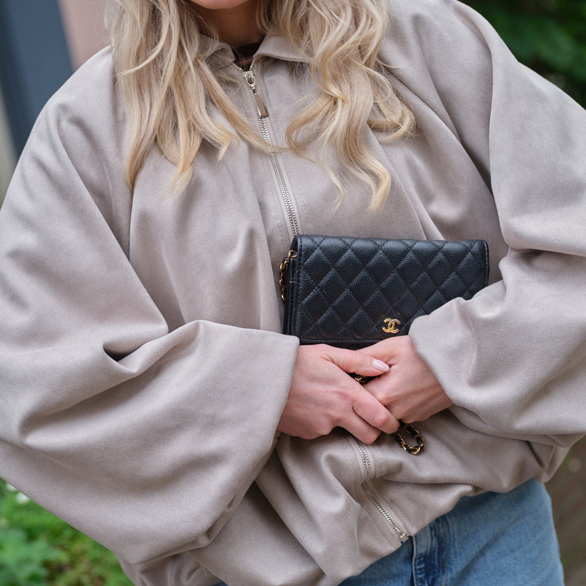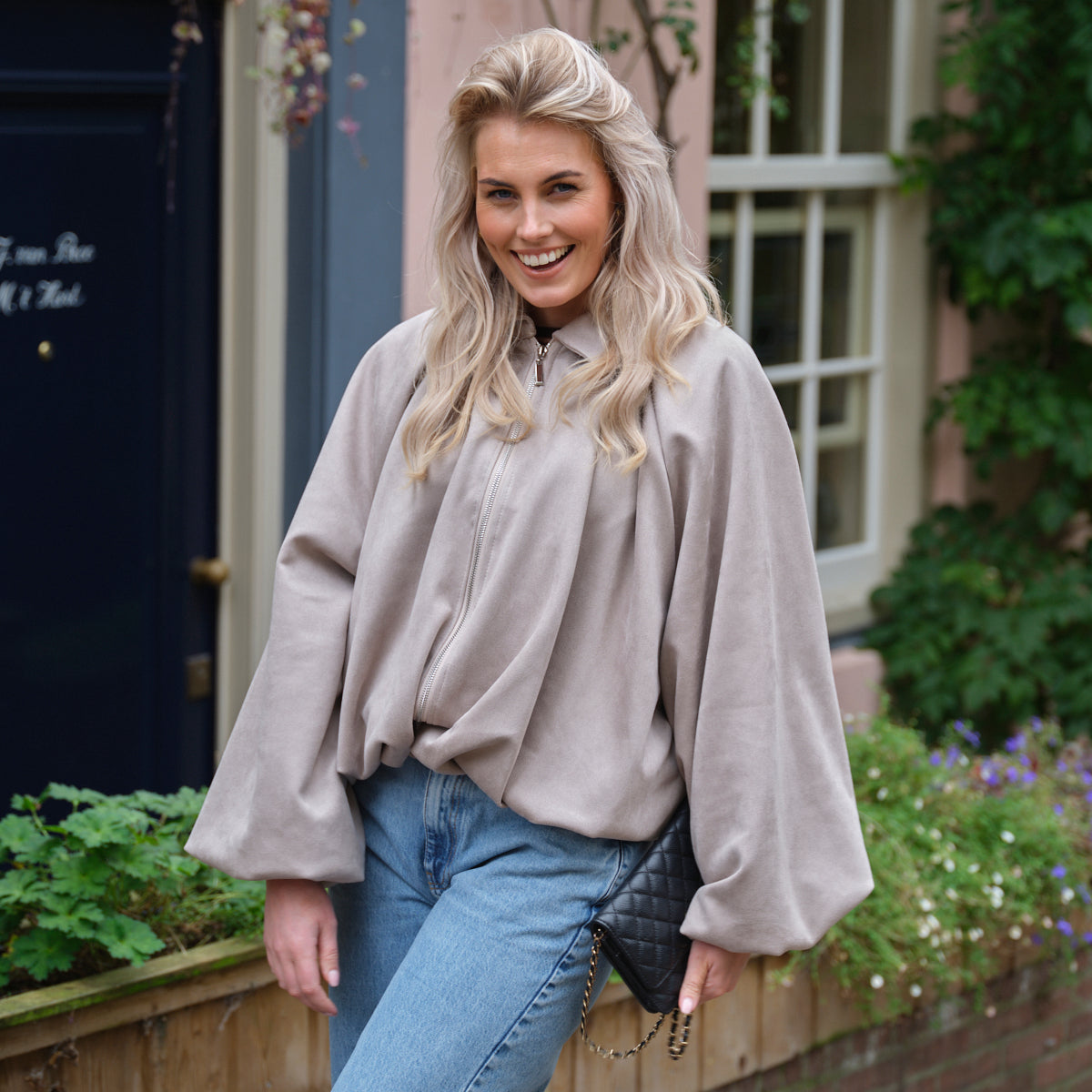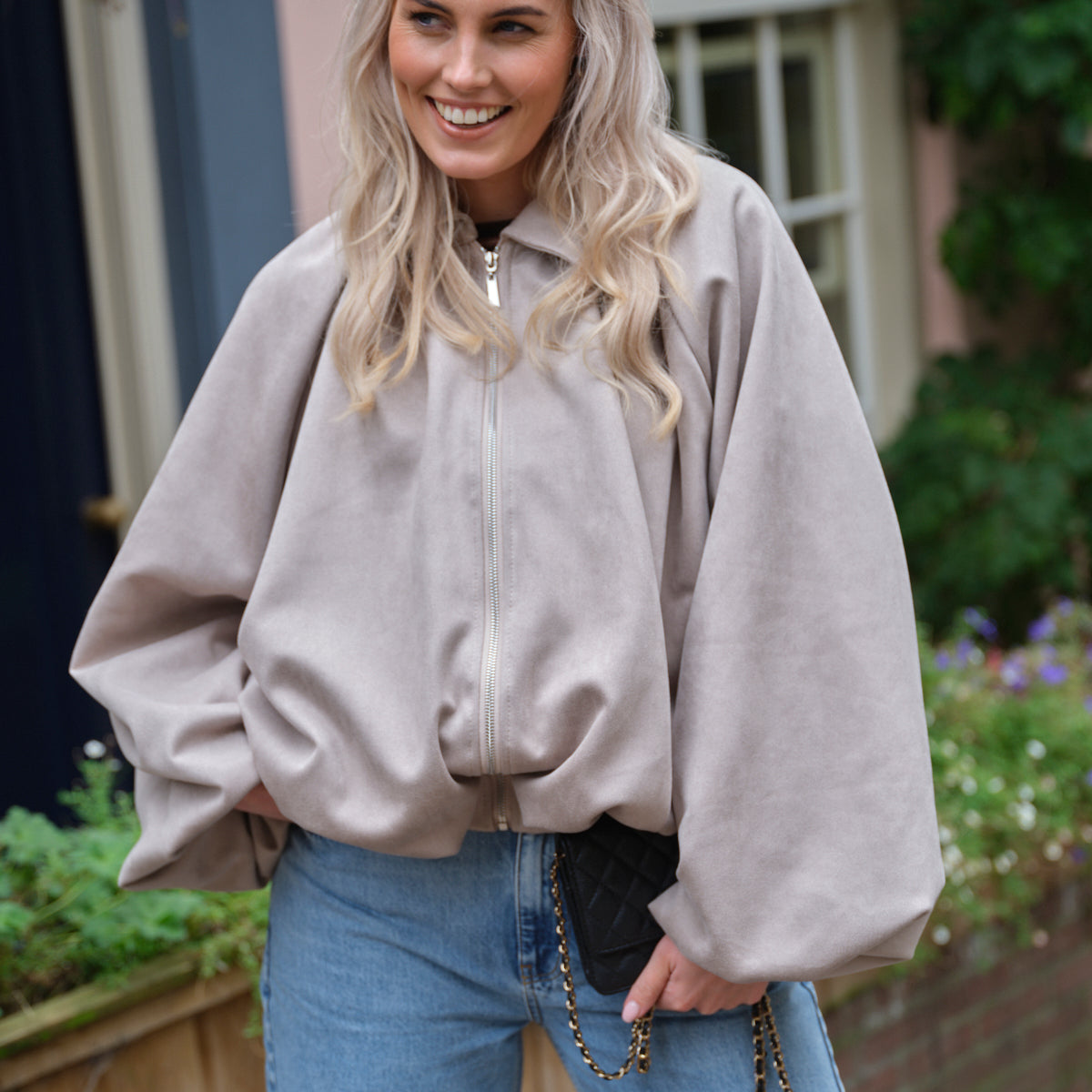 Dit Suedine Jack is de perfecte luxe layer voor elk seizoen. Het jasje is uitgevoerd in een zachte suèdelook stof in de neutrale en trendy kleur greige (een mix van grijs en beige). Het jack heeft een klassieke kraag, een zilverkleurige ritssluiting en valt op door de geplooide schouderdetails, wat zorgt voor een subtiel statement. De elastische boord aan de onderkant geeft het jack een licht bomberjack-silhouet. Style 'm met lichte denim.