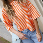 De frisse combinatie van oranje met off-white strepen geeft deze leuke top een speelse en zomerse uitstraling. De relaxte, iets wijdere fit en de zachte stof zorgen voor een heerlijk comfortabele look. Dankzij het cropped model en de halflange mouwen krijgt het item een moderne, nonchalante touch. Perfect om te combineren met een high waist jeans of rok voor een casual, trendy outfit.