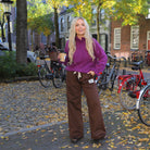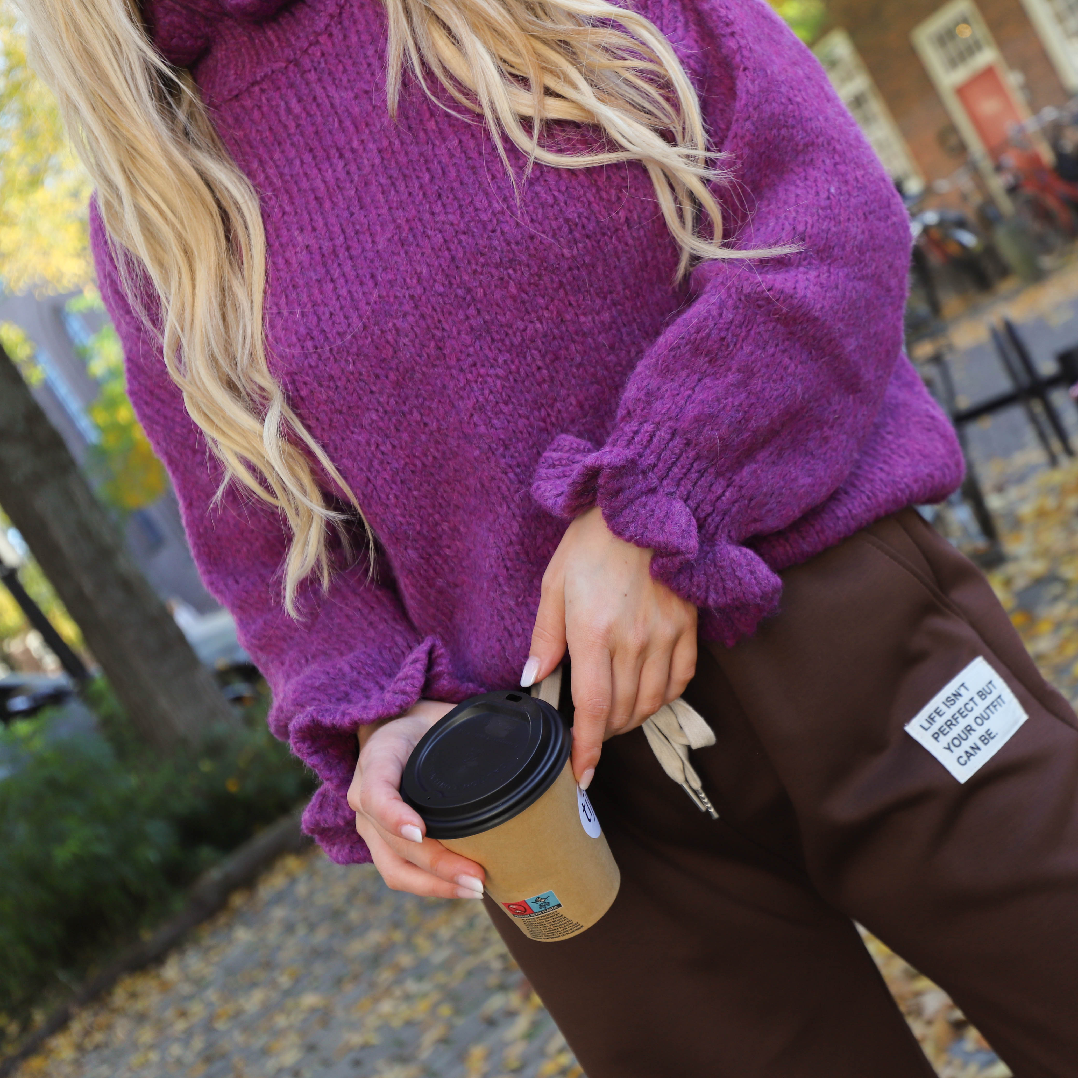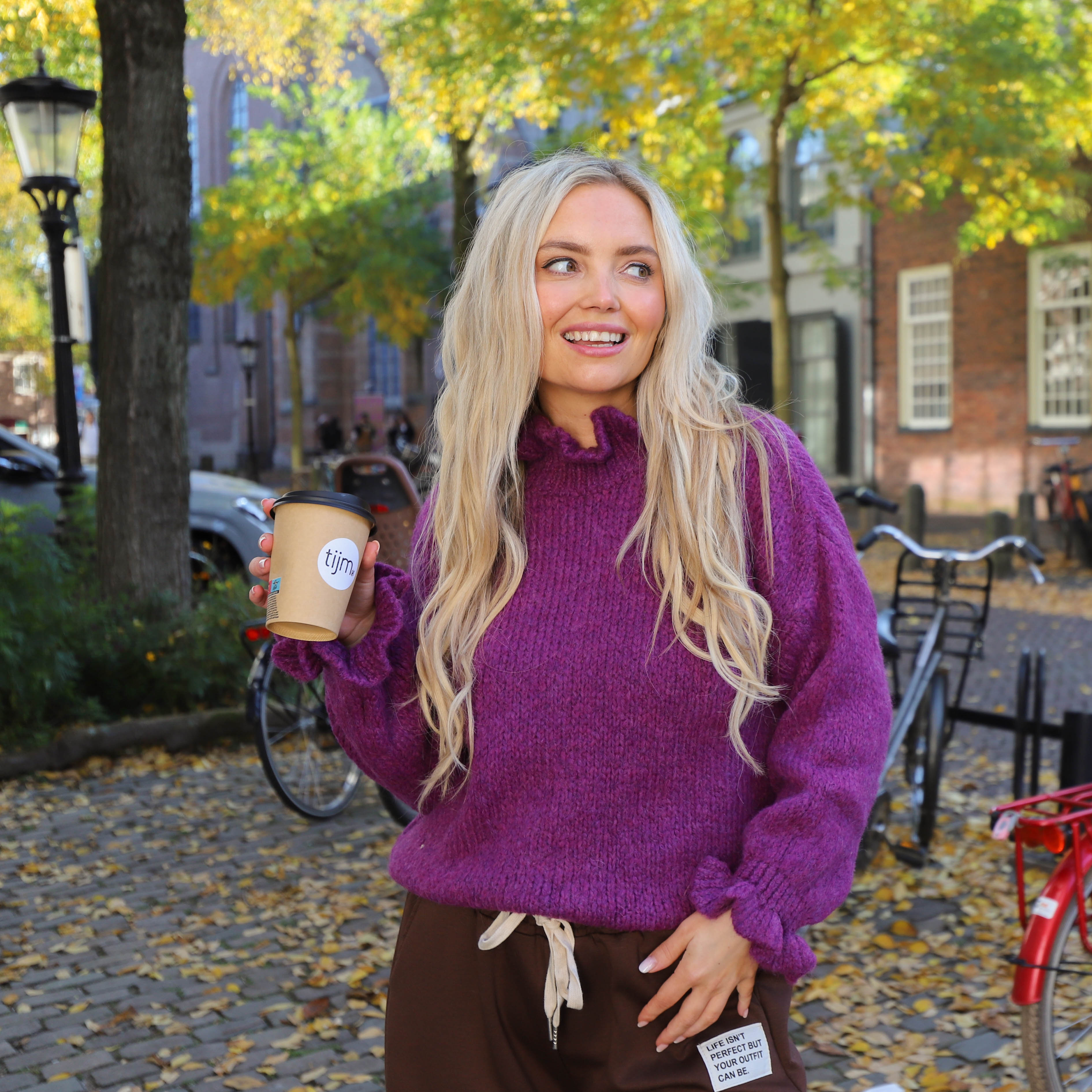Deze Ruffle Trui is een chique en warme toevoeging aan je knitwear collectie. De trui is grof gebreid in een diepe aubergine melange en heeft een unieke, geplooide 'ruffle' kraag en manchetten die zorgen voor een romantische en vrouwelijke touch.
