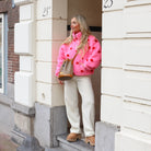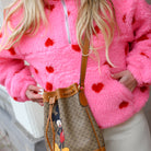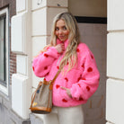 Deze Teddy Pullover is een lieve en heerlijk warme toevoeging aan je casual collectie. De trui is gemaakt van een zachte, krullende teddy-stof en is voorzien van een speels, ingebreid hartjespatroon in contrasterende kleuren.