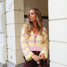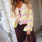 Dit vest met een uniek geel en roze golvend patroon is een echte eyecatcher. Het is gemaakt van een zachte, gebreide stof, heeft een V-hals en een striksluiting aan de voorkant. Combineer dit vest met een high-waisted jeans en een basic top voor een trendy en vrolijke outfit.