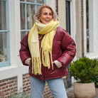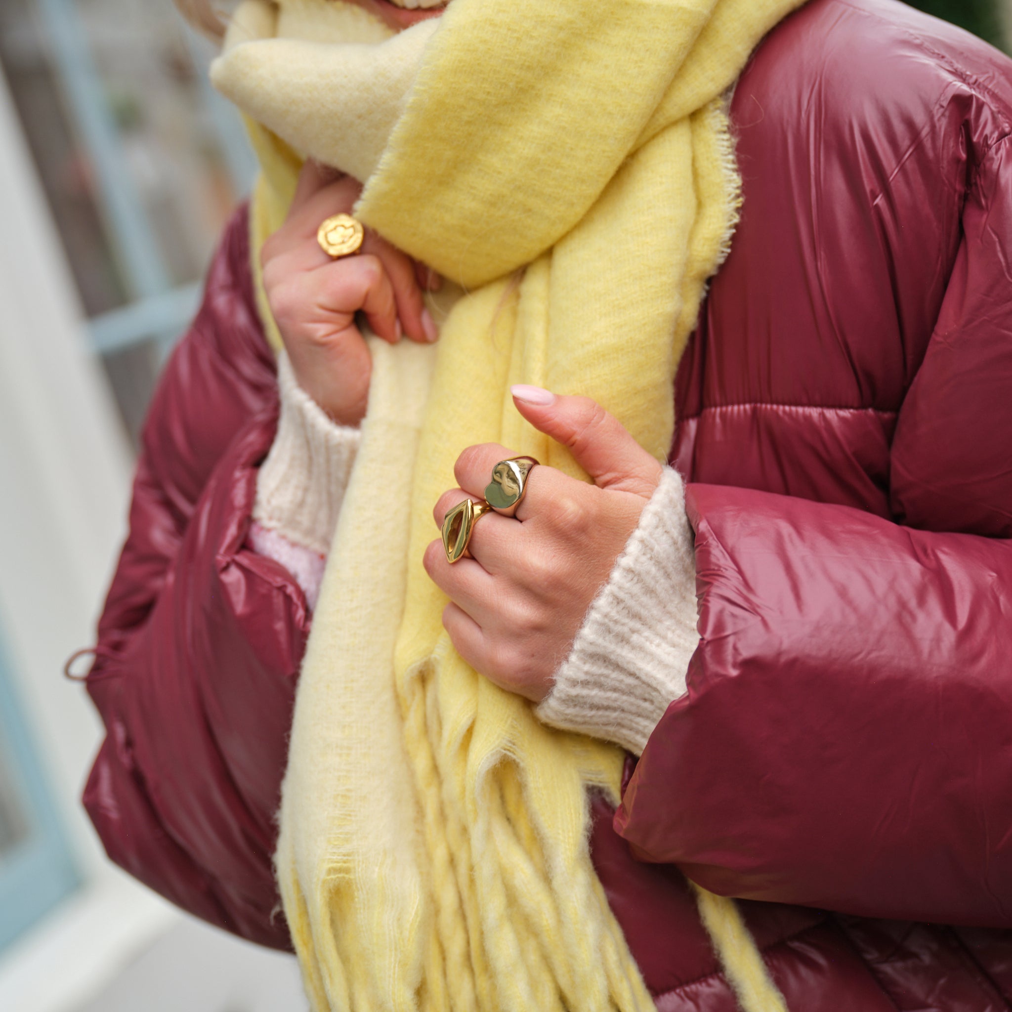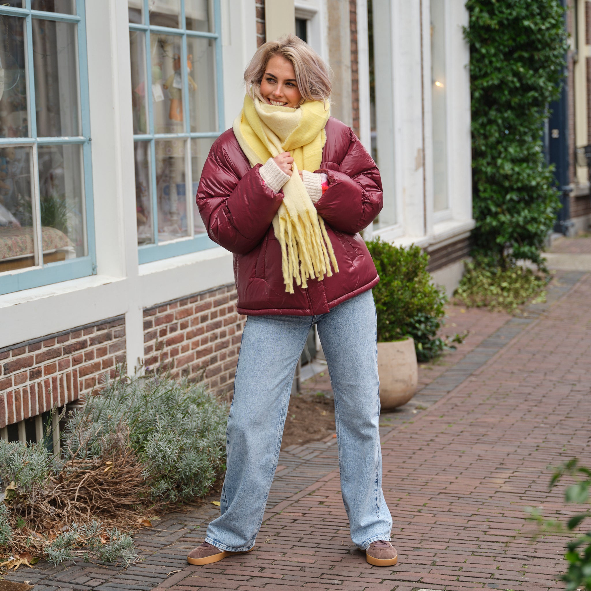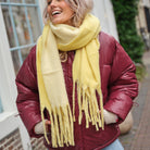 Deze heerlijk zachte sjaal in een subtiele gele kleur is het perfecte accessoire om je warm te houden en je outfit een zachte, vrouwelijke touch te geven. De sjaal heeft een fijne, gebreide textuur en is afgewerkt met speelse franjes aan de uiteinden. Dankzij de royale afmetingen kun je de sjaal op verschillende manieren dragen: losjes over de schouders, of comfortabel om de nek gewikkeld.