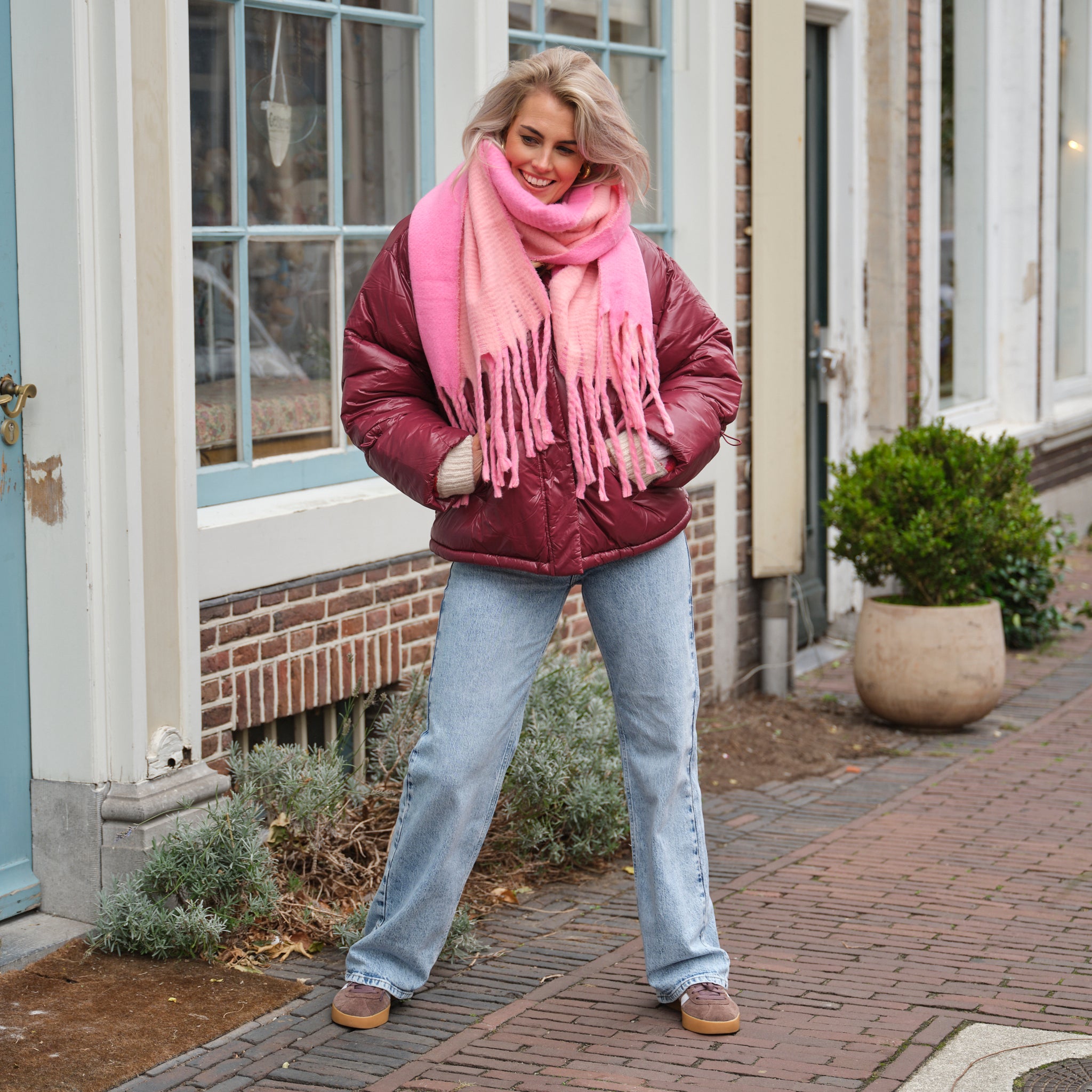Deze heerlijk zachte sjaal in een subtiele lichtroze kleur is het perfecte accessoire om je warm te houden en je outfit een zachte, vrouwelijke touch te geven. De sjaal heeft een fijne, gebreide textuur en is afgewerkt met speelse franjes aan de uiteinden. Dankzij de royale afmetingen kun je de sjaal op verschillende manieren dragen: losjes over de schouders, of comfortabel om de nek gewikkeld.