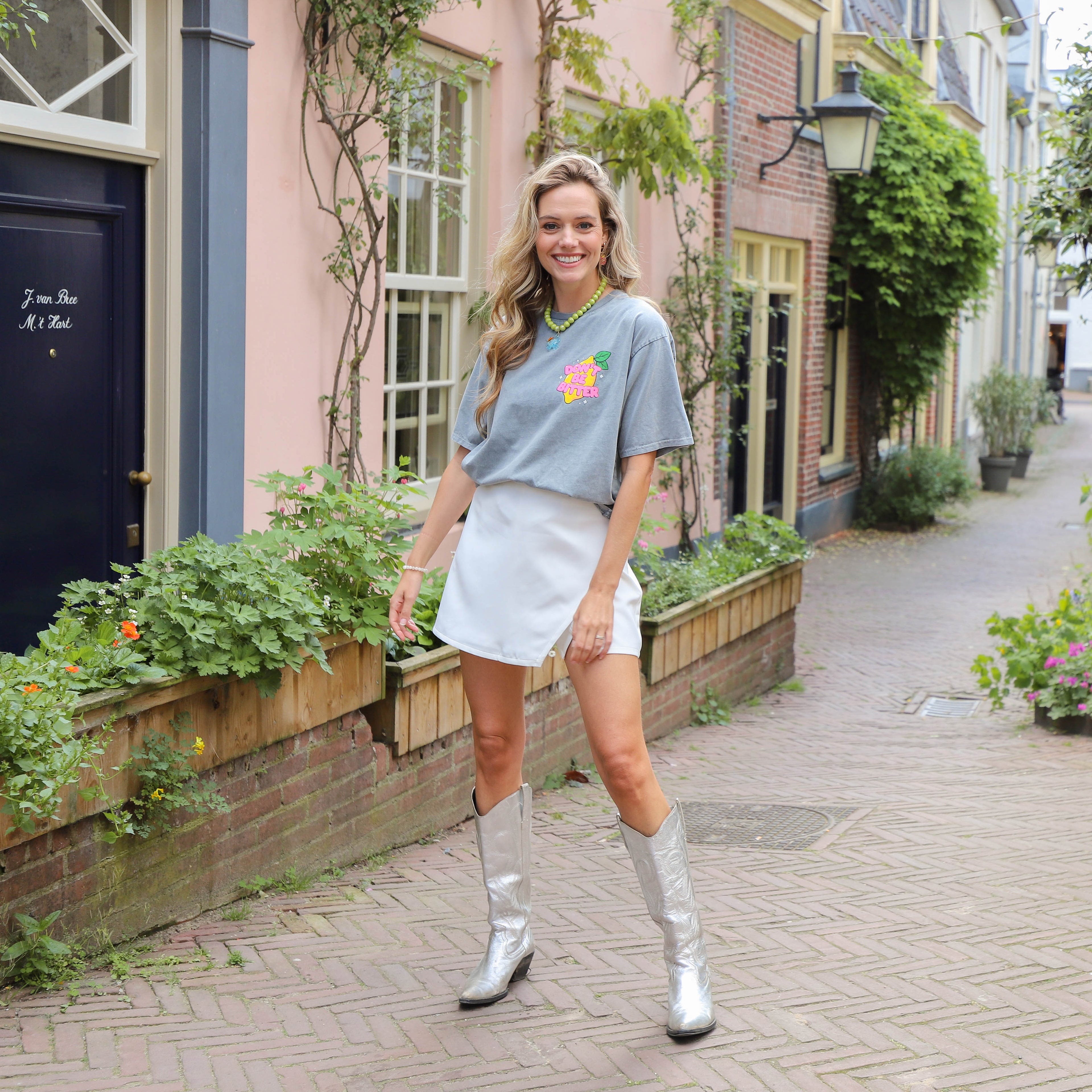 • Model: Ons model is 172 cm lang en draagt one size.