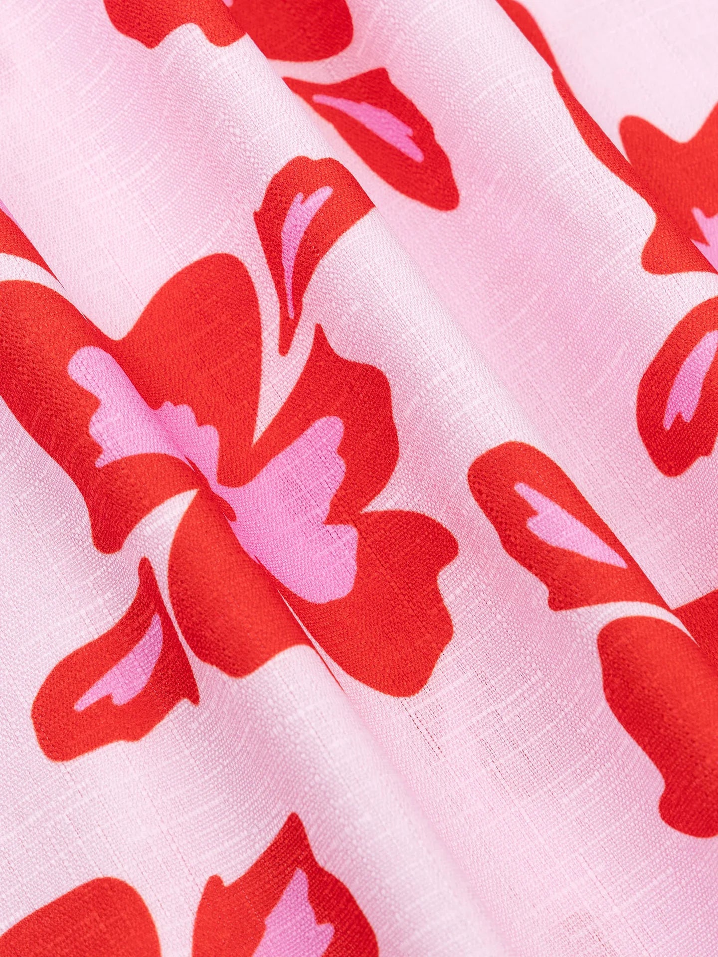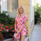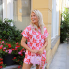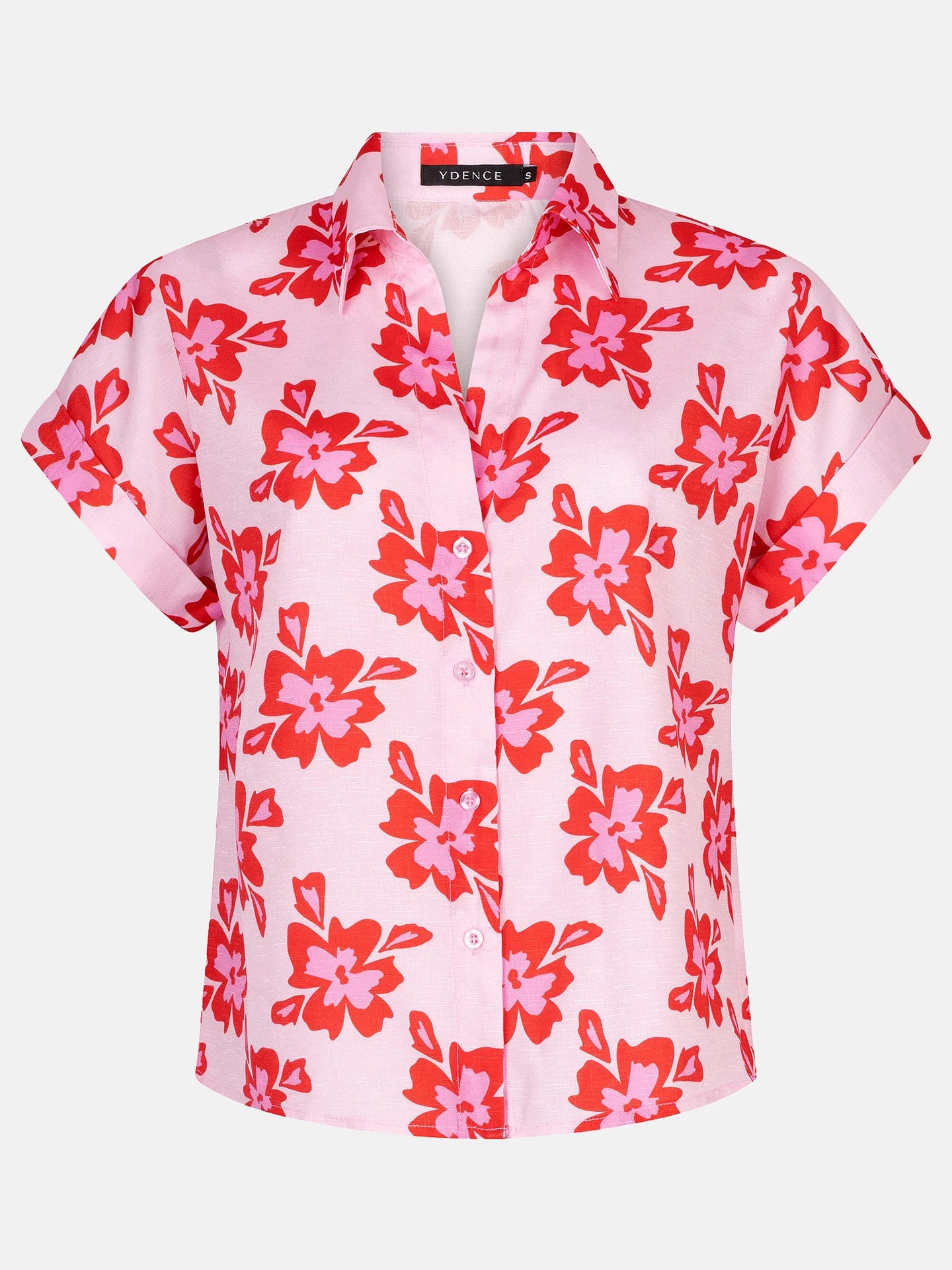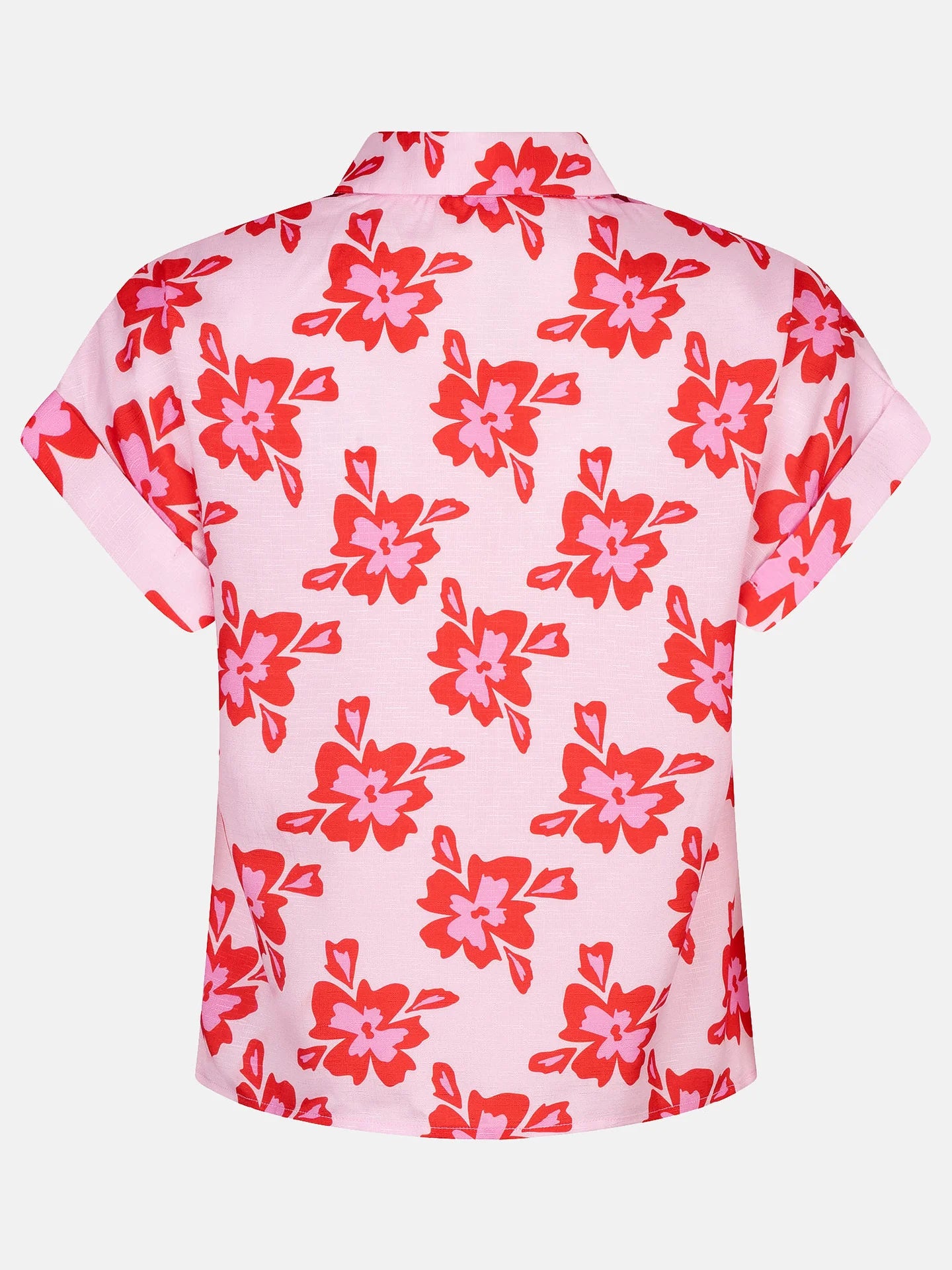 Blouse Tina is een leuke blouse met print en heeft een korte mouw met omslag. De blouse heeft een V-hals met kraagje, boxy pasvorm en sluit met een knoopsluiting aan de voorzijde. De lengte van blouse Tina is 60 cm bij een maat S.