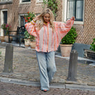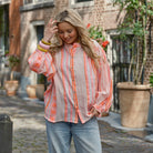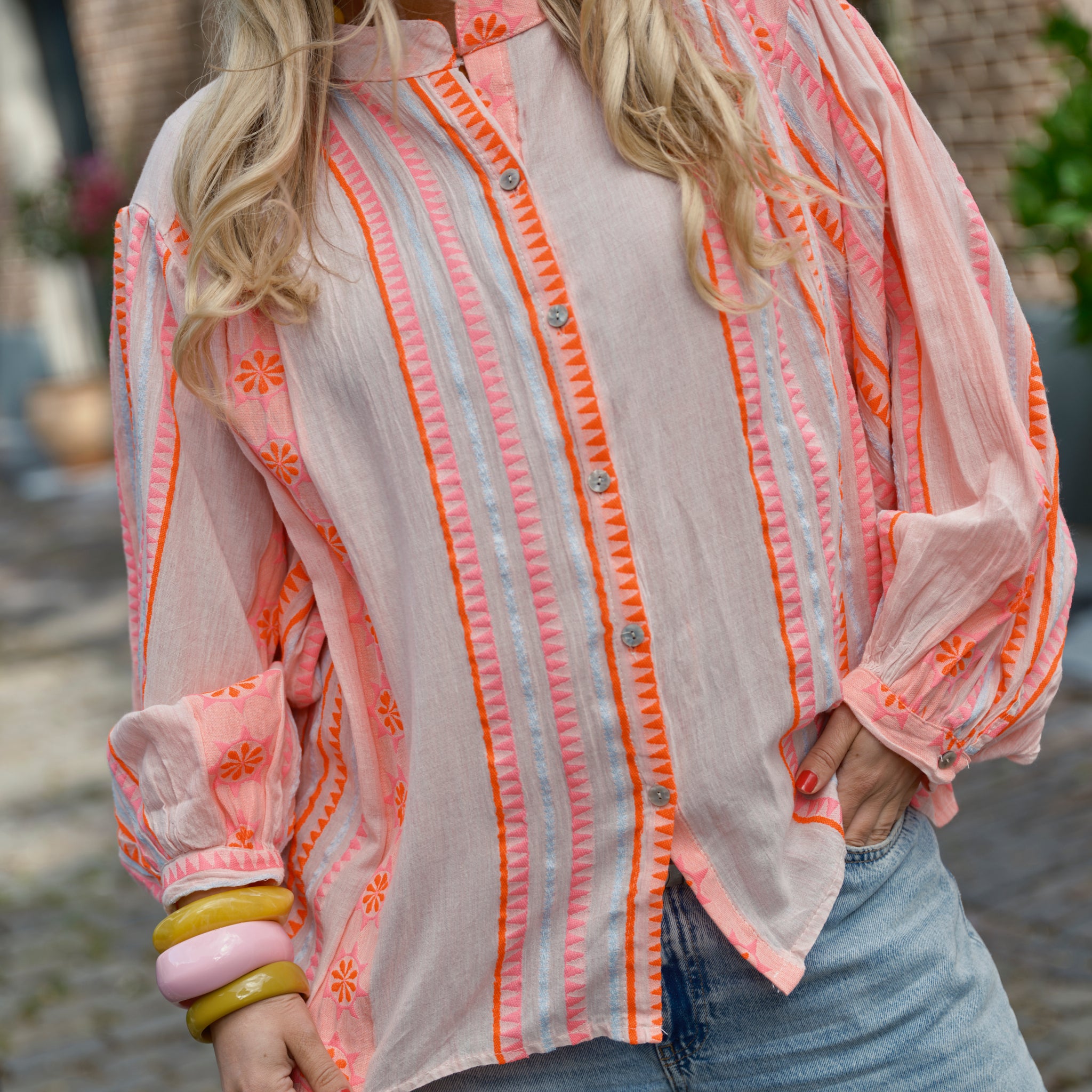 Deze prachtige blouse is een ware eyecatcher, perfect voor een stijlvolle en comfortabele look. De handgemaakte borduursels in levendige roze tinten en andere accentkleuren geven de blouse een uniek en artistiek karakter. Met lange mouwen en een losvallende pasvorm is deze blouse ideaal voor diverse gelegenheden, van casual tot meer gekleed.