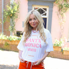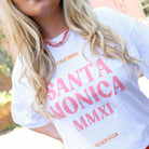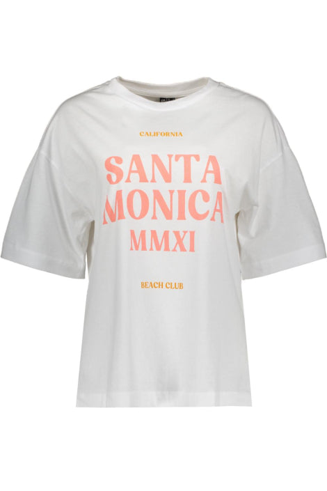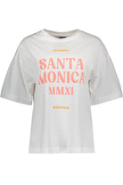 Breng de laid-back sfeer van de West Coast in je garderobe met dit witte T-shirt met korte mouwen. De opvallende oranje print toont de tekst "CALIFORNIA SANTA MONICA MMXXI BEACH CLUB". De comfortabele pasvorm en de zachte stof maken dit shirt perfect voor een casual en zonnige look.
