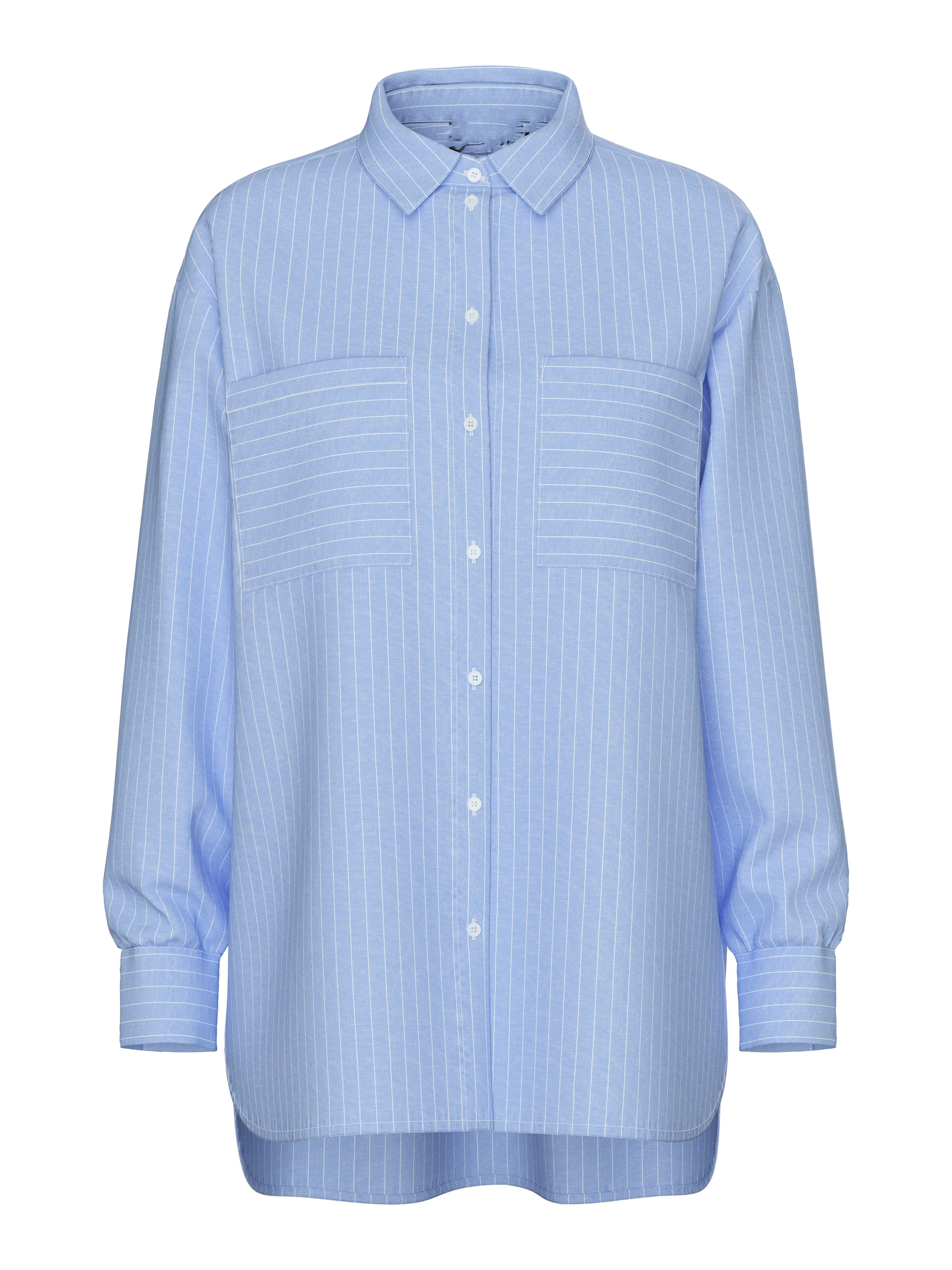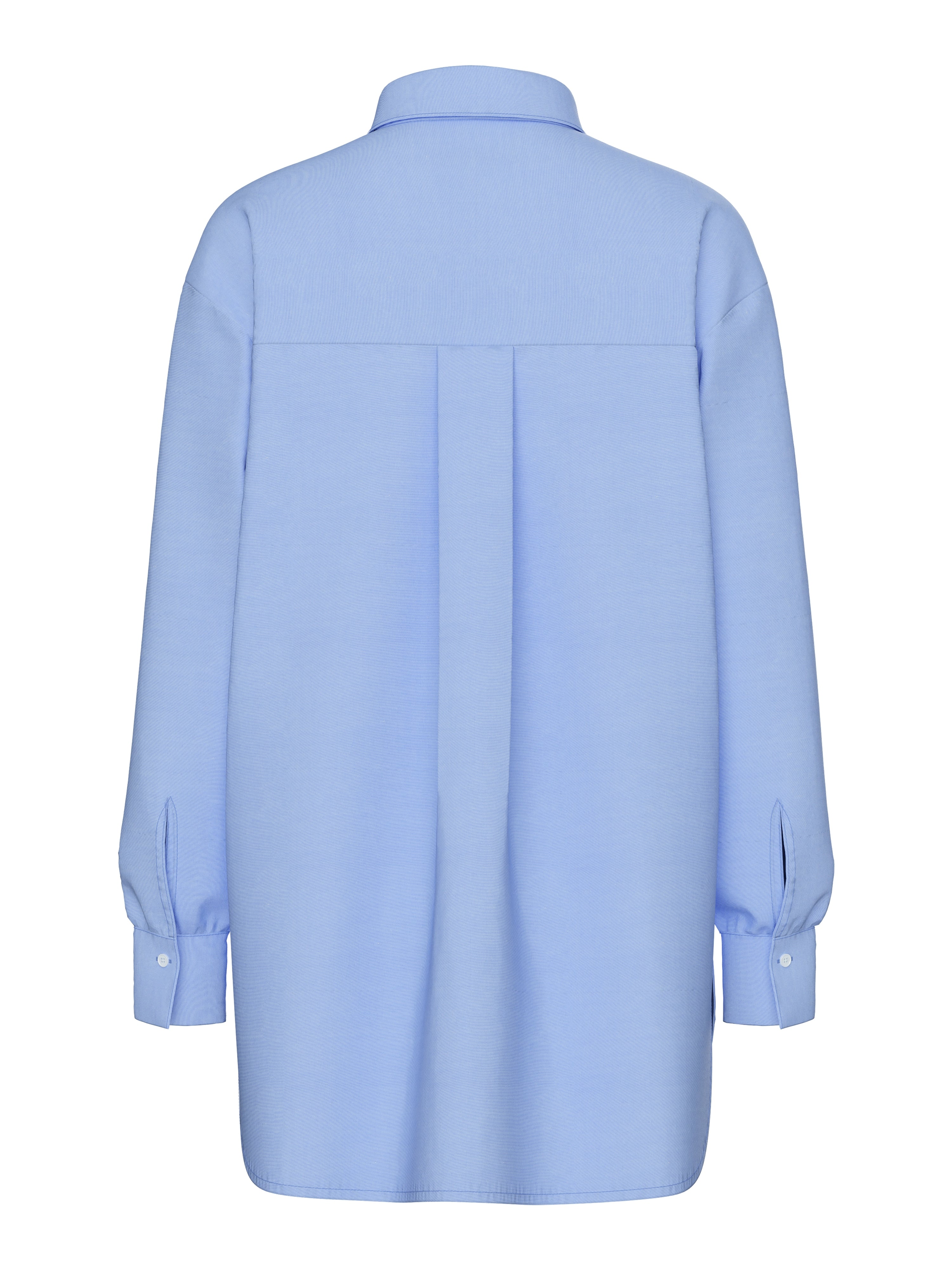 Wunderschöne Oversize-Bluse in Hellblau. Die Bluse hat ein langes Modell, wird mit Knöpfen geschlossen und sieht toll zu Jeans aus.