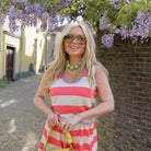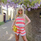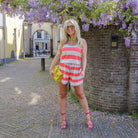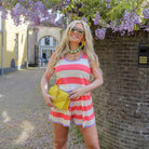 Deze vrolijke gestreepte set in oranje tinten is een zonnige toevoeging aan je garderobe! De top heeft een speels gestreept design in oranje en ecru, afgewerkt met een subtiel lila randje langs de hals en armsgaten. Het bijpassende shortje maakt de set compleet voor een comfortabele en trendy look.
