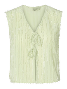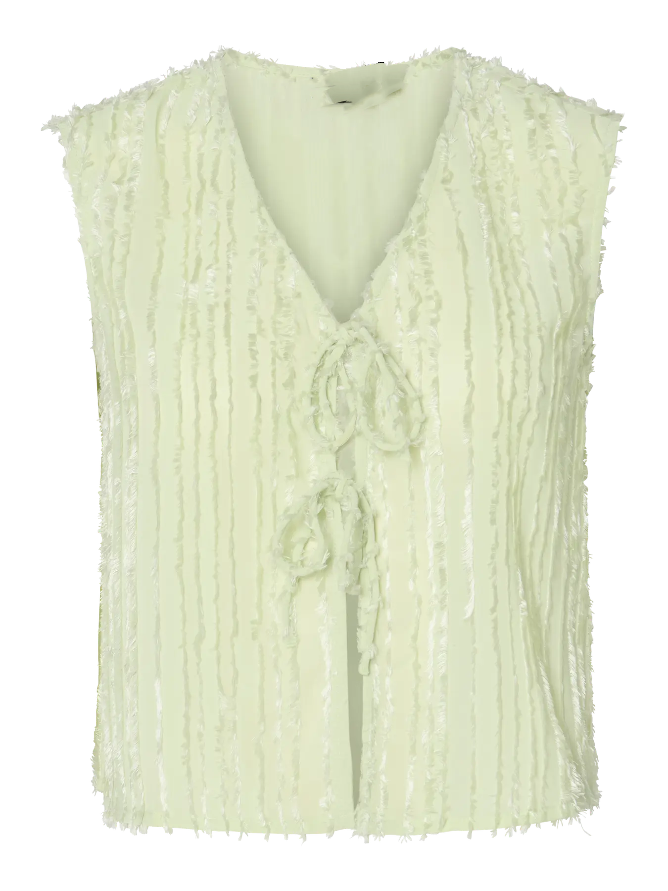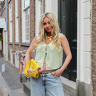 Deze zachte, lichtgele top met een subtiele textuur is een charmante toevoeging aan je zomergarderobe. De top heeft een V-hals en een speelse strikdetail aan de voorkant. De mouwloze stijl maakt hem perfect voor warme dagen. Combineer hem met een short, rok of jeans voor een casual-chique look.