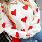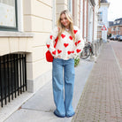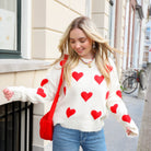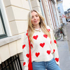 Wunderschöner ecrufarbener Pullover mit roten Herzen. Der Pullover ist übergroß und hat einen Rundhalsausschnitt. Kombinieren Sie es mit Jeans.