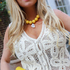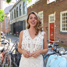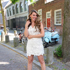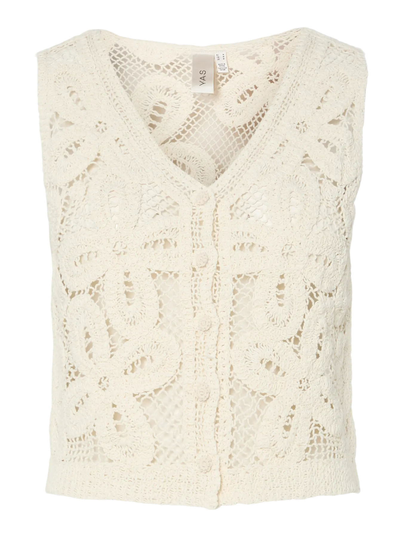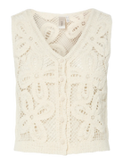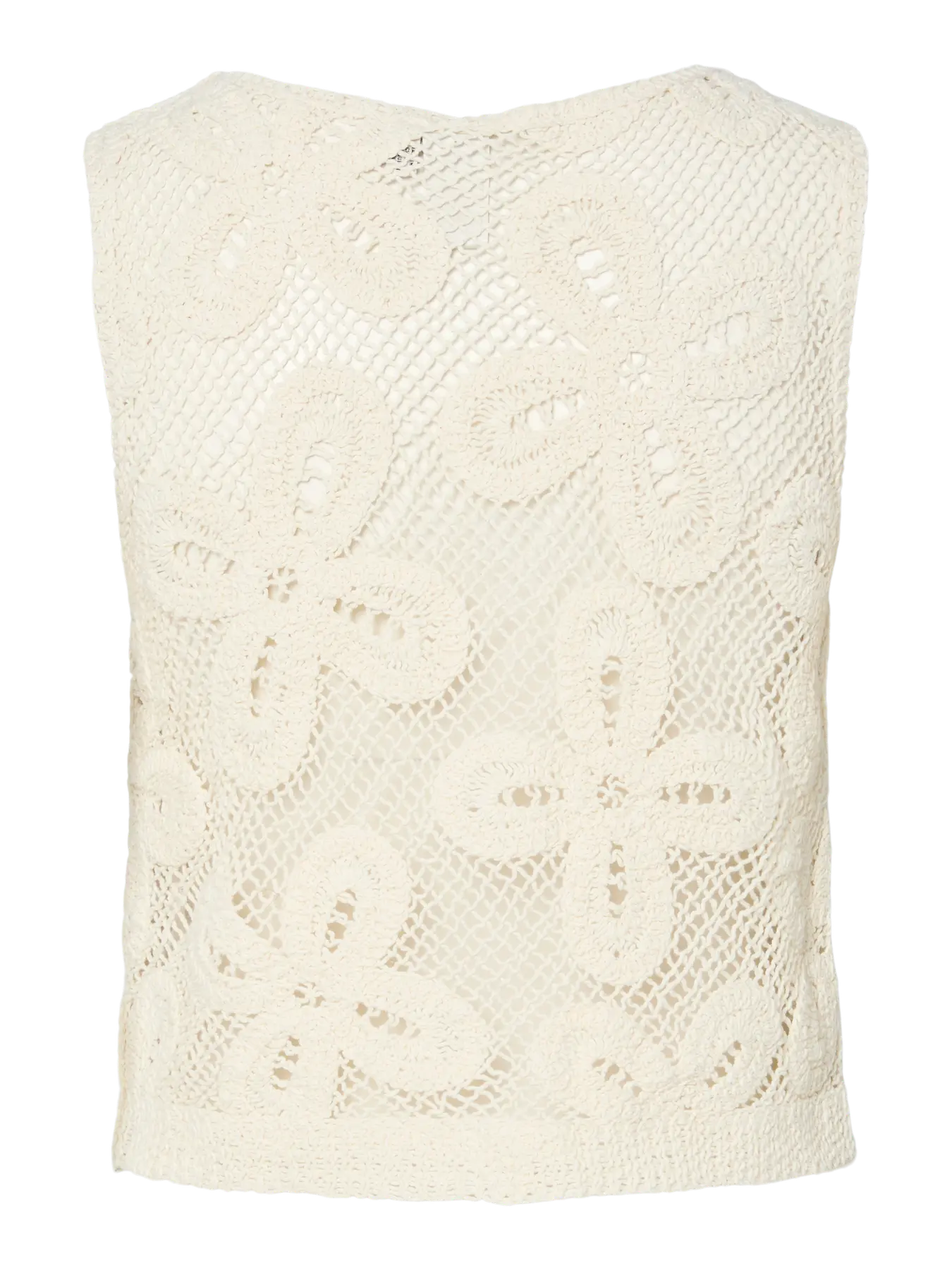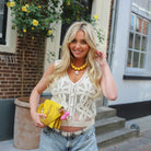 Deze prachtige, gehaakte top met een verfijnd dessin is een echte blikvanger! De open structuur geeft een zomers en elegant gevoel. De top sluit met knoopjes aan de voorkant. Perfect om te combineren met een high-waisted broek, een rok of over een basic top voor een gelaagde look.