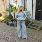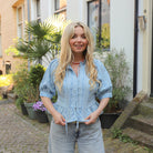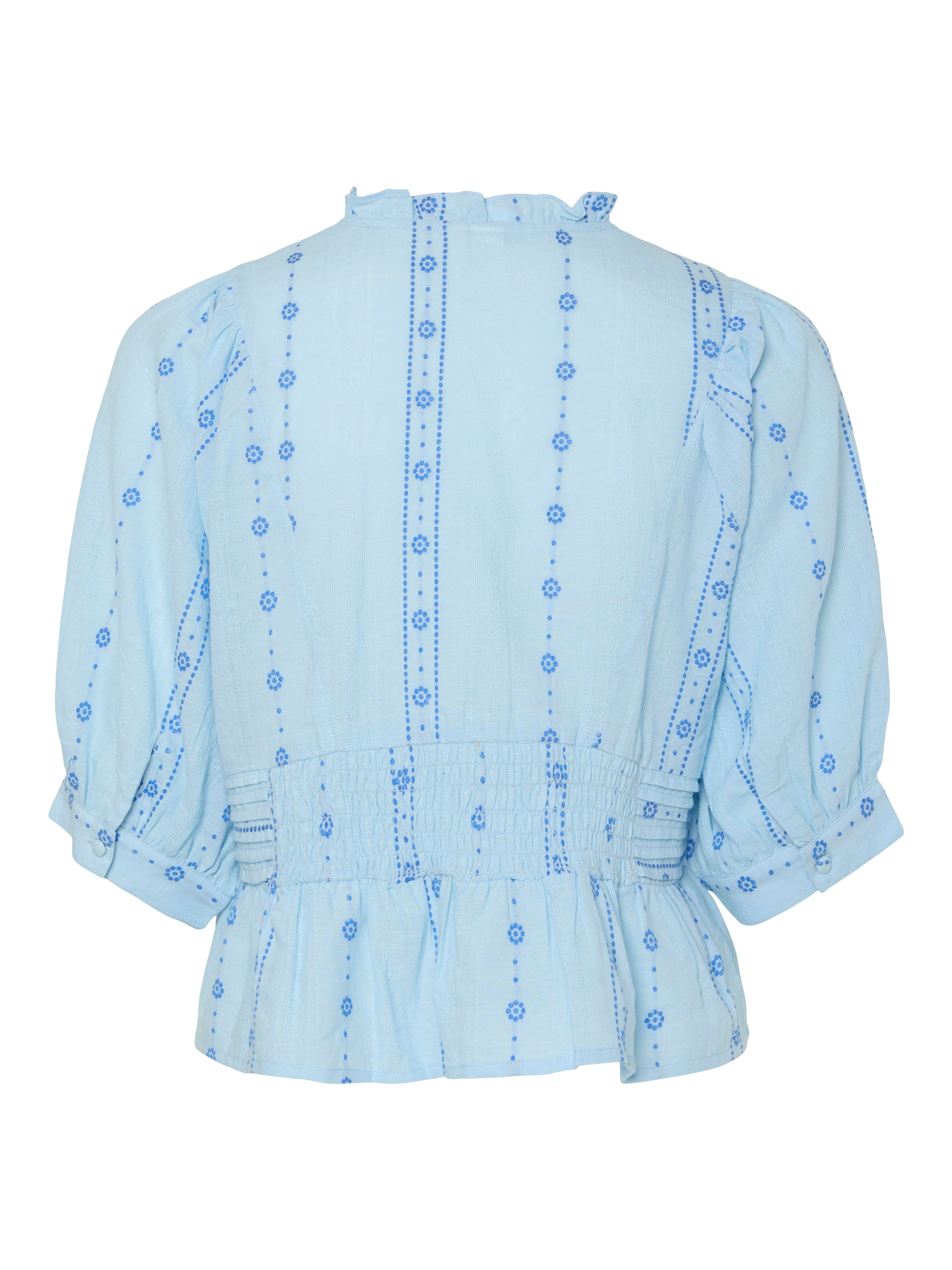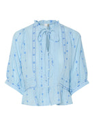 Droom weg in deze romantische lichtblauwe top met een subtiel ingeweven dessin. De top heeft korte, gepofte mouwen en een elegante V-hals die je naar wens kunt strikken. De verfijnde details, zoals de ruches en de knoopsluiting aan de voorkant, maken deze top helemaal af.