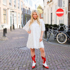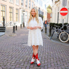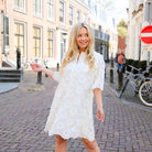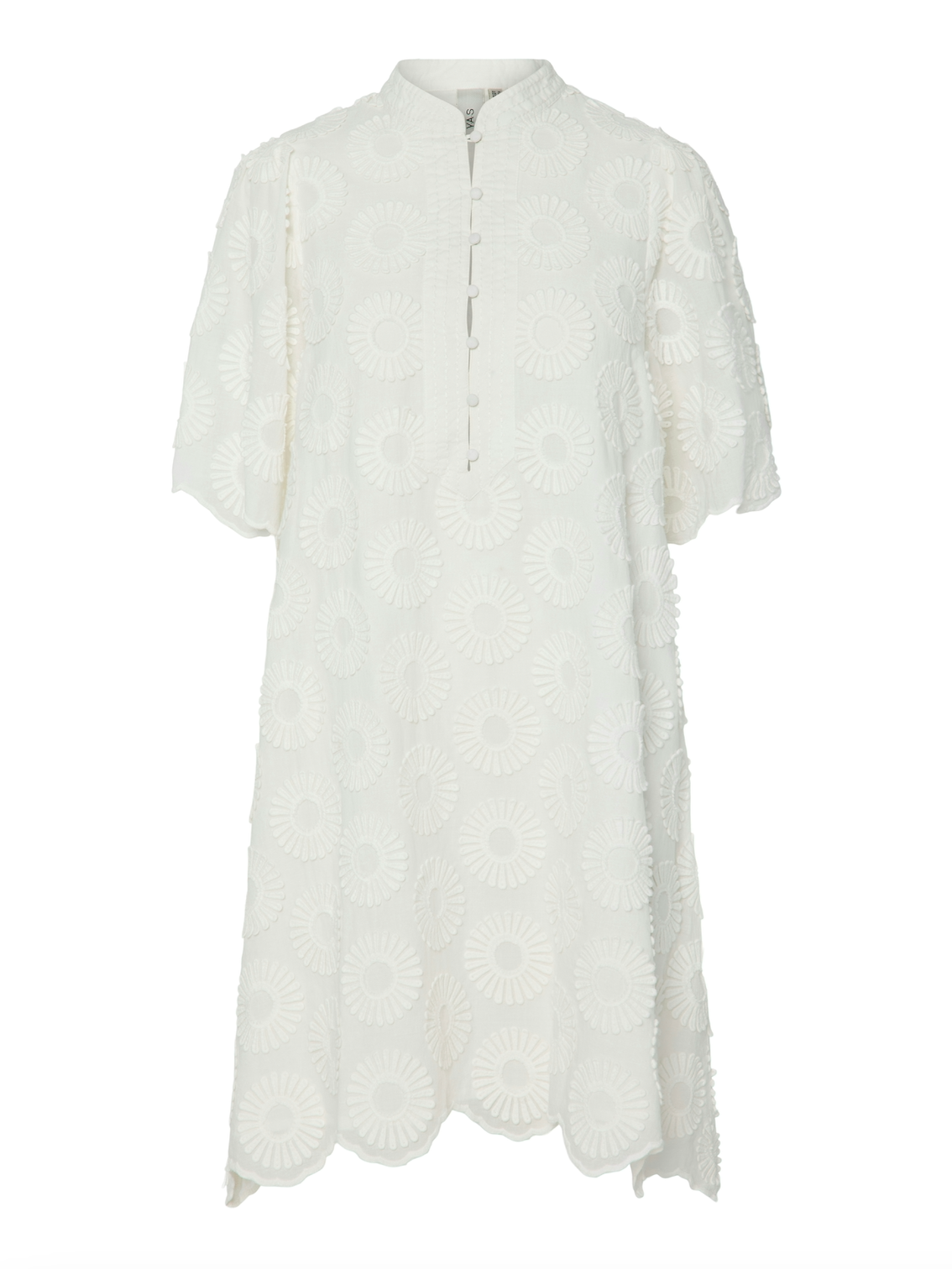 Betoverend en zomers! Deze witte jurk met driekwart mouwen is prachtig bewerkt met een all-over bloemenpatroon in broderie. De jurk heeft een losvallende pasvorm en een elegante V-hals met een subtiele knoopsluiting.