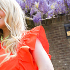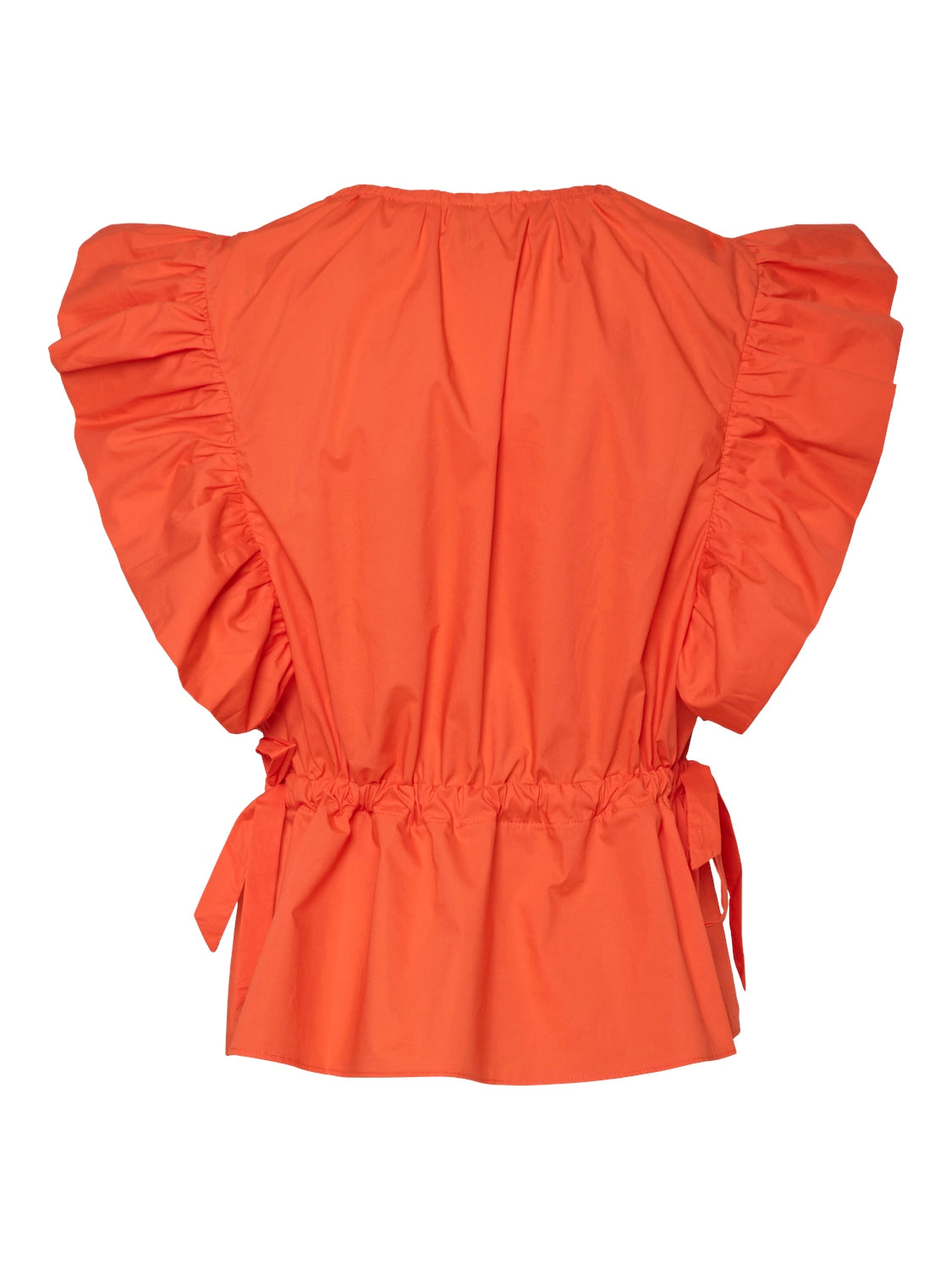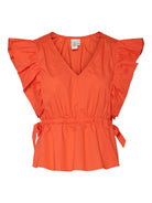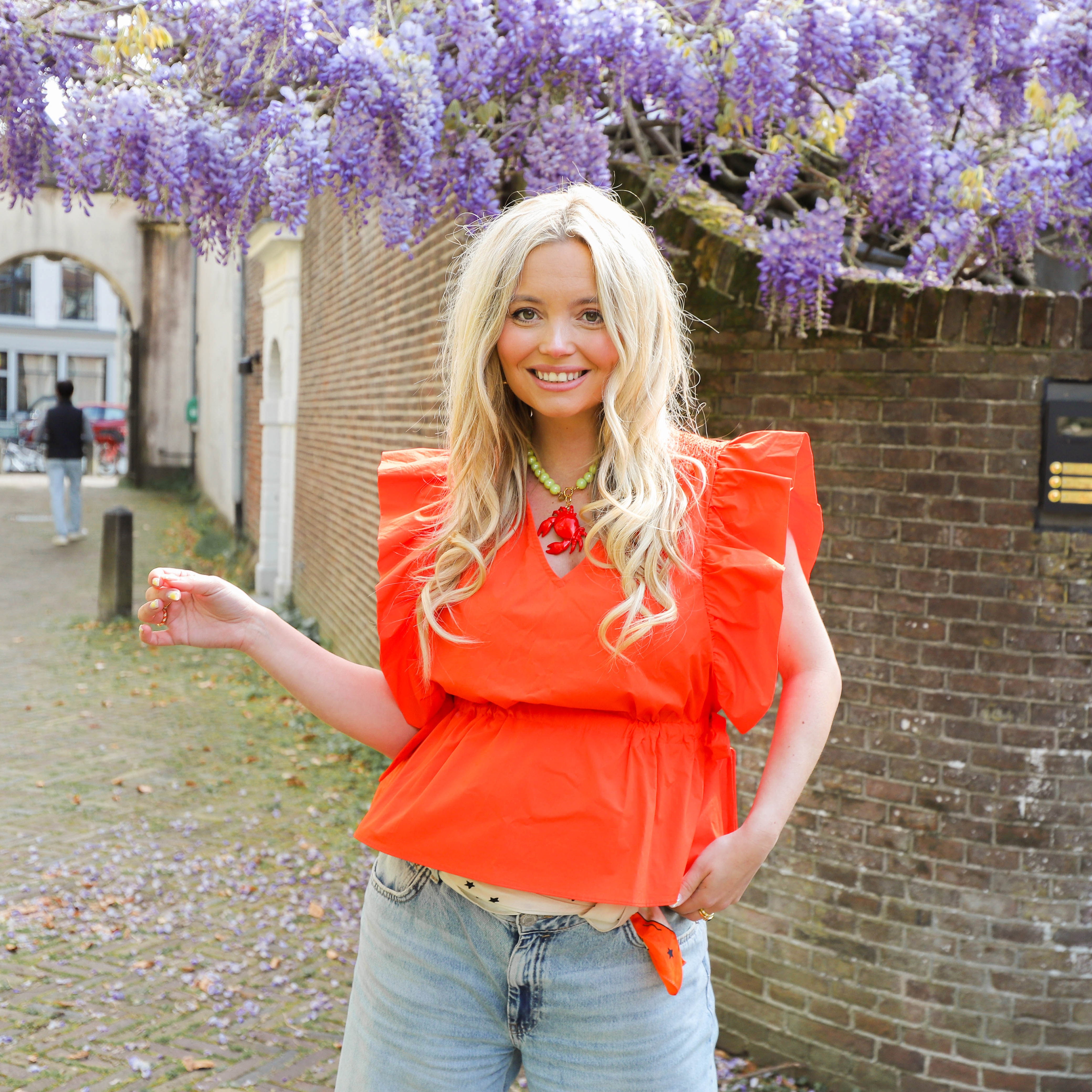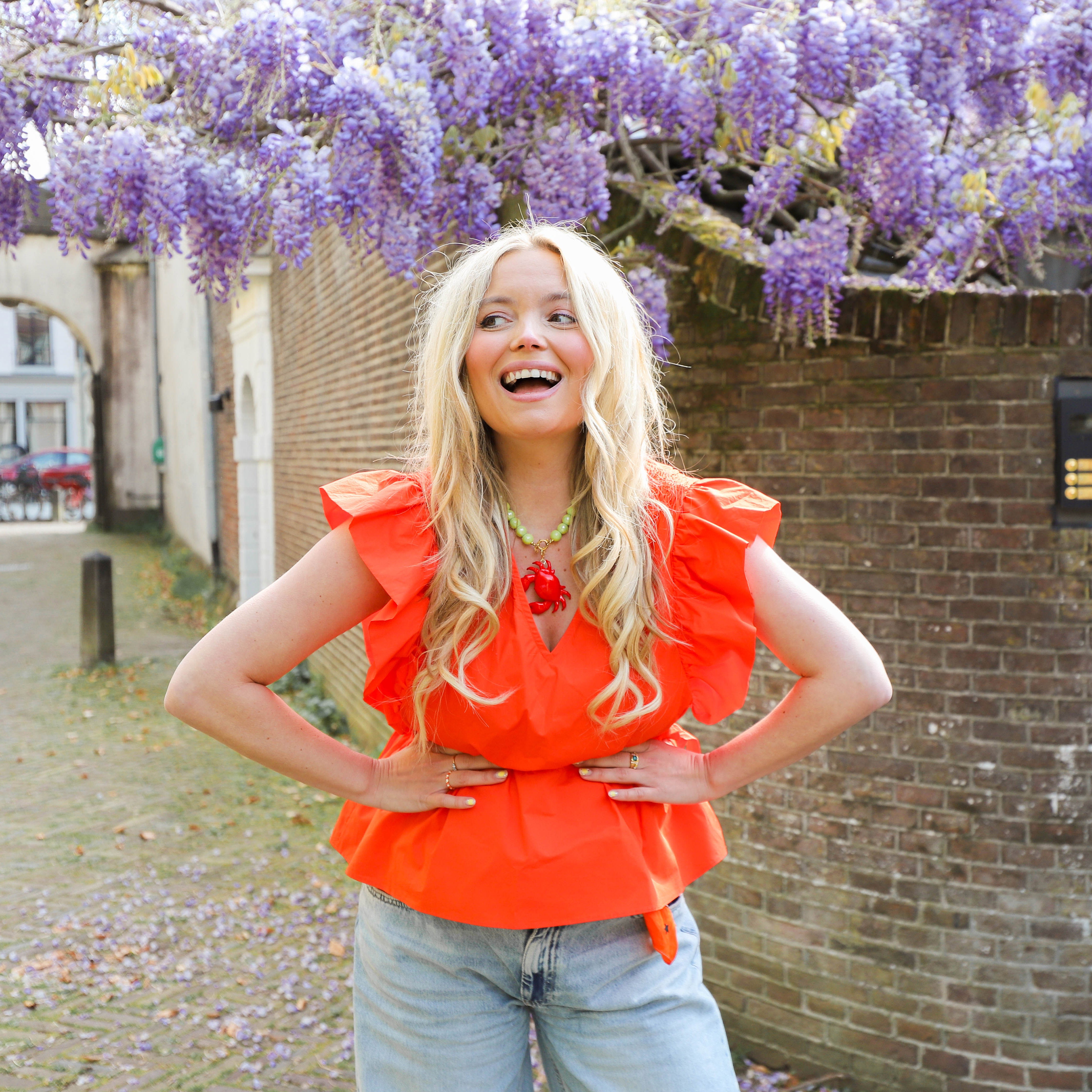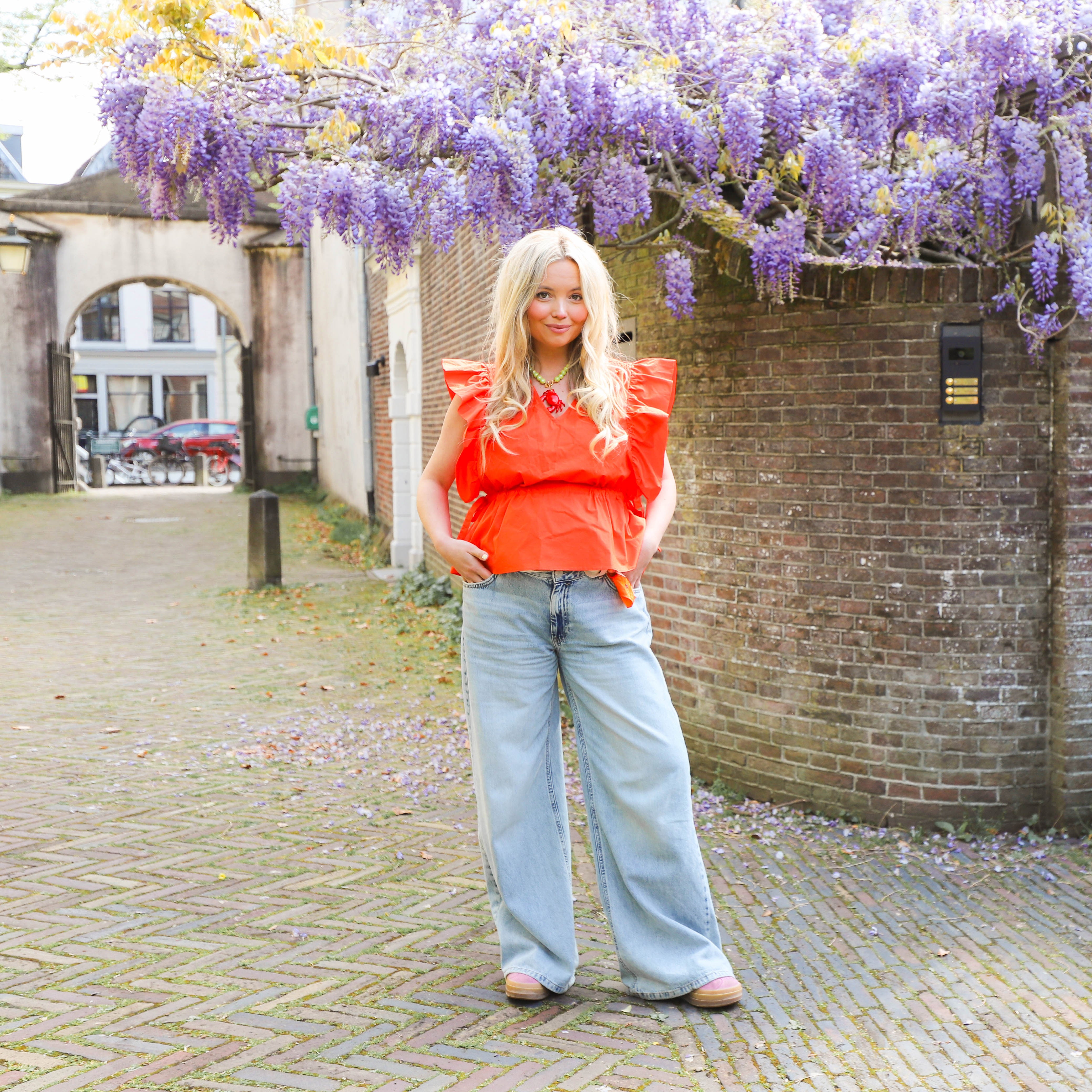 Voeg een vleugje romantiek toe aan je outfit met deze oranje top met korte, zwierige mouwen. De top heeft een elegante V-hals en een speels detail met de touwtjes aan de zijkanten. Gemaakt van 100% katoen voor een heerlijk comfort.