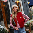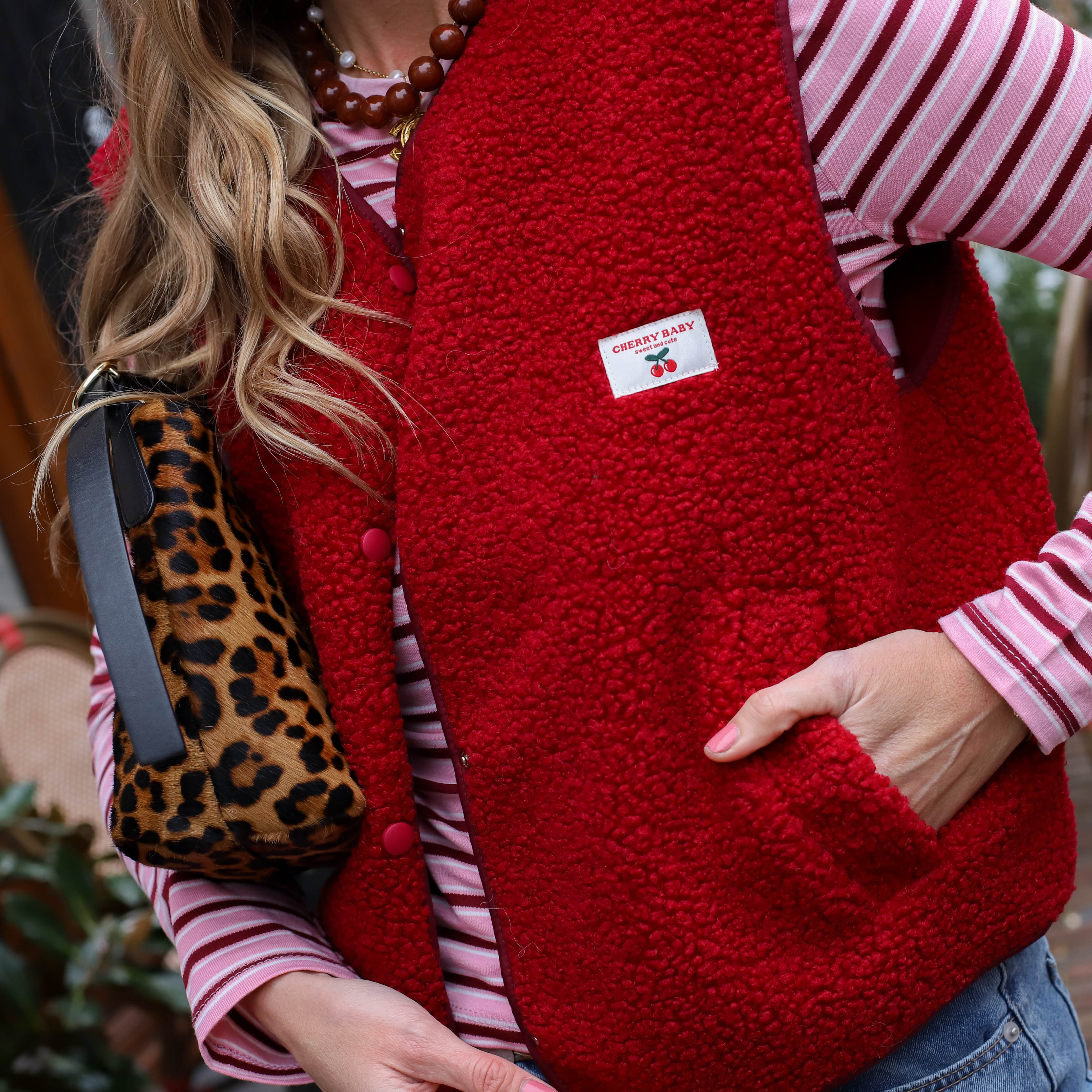 Dit Gilet Cherry Baby is een echte eyecatcher die je outfit direct een vrolijke touch geeft. De bodywarmer heeft een zachte teddy-structuur en is voorzien van een subtiele "Cherry Baby" patch op de borst. Dankzij de drukknoopjes en de relaxte fit is dit het ideale item om te layeren over een sweater of een oversized shirt voor een on-trend look.