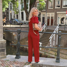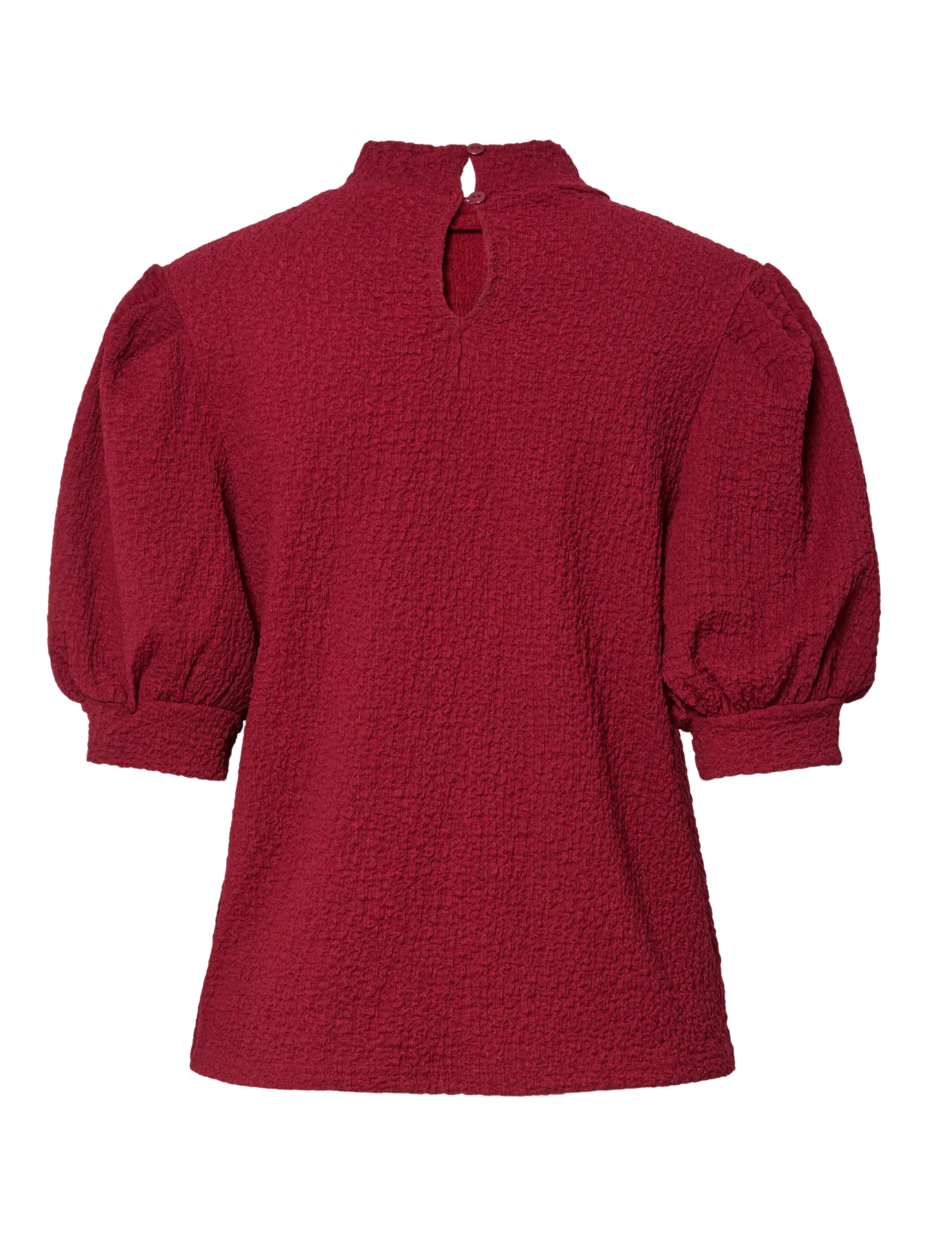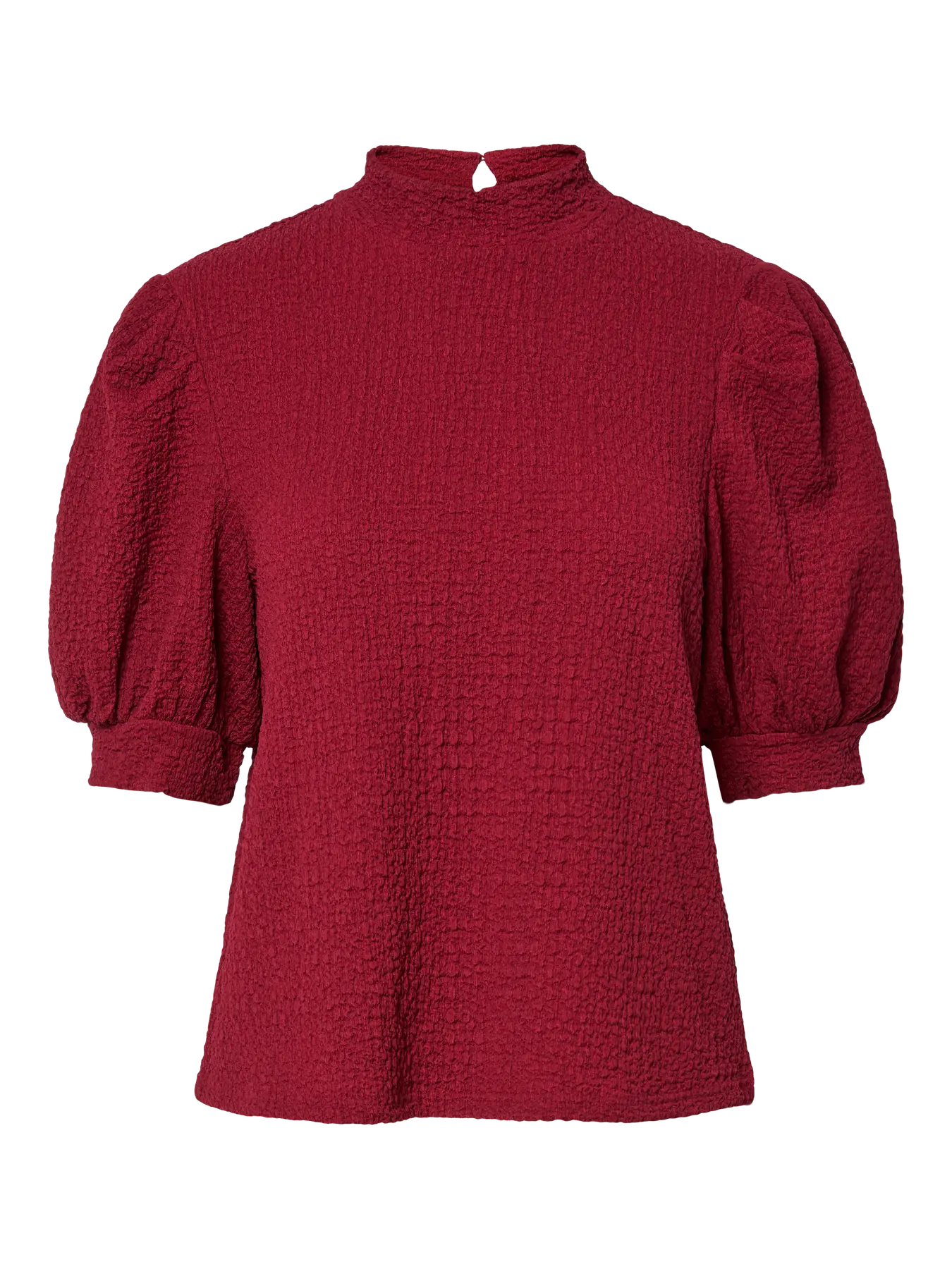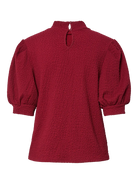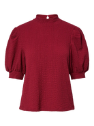 Een prachtige top in een klassieke rode kleur. De top heeft een opvallend gestructureerd ontwerp met een hoge hals en korte pofmouwen. Het aansluitende model en de rekbare stof zorgen voor een perfecte pasvorm.
