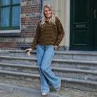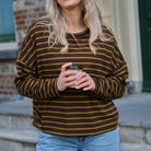 Deze Streep Top is een cropped essential die comfort en stijl moeiteloos combineert. De top heeft een tijdloos horizontaal streepdessin in een warme combinatie van donkerbruin en oker. De wijde, oversized pasvorm, de ronde hals en de cropped lengte maken deze trui perfect om te combineren met een high-waist jeans.