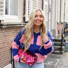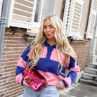 Deze Polo Trui is een zachte en trendy gebreide trui. De trui heeft opvallende horizontale strepen in roze en blauw en is voorzien van een klassieke polokraag met knoopsluiting. De ruime, cropped pasvorm met verlaagde schoudernaden maakt dit een comfortabel en stijlvol item.