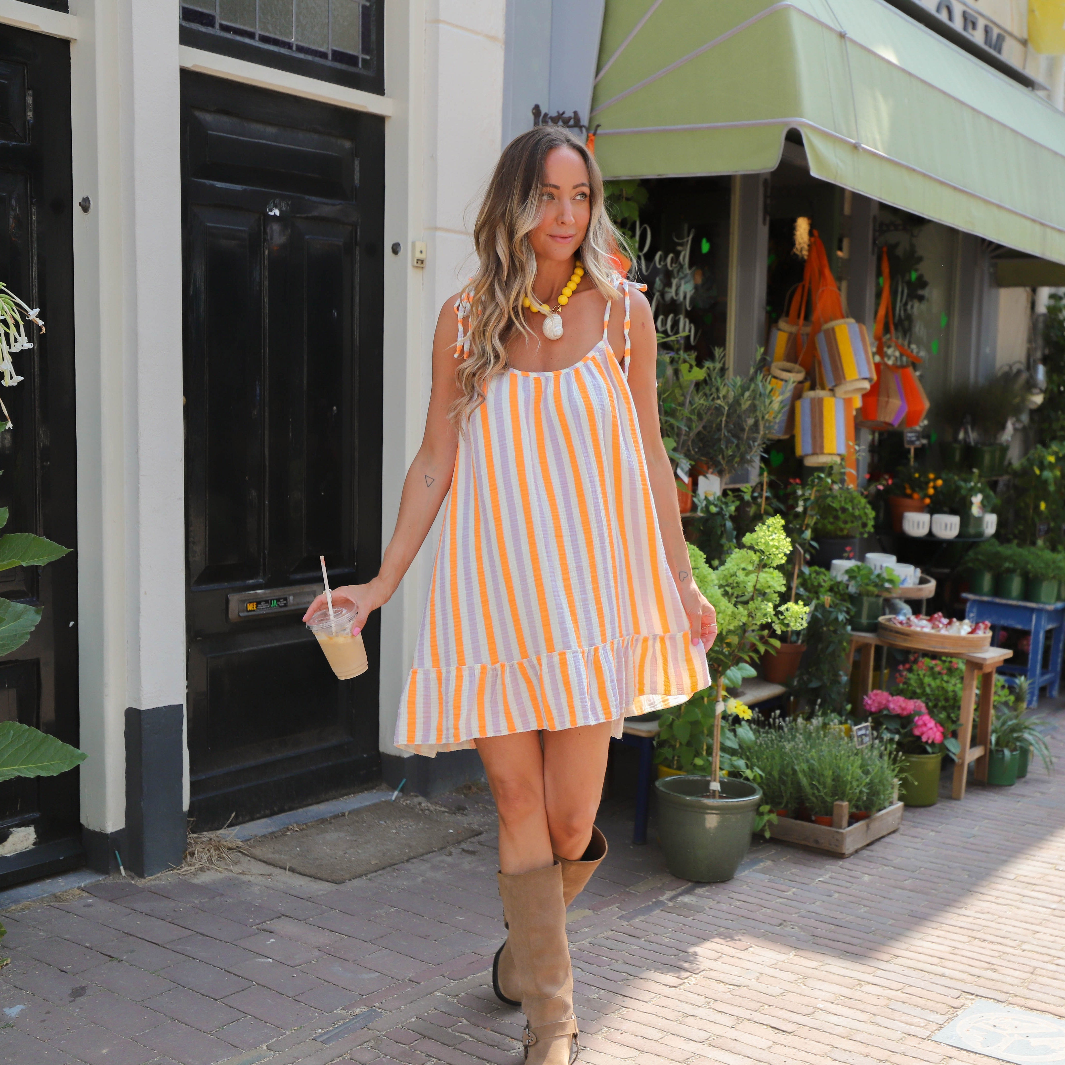 Dit zomerse 'Jurk mousseline lila oranje' is een vrolijke en luchtige jurk, perfect voor warme dagen. De jurk heeft een gestreept patroon in oranje, wit en lila, en is gemaakt van een licht kreukelige mousseline stof. De spaghettibandjes zijn te strikken op de schouders, en de onderkant van de jurk is voorzien van een speelse ruche.