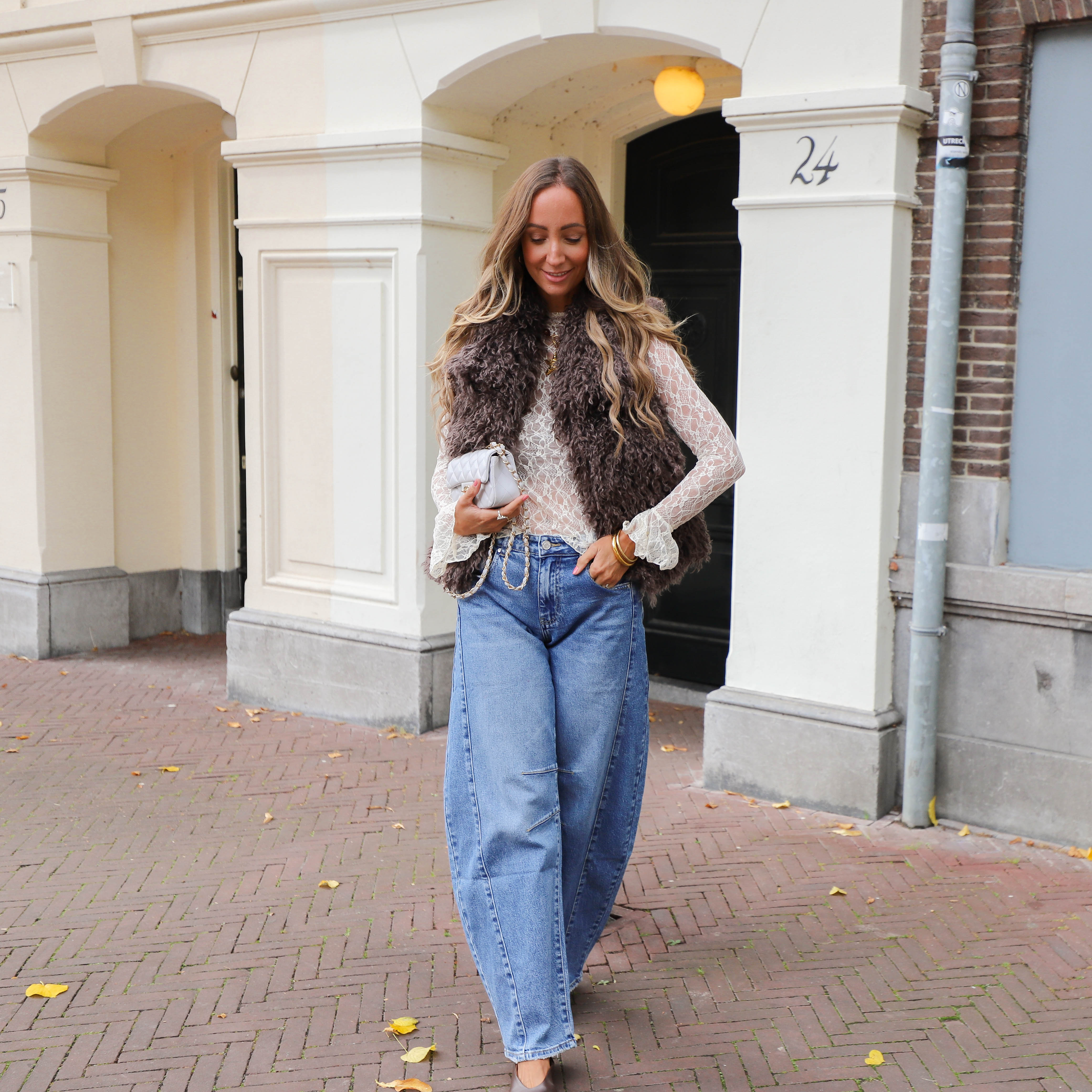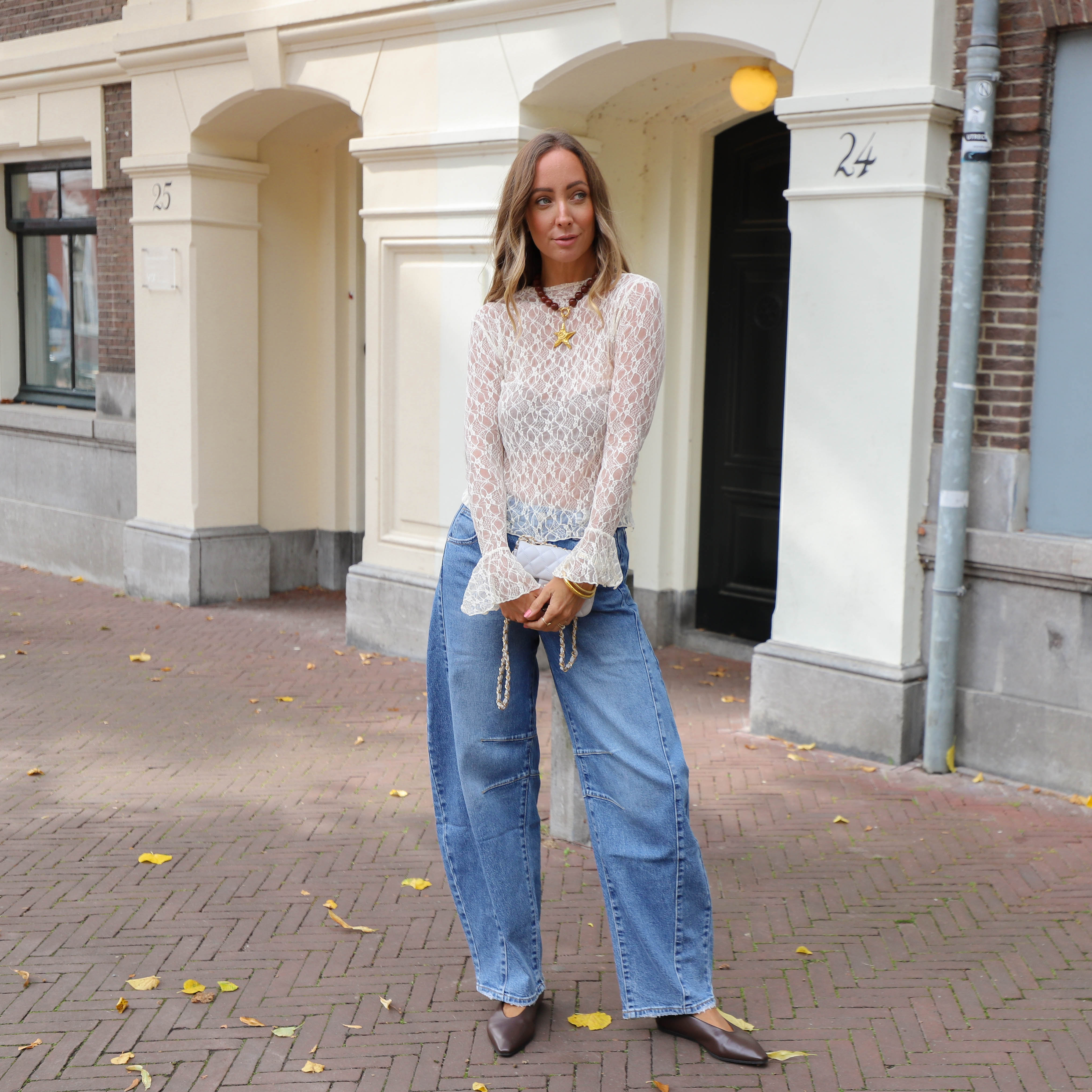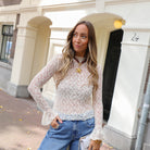 Geef je outfit een romantische en trendy twist met deze prachtige ecru kanten top. De top heeft een aansluitend model en is gemaakt van een semi-transparante kanten stof met een uniek patroon. De top heeft lange mouwen met een leuke uitlopende rand, wat zorgt voor een elegante look.
