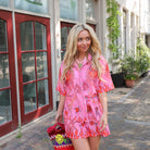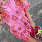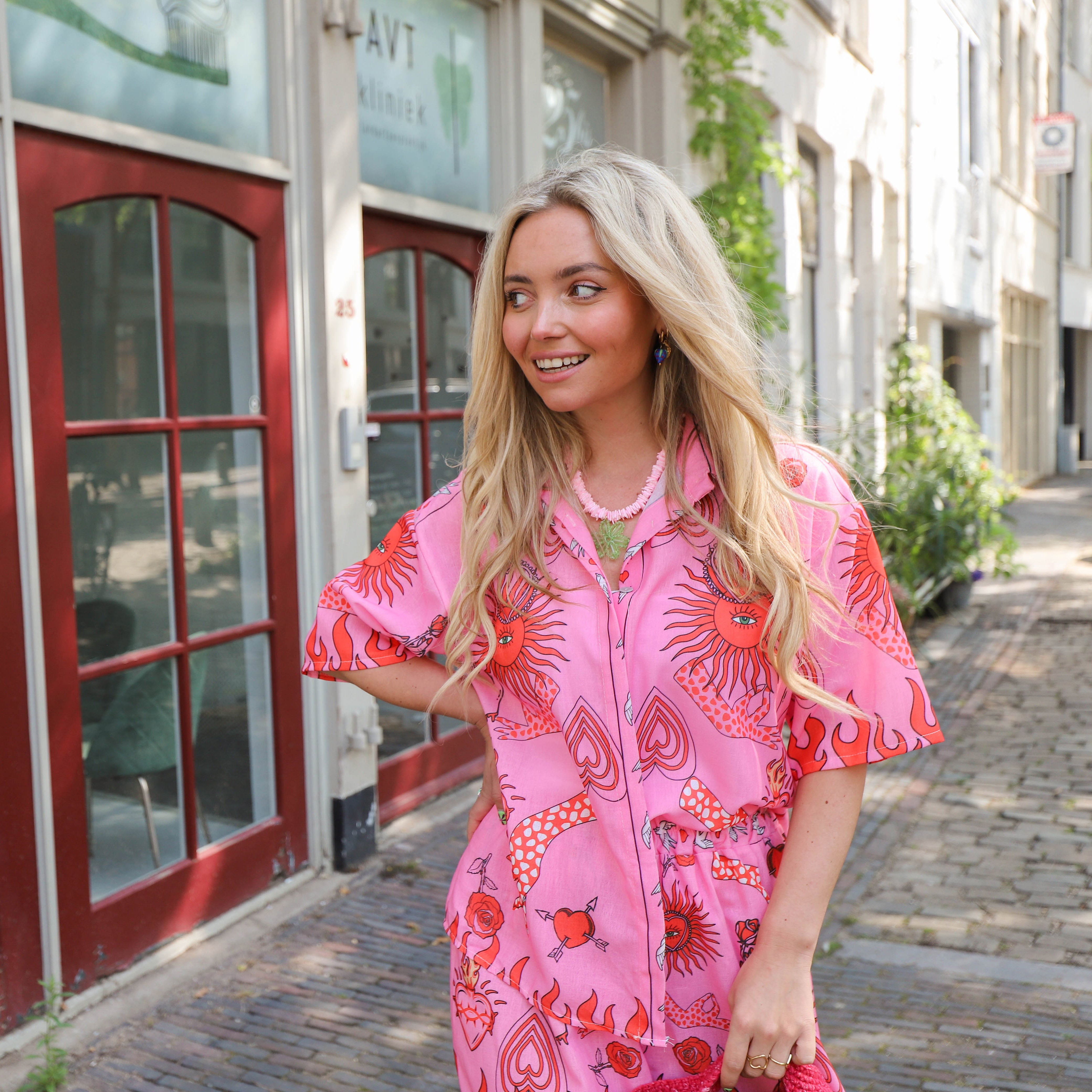 Mooie kleurrijke two piece met een vrolijke print. Het setje bestaat uit een blouse en een short. Het shortje heeft een elastische tailleband, waardoor hij altijd mooi aangesloten zit. Maak het af met een leuke tas.