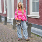 Deze Streep Knit is een vrolijke en opvallende eyecatcher, perfect voor de koudere dagen. De trui heeft een grof gebreide, pluizige textuur en een opvallend horizontaal streepdessin in diverse roze tinten en contrasterend oranje.