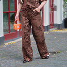 Deze Paillet Broek is een glamoureuze en comfortabele toevoeging aan je feestelijke garderobe. De broek is gemaakt van een fijn, bruin breisel en is volledig bedekt met glanzende bruine en koperkleurige pailletten, wat zorgt voor een rijke en sprankelende look.
