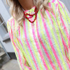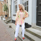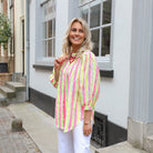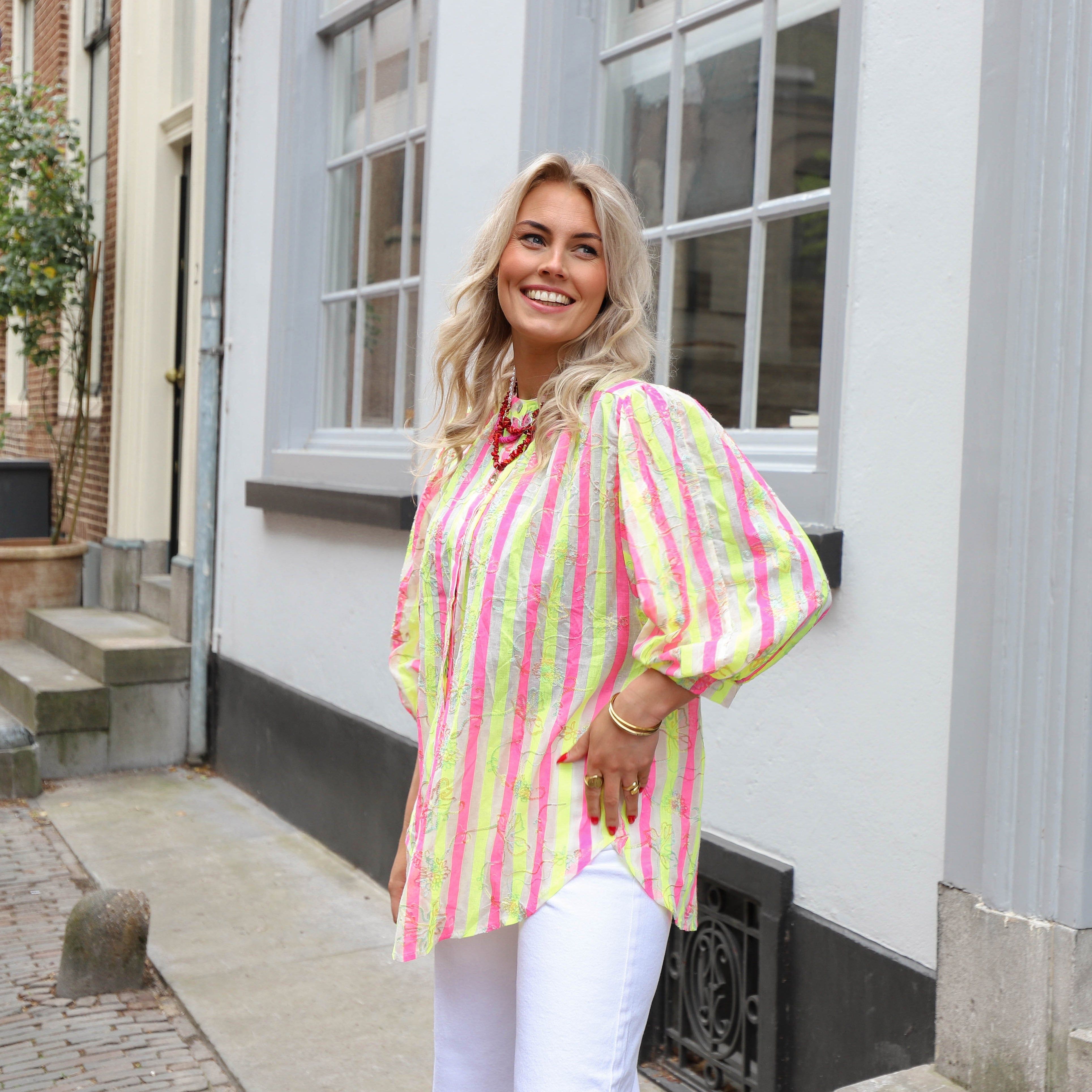 Sunshine on repeat met deze vrolijke gestreepte blouse. De blouse heeft een borduur patroontje van bloemen en een speels dessin van gele, roze strepen brengt direct een dosis vrolijkheid in je dag. De luchtige katoenen stof voelt heerlijk zacht aan op je huid, perfect voor zonnige dagen en een relaxte look.