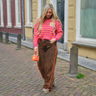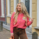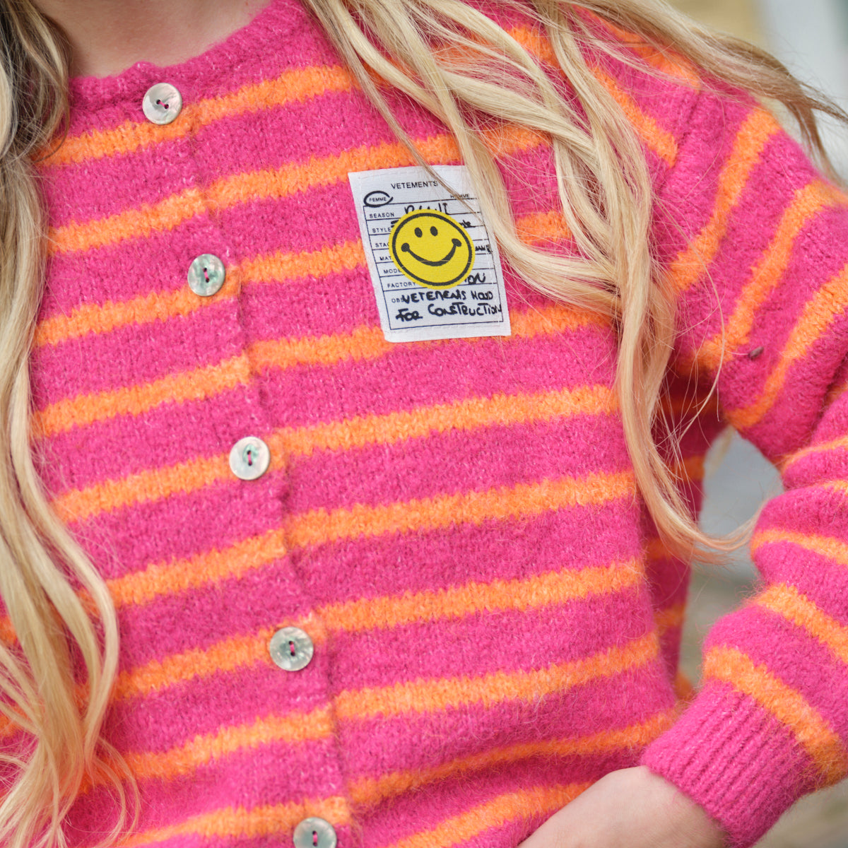 Dit Smiley Streep Vest is een vrolijke, cropped essential die je direct een goed humeur bezorgt. Het vest is gebreid in een zachte, harige textuur en heeft een opvallend horizontaal streepdessin in een levendige combinatie van felroze (fuchsia) en oranje. De ronde hals, de subtiele knoopsluiting en de oversized pasvorm zorgen voor een nonchalante, maar trendy look. De kleine smiley-patch op de borst maakt het speelse detail compleet. Style 'm gesloten als een trui met een high-waist jeans, of open over een basic T-shirt om de felle kleuren te laten knallen.