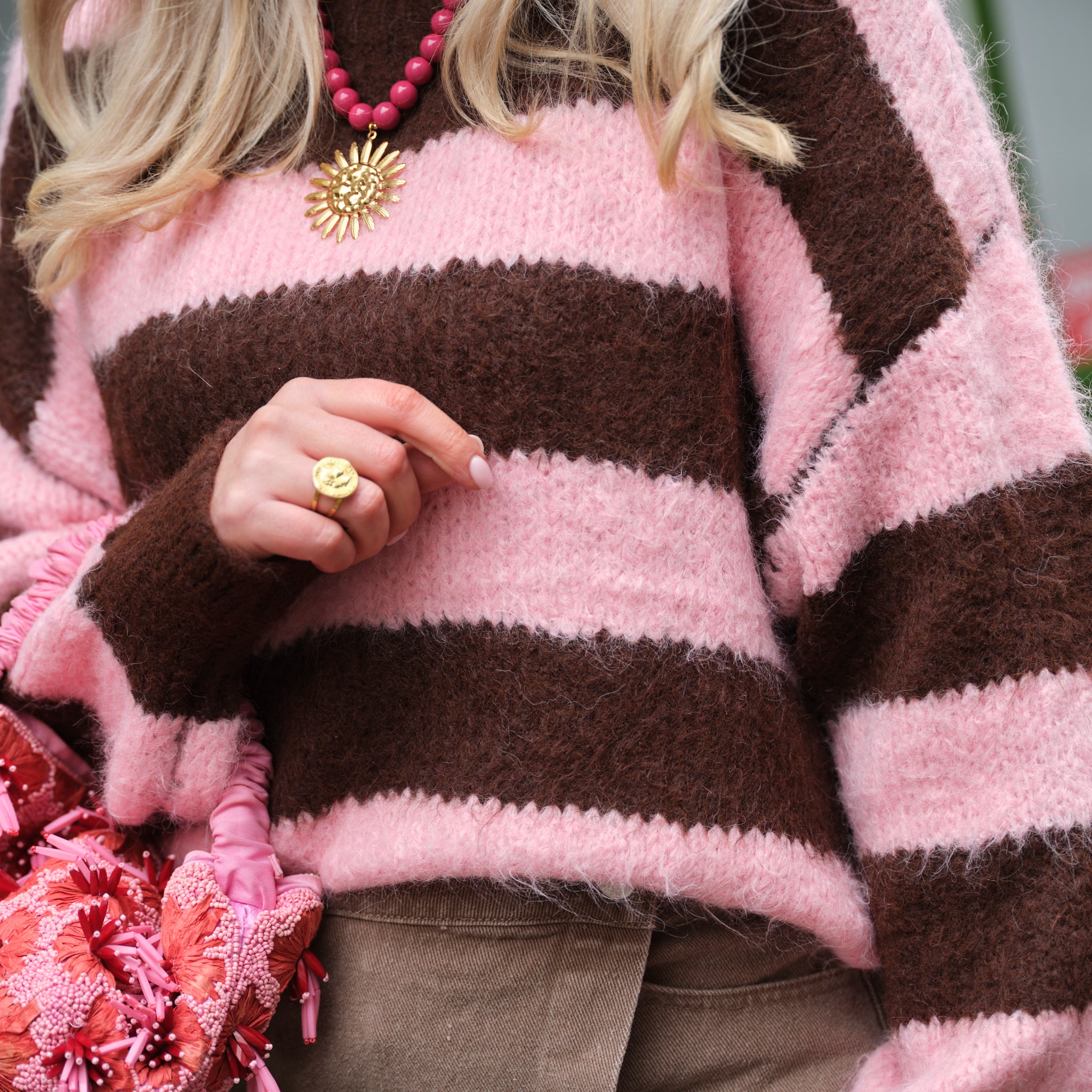Deze Streep Trui Bruin Roze is een heerlijk zachte en behaaglijke trui met een opvallend streepdessin. De trui combineert brede, vrolijke strepen in zachtroze en warm chocoladebruin, waardoor deze een speelse, maar stijlvolle uitstraling krijgt. De wijde, oversized pasvorm, de ronde hals en de licht gepofte mouwen zorgen voor ultiem comfort en een nonchalante look. Draag deze trui met een leren broek of een jeans voor een moeiteloos trendy en warme outfit.
