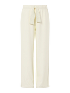 Deze broek is uitgevoerd in een klassieke witte kleur en heeft een wijde pijp, wat zorgt voor een moderne en comfortabele pasvorm. De taille is voorzien van een elastische boord met een opvallend glitter trekkoord dat een speelse en trendy touch toevoegt.