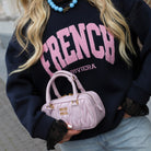 De trui heeft een klassieke ronde hals en is voorzien van de opvallende tekst 'FRENCH RIVIERA' in harige bouclé-achtige letters op de borst. De ruime, oversized pasvorm zorgt voor een relaxte en nonchalante uitstraling.