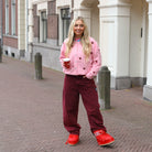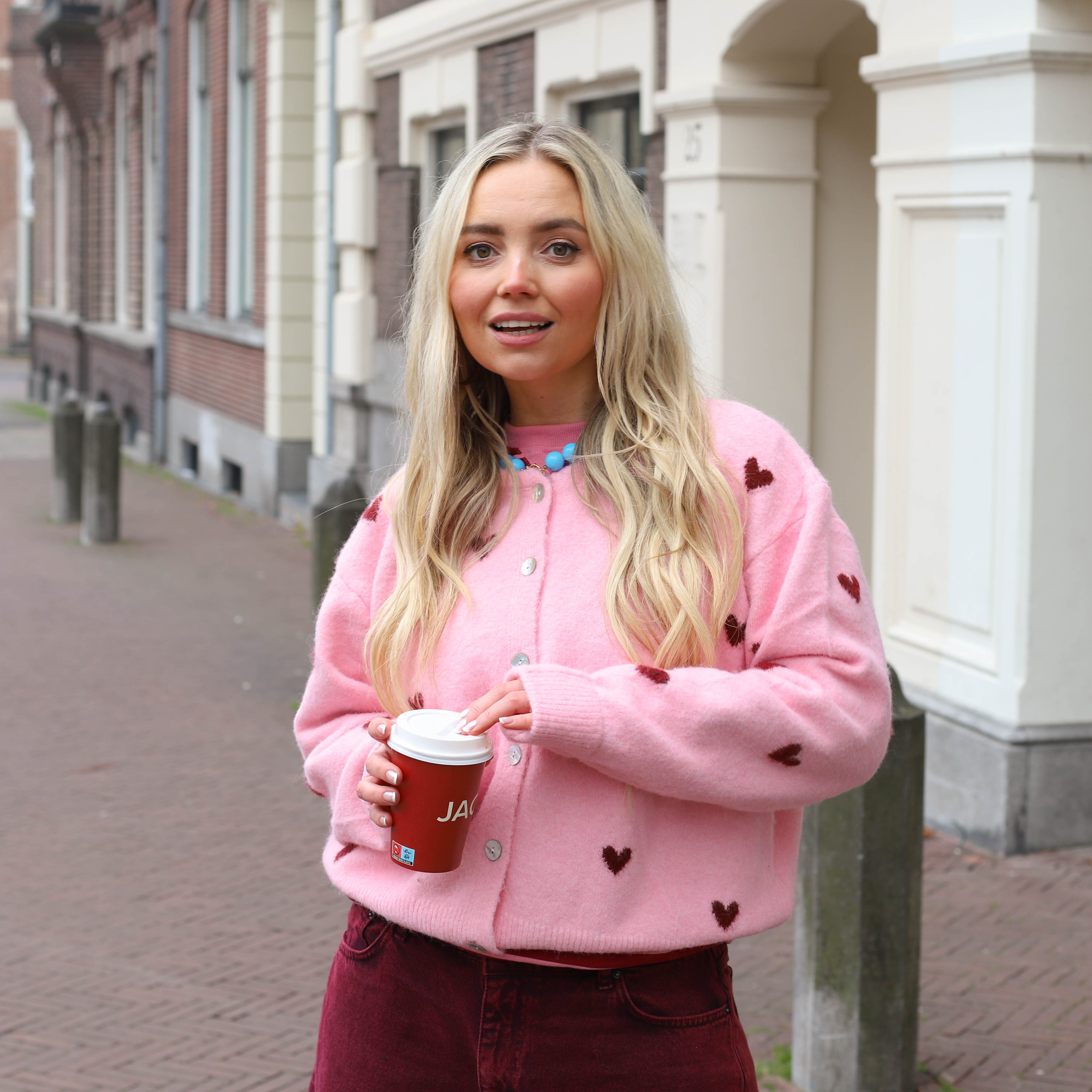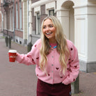 Deze Love Cardigan is een zacht en speels gebreid vestje. Het vest is gemaakt van een harige, roze gebreide stof en heeft een all-over patroon van kleine, ingebreide bruine hartjes. Het vest heeft een klassieke ronde hals, een knoopsluiting en een korte, boxy pasvorm.