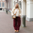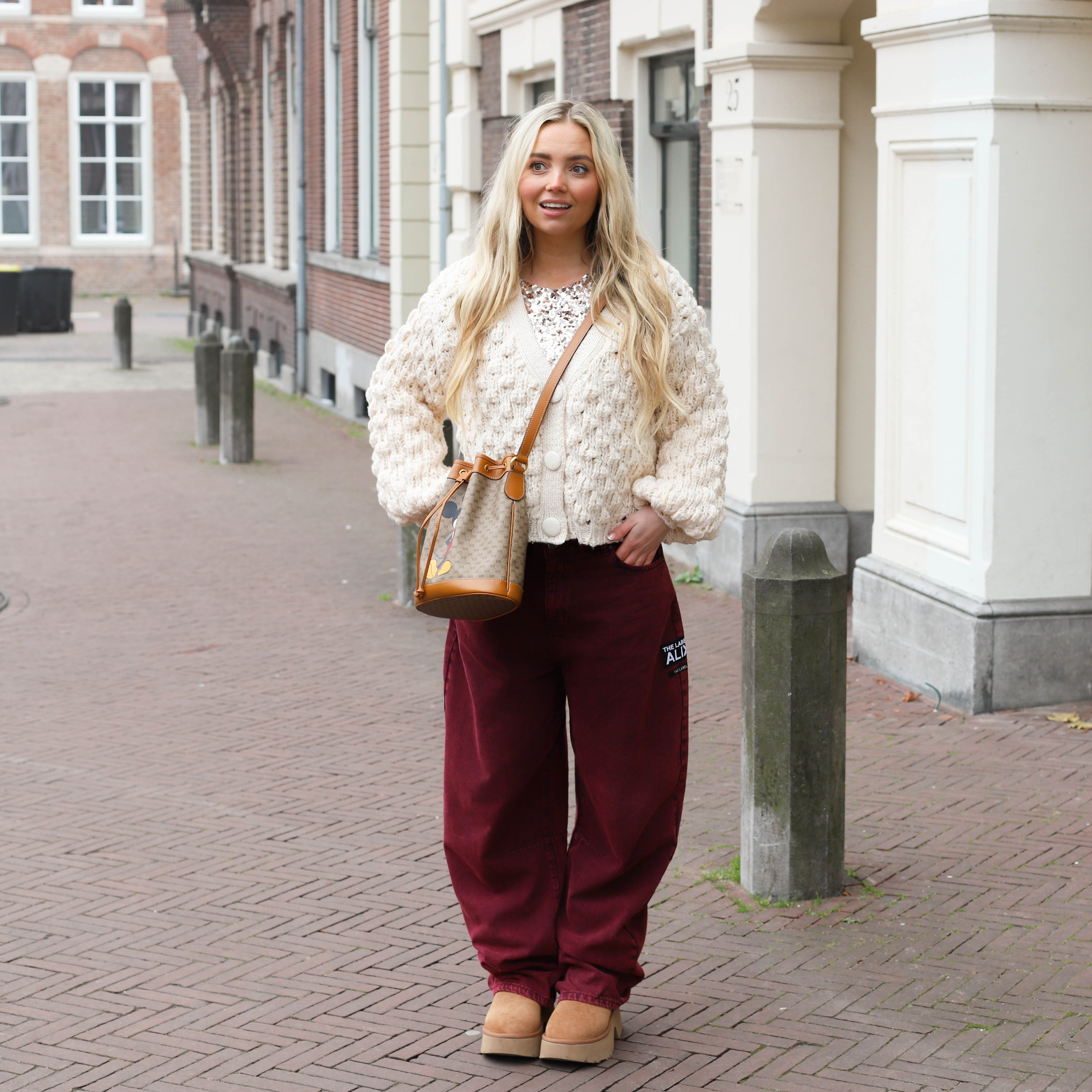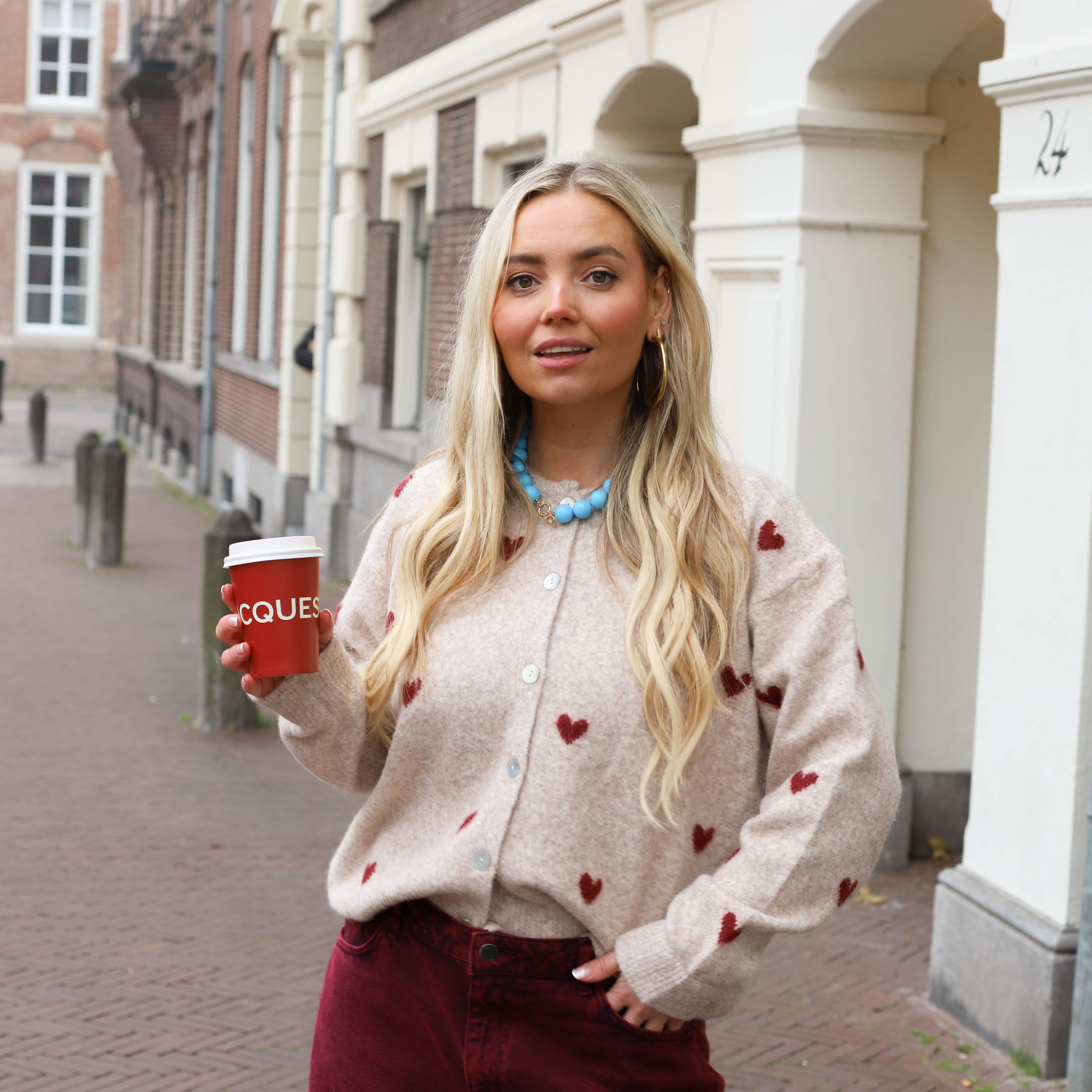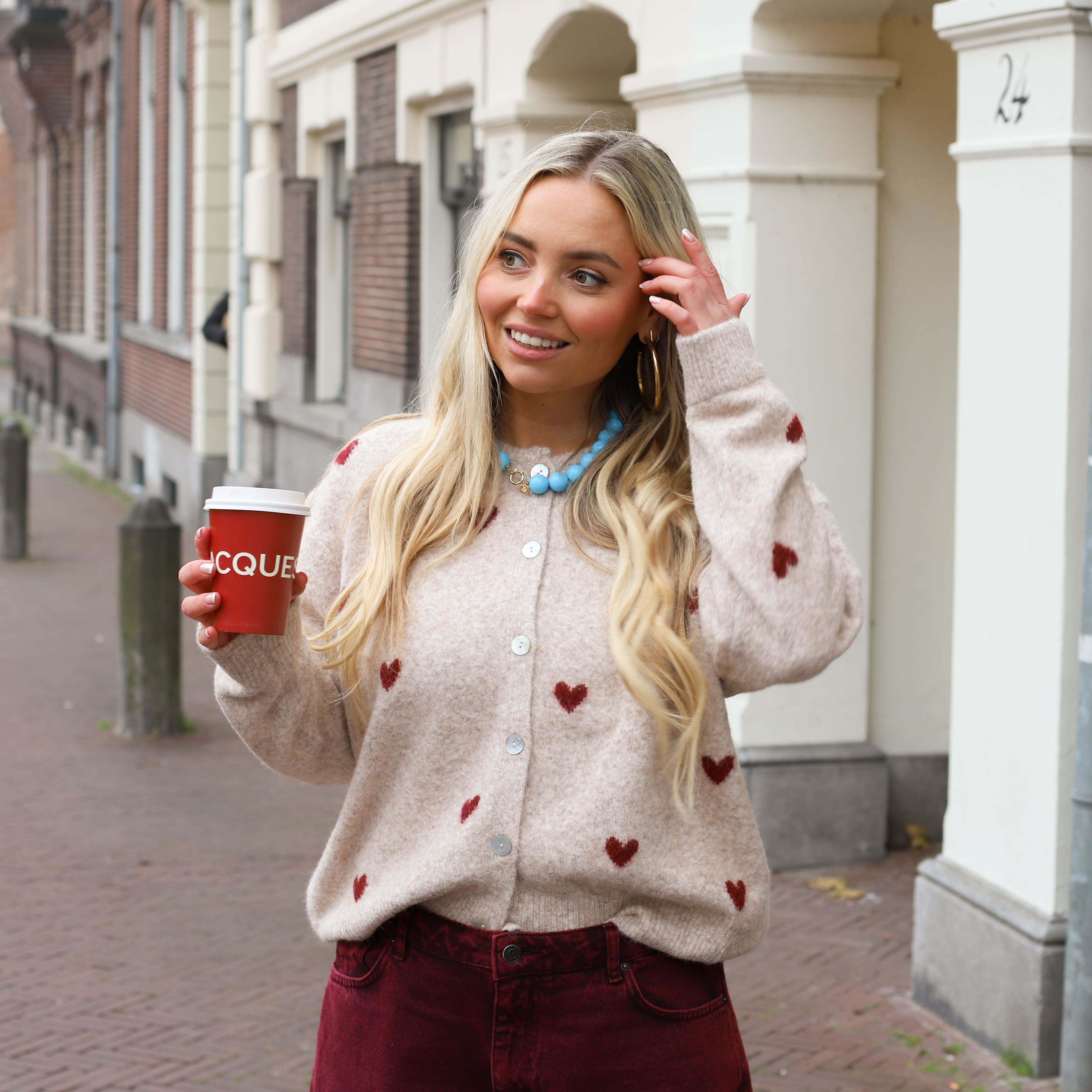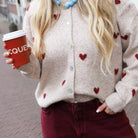 Deze Love Cardigan is een zacht en speels gebreid vestje. Het vest is gemaakt van een harige, taupe gebreide stof en heeft een all-over patroon van kleine, ingebreide bruine hartjes. Het vest heeft een klassieke ronde hals, een knoopsluiting en een korte, boxy pasvorm.