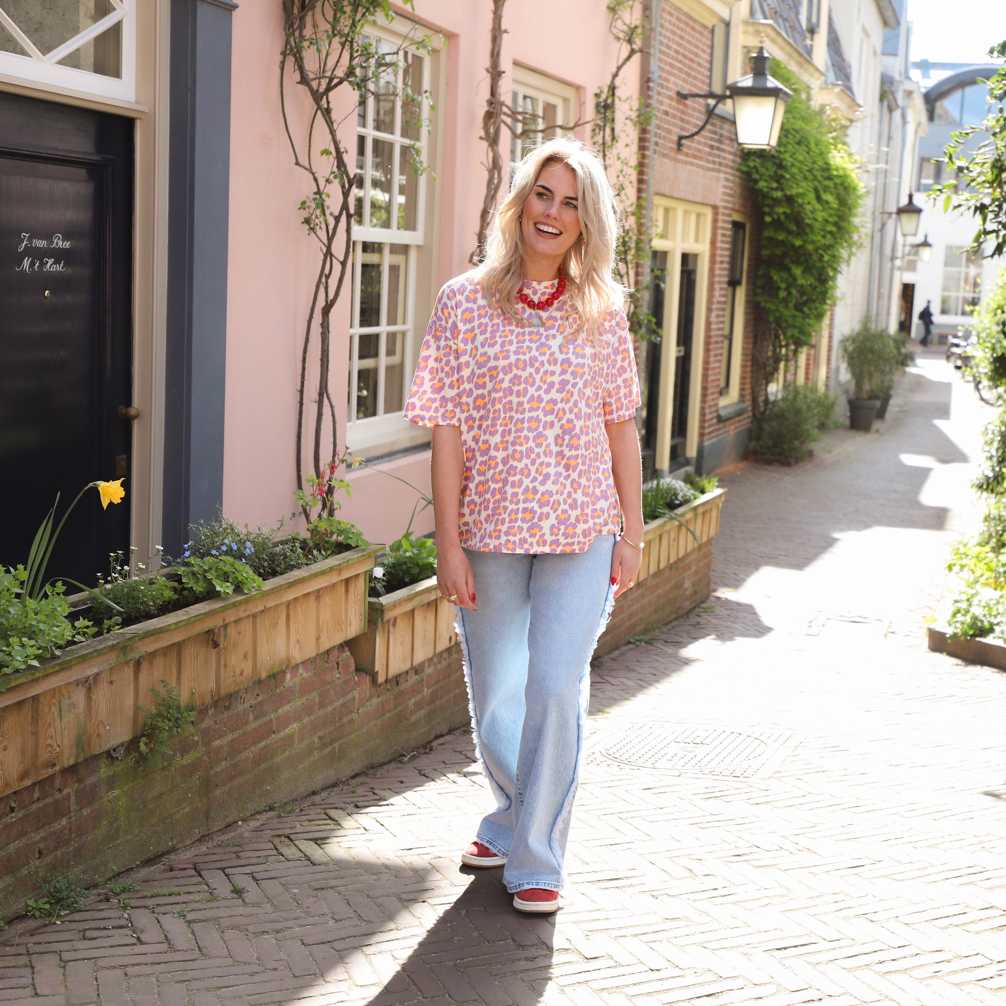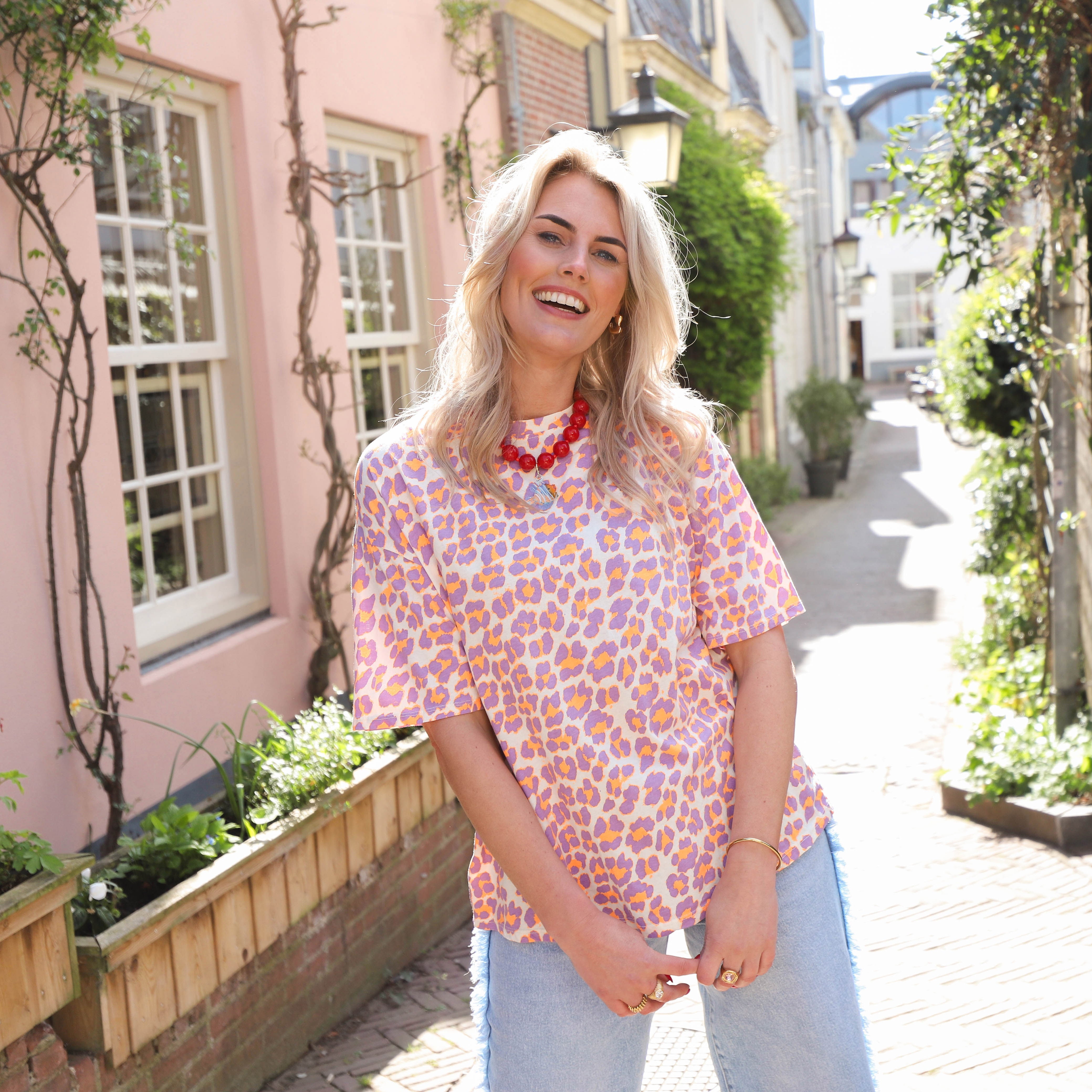 Geef je look een speelse twist met dit trendy T-shirt in een unieke panterprint met ecru, lila en okergele accenten. De zachte katoenen stof en de relaxte pasvorm maken dit item perfect voor een comfortabele en stijlvolle dag.