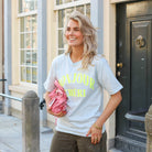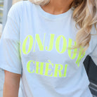 Dit Bonjour Chéri T-shirt is een vrolijk en comfortabel item voor een casual dag. Het shirt valt op door de opvallende, contrasterende tekst op de voorzijde die een speels accent geeft aan de effen basis. Dankzij de relaxte pasvorm en het gebruik van puur katoen draagt het shirt heerlijk luchtig. Het is een veelzijdig kledingstuk dat moeiteloos combineert met je favoriete jeans of een rok voor een ontspannen, alledaagse look.