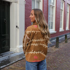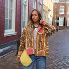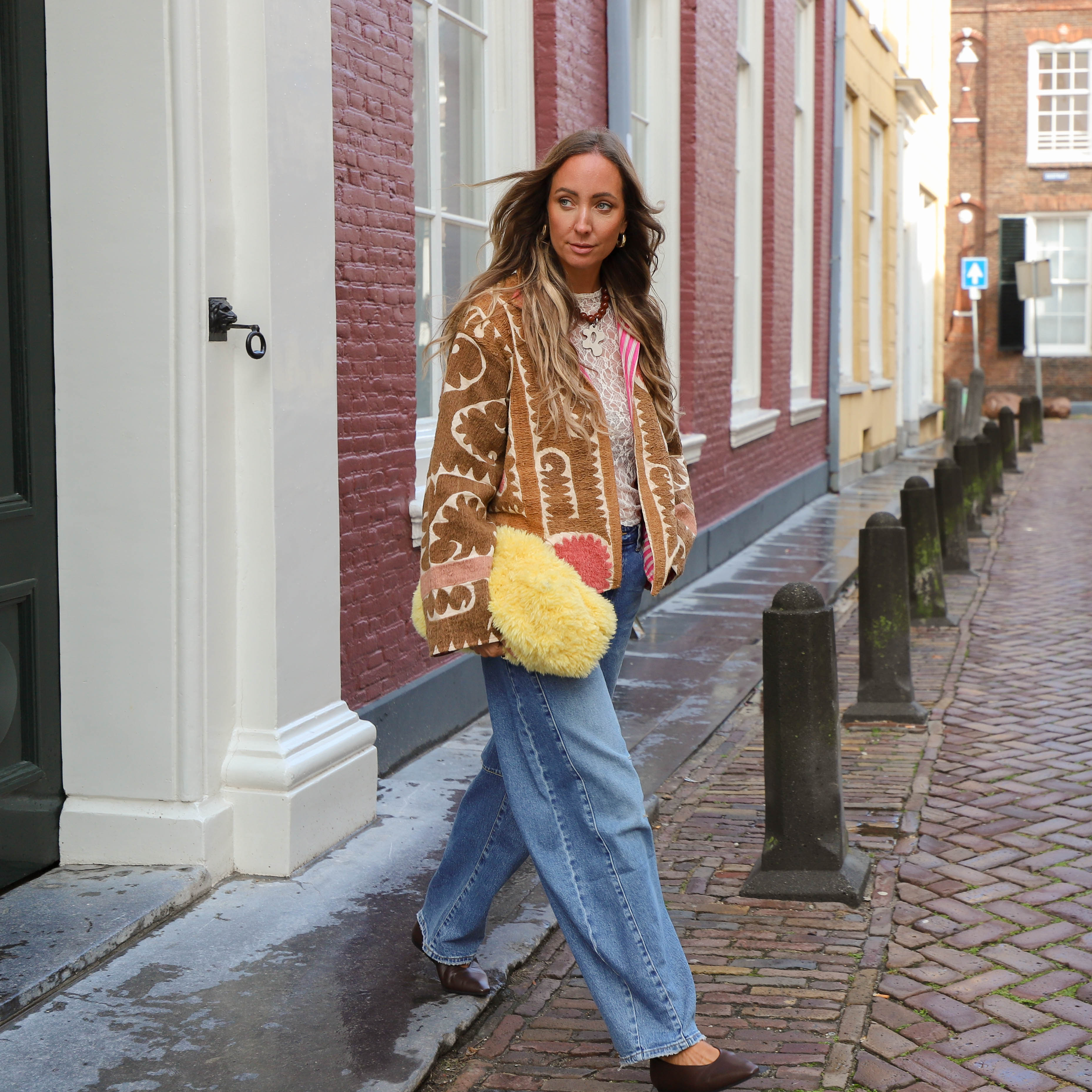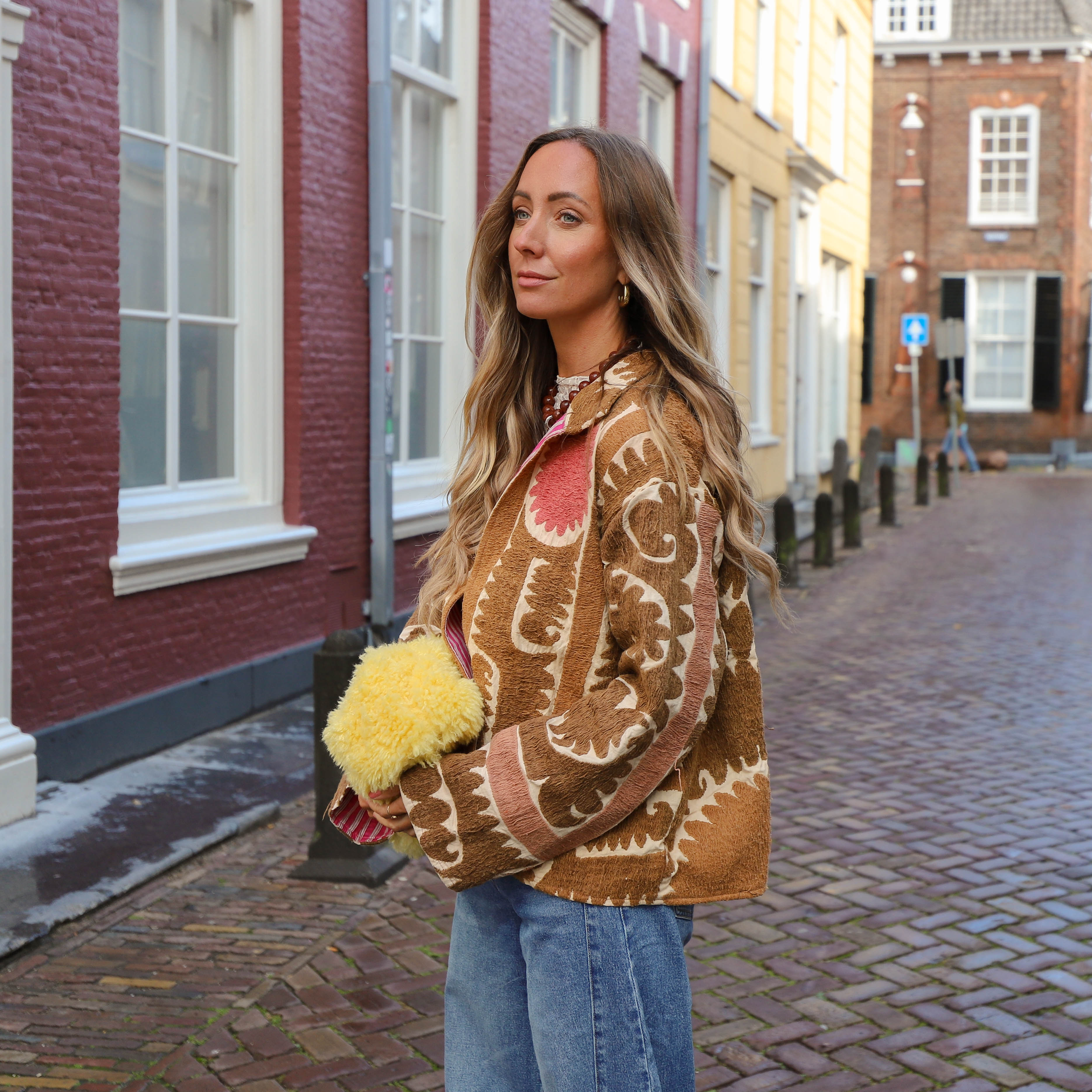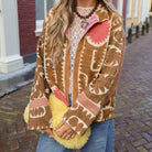 Geef je outfit een unieke en bohemian twist met dit prachtig geborduurde jasje in een bruine kleur. Het jasje heeft een opvallende borduurwerk aan de buitenkant en een gestreepte voering in roze en wit. Het jasje sluit met een rits en heeft een klassieke kraag.