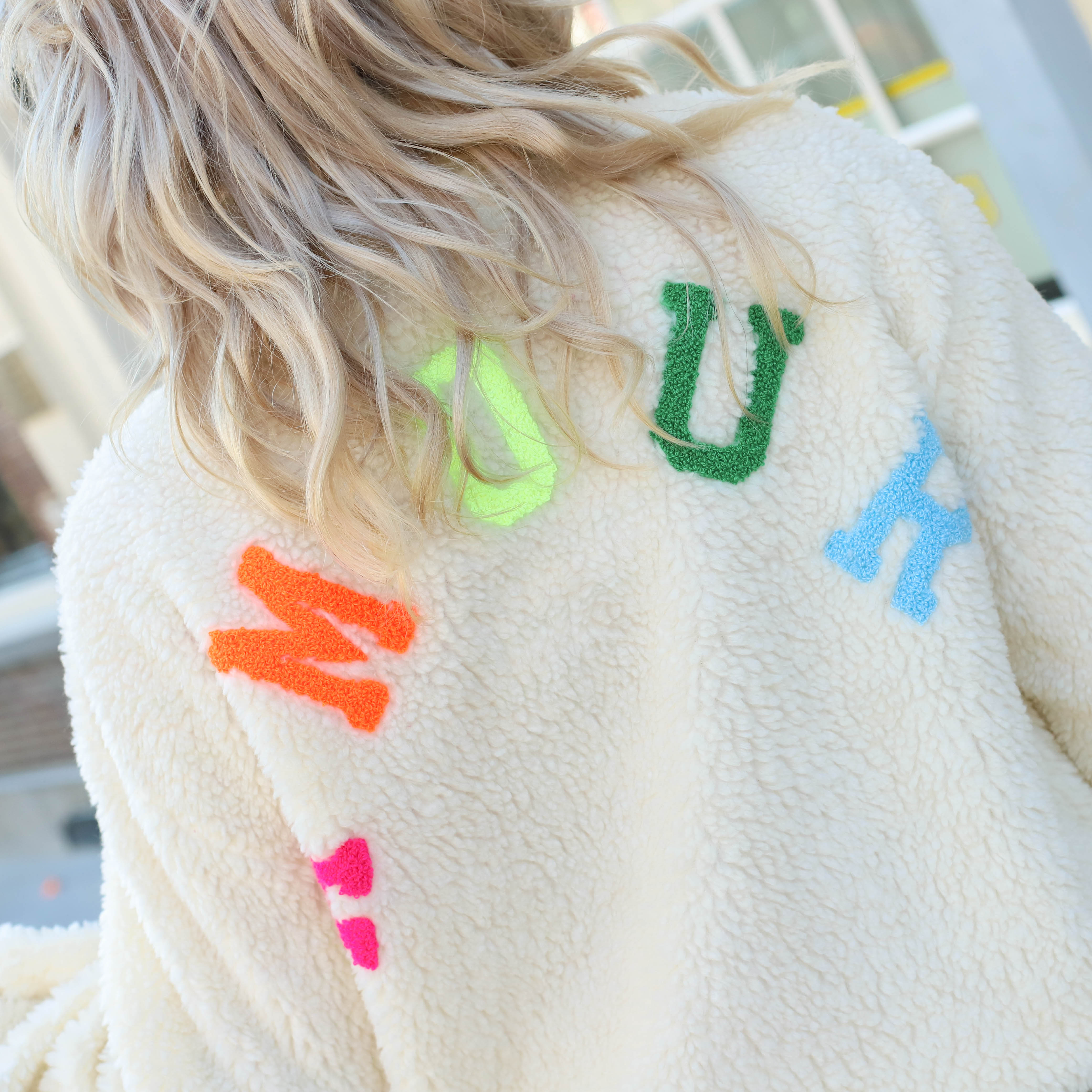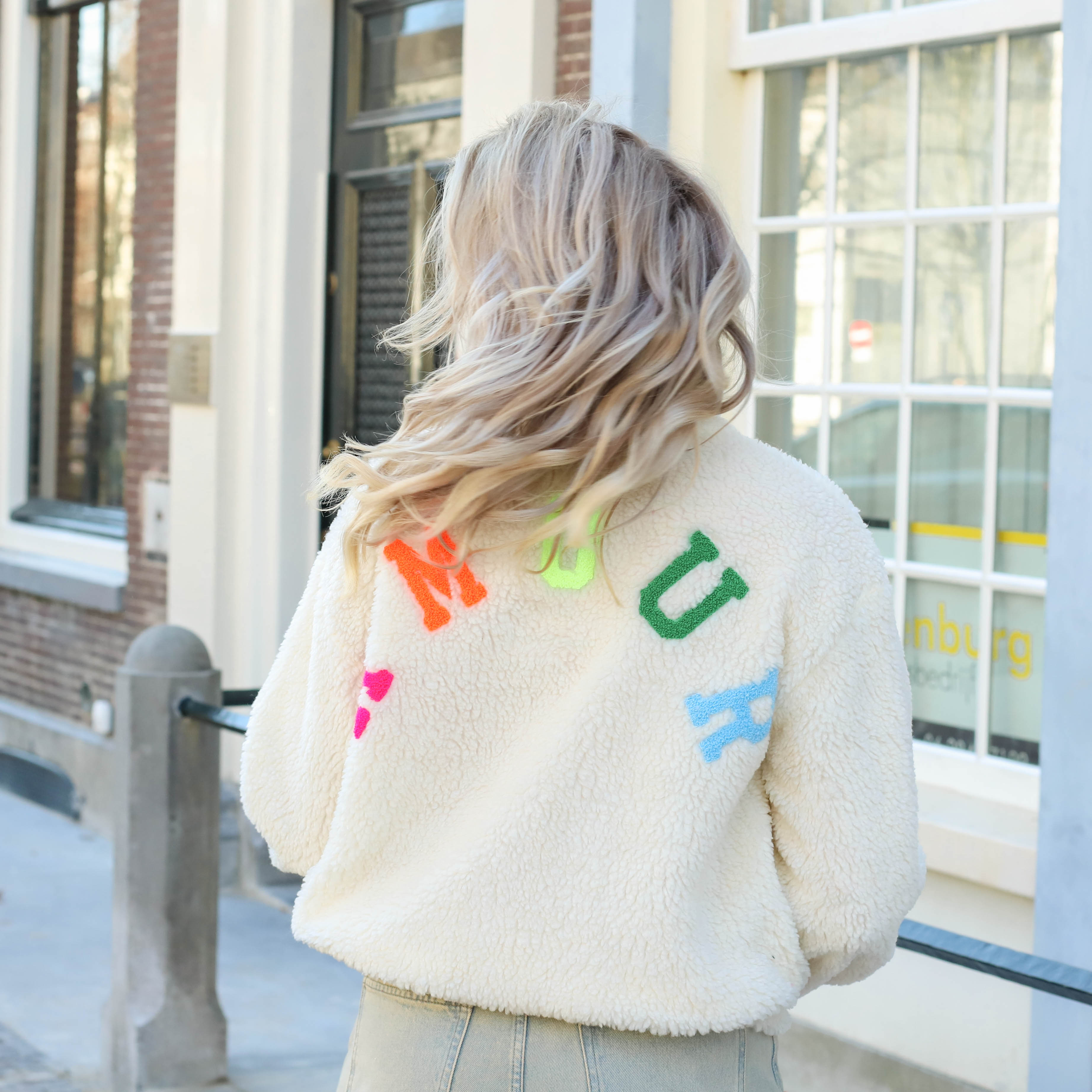 Dit Amour Teddy Jack is een heerlijk zacht en aaibaar item met een vrolijke uitstraling. De fluffy teddy stof zorgt voor een hoog draagcomfort en een knusse look, terwijl de kleurrijke letters op de rug een speels en uniek detail vormen. Het jack is voorzien van een opstaande kraag en elastische boorden aan de onderzijde, wat bijdraagt aan een sportief silhouet. Perfect om als eyecatcher te dragen op een casual jeans voor een warme en stijlvolle outfit.