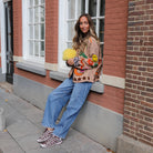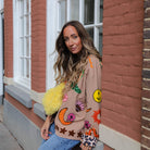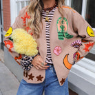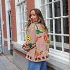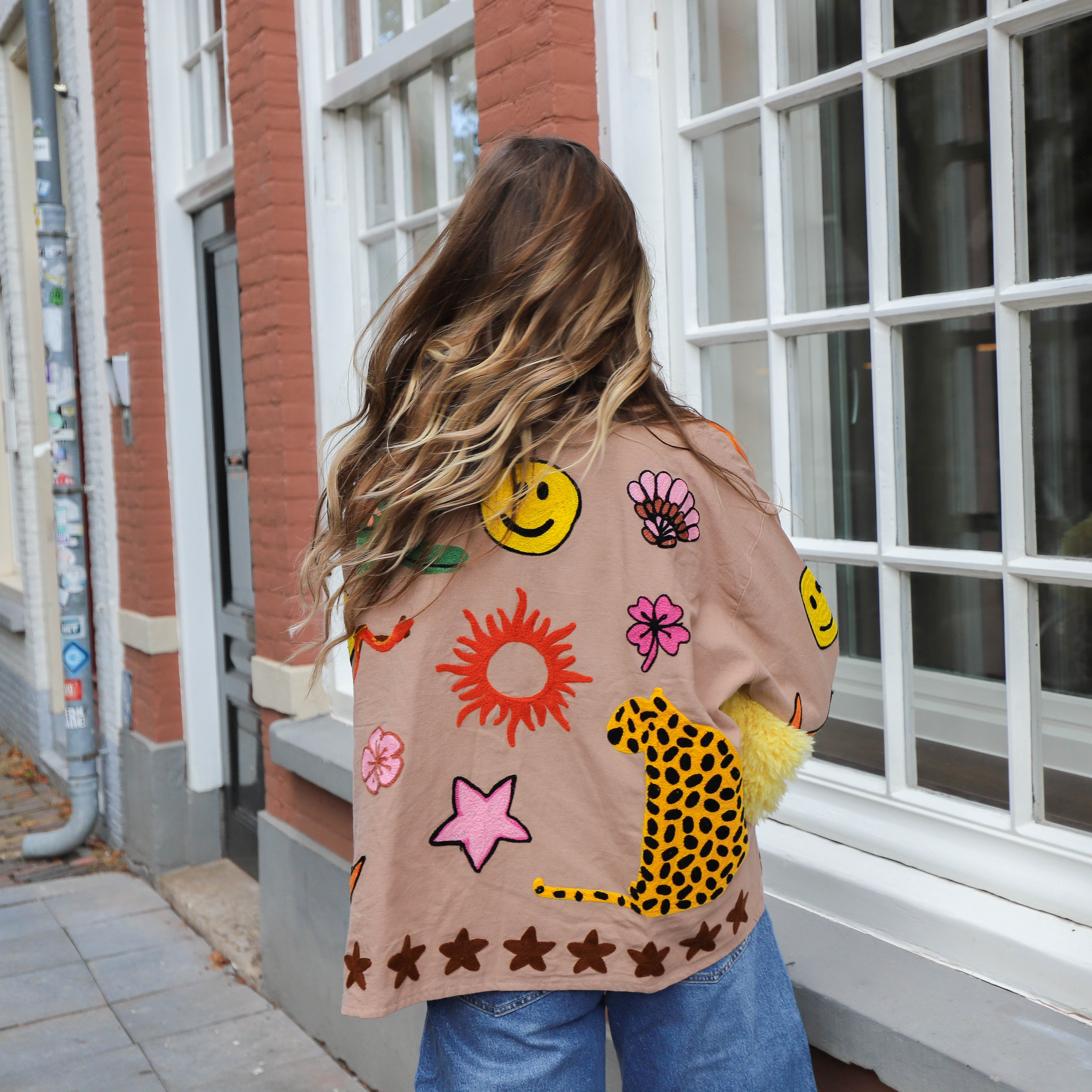 Geef je outfit een unieke en speelse twist met dit beige jasje dat volledig is geborduurd met vrolijke figuren. Dit jasje heeft een openvallende pasvorm en is voorzien van kleurrijke figuren zoals smileys, een zon, een slang en bloemen. De binnenkant van het jasje heeft een opvallende luipaardprint, die ook te zien is in de voering van de mouwen. Perfect als statement piece!