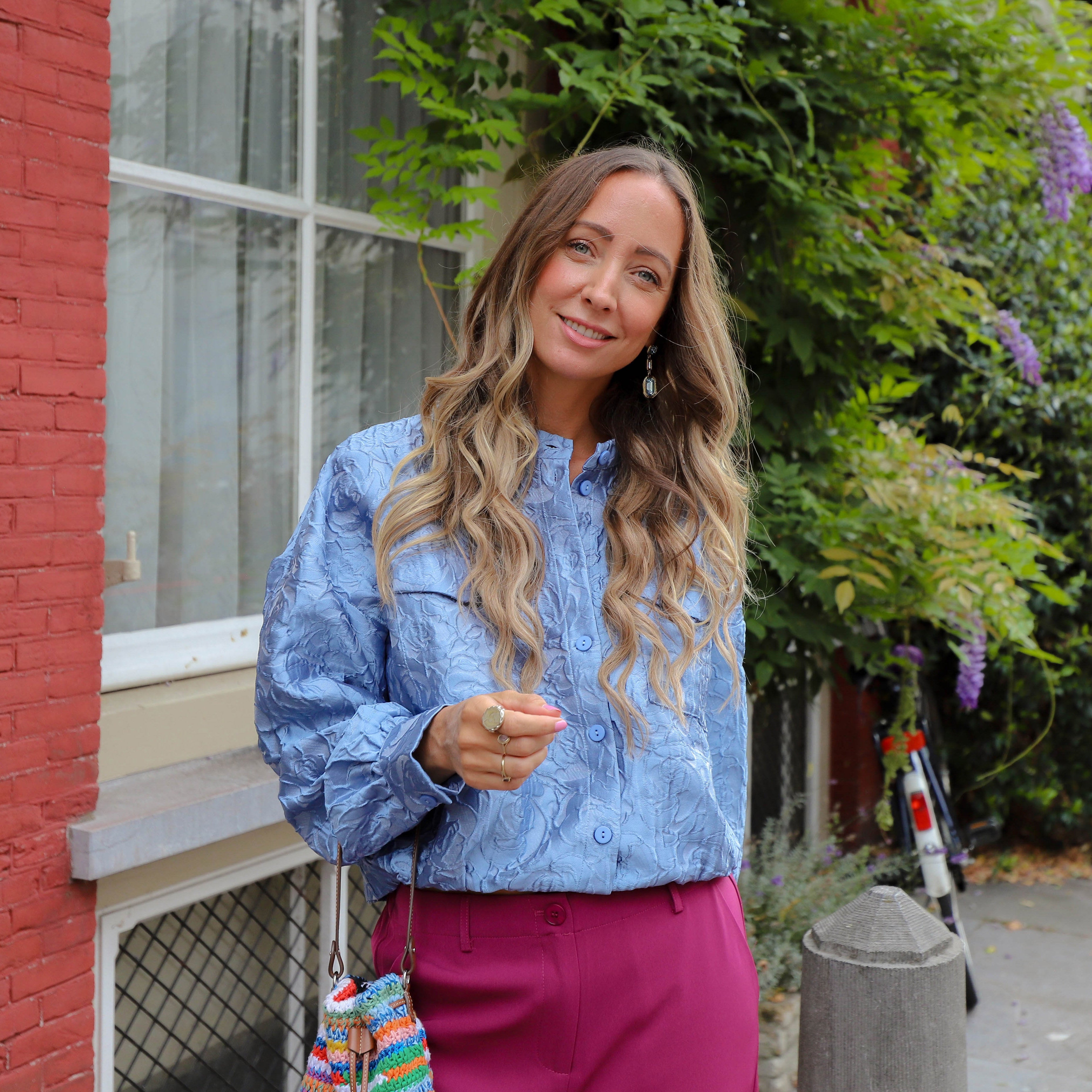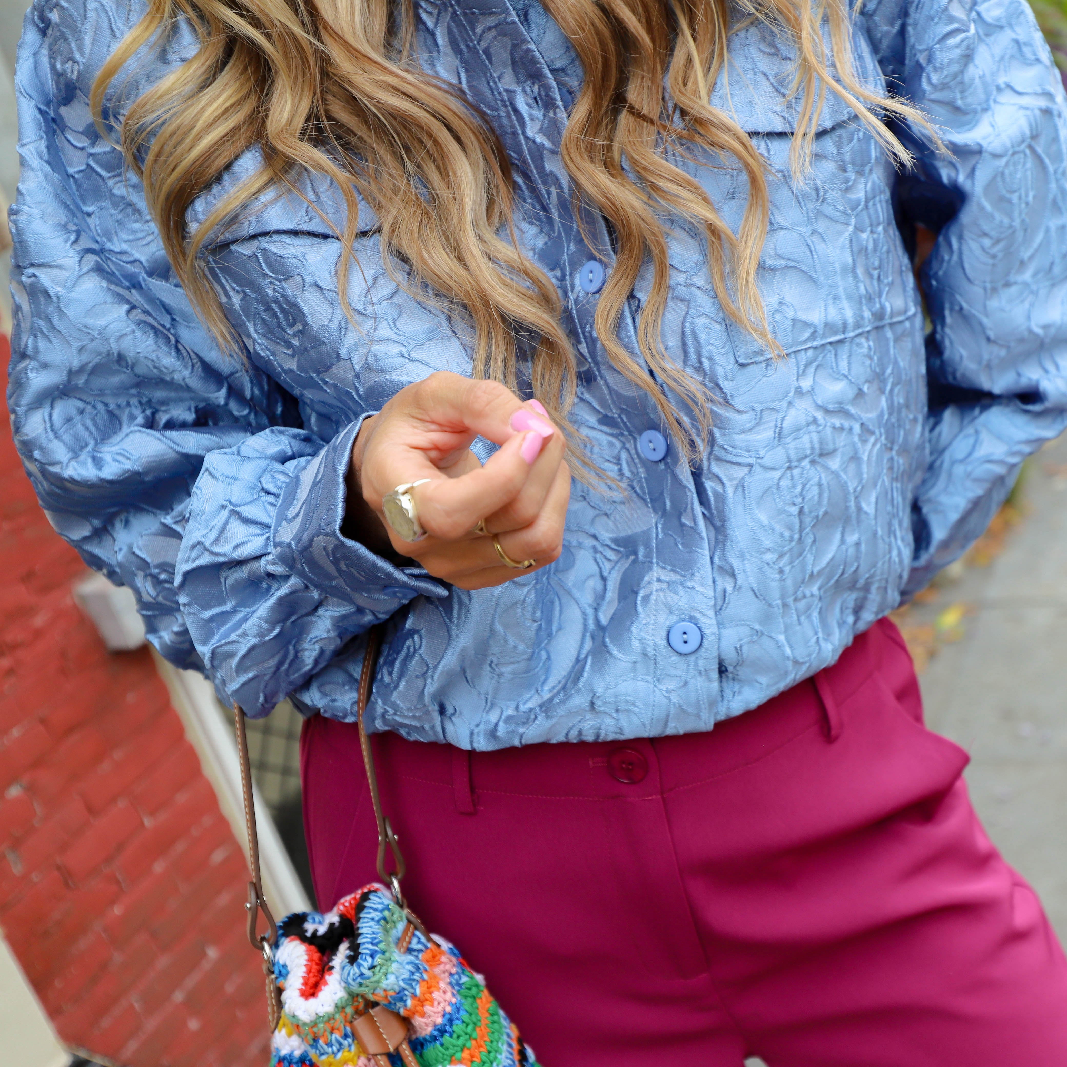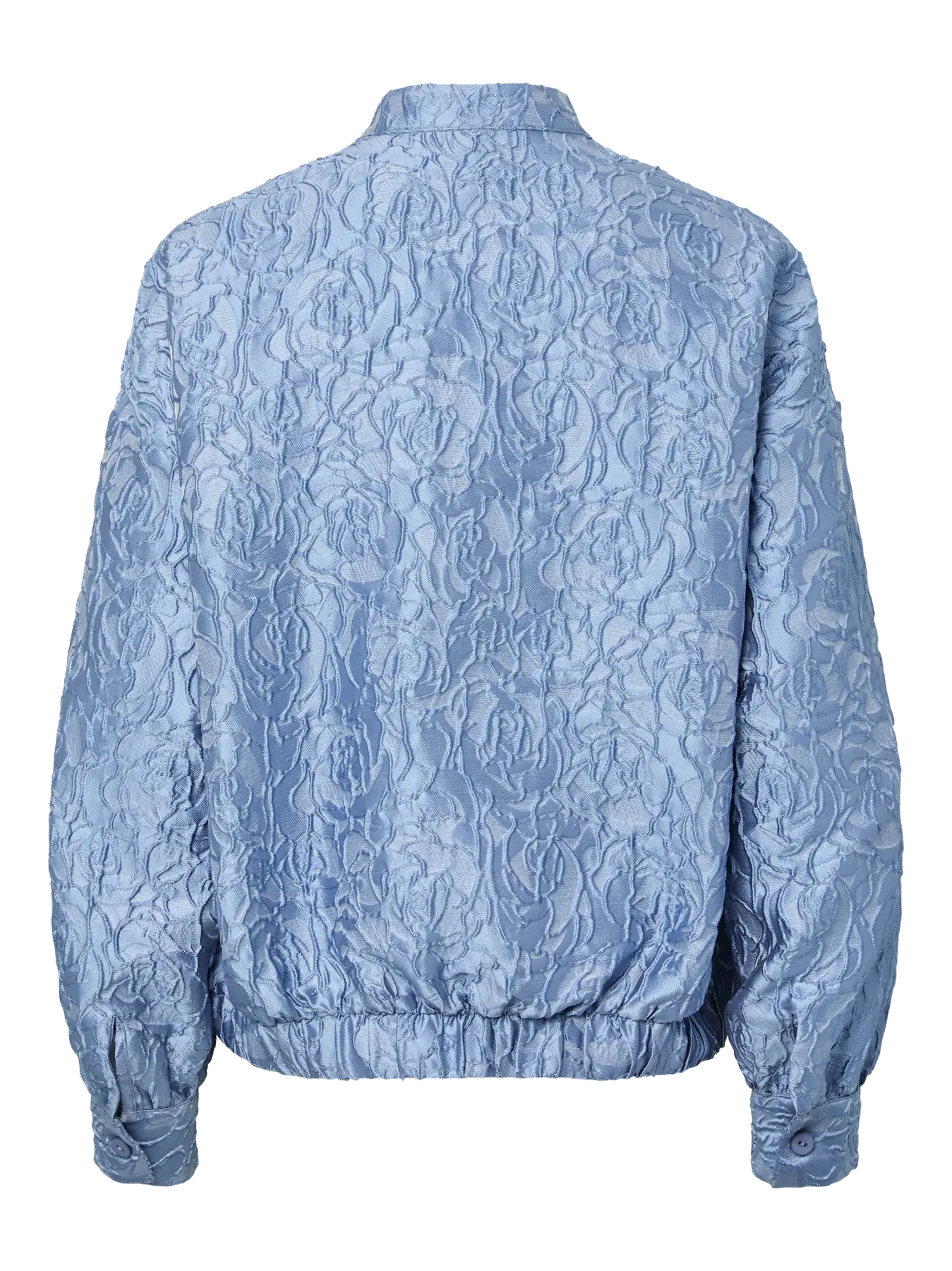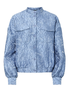 De Bomber Jacket Bluebell is een opvallende en trendy jas met een unieke geprinte textuur. De jas heeft een rechte pasvorm, lange mouwen en sluit met knopen aan de voorkant. De borstzakken en opstaande kraag geven het item een stoere en eigentijdse uitstraling, terwijl de glimmende stof zorgt voor een opvallende en unieke look.