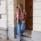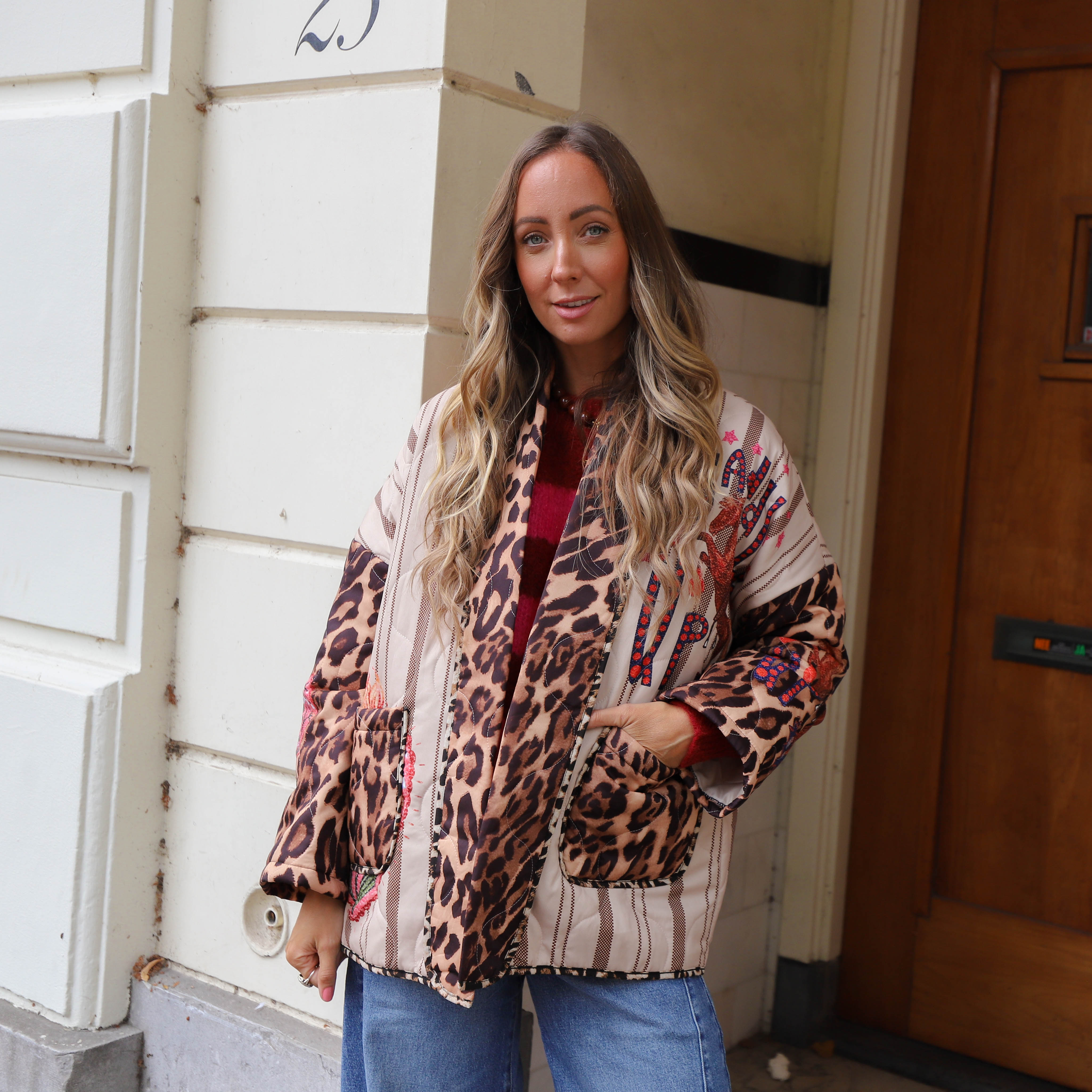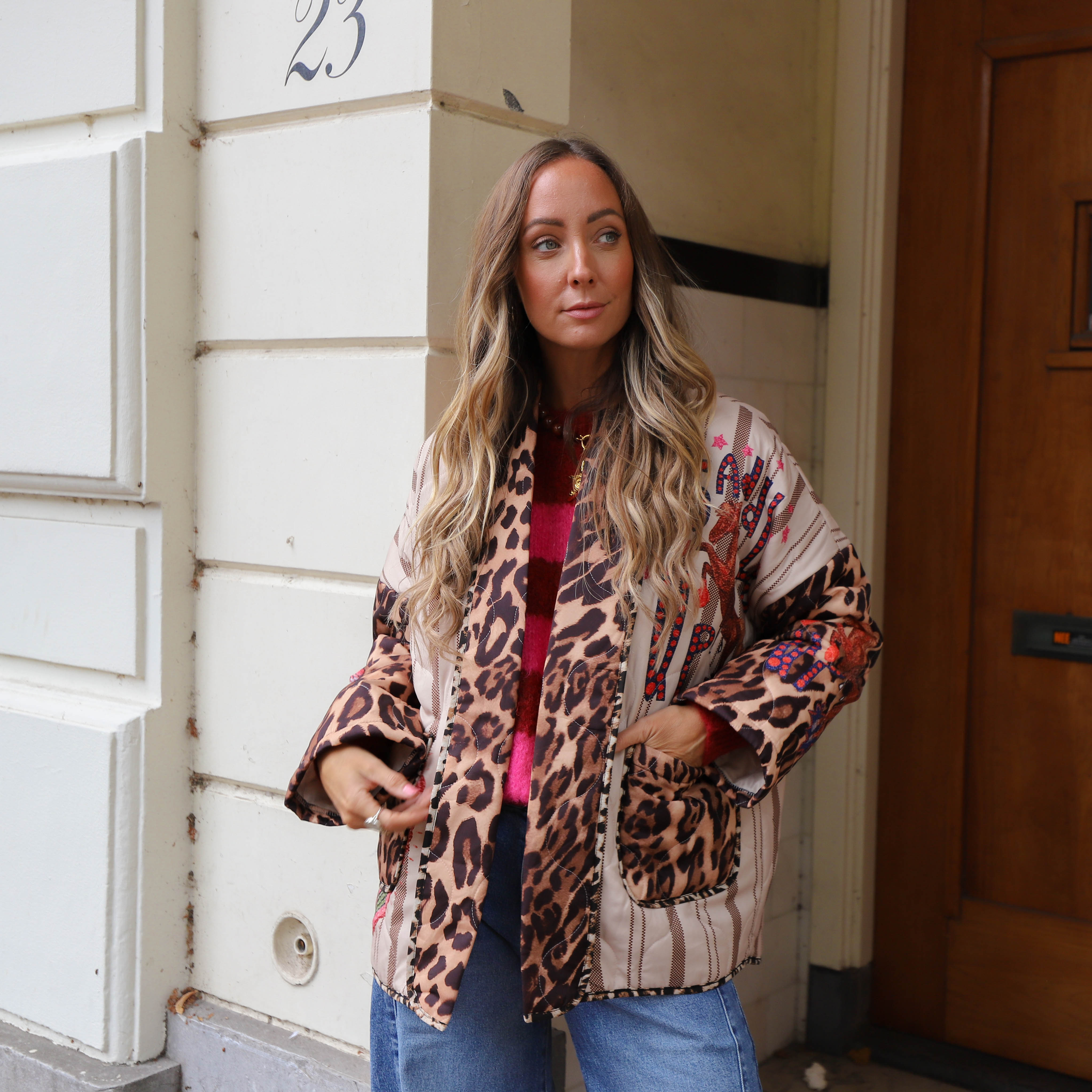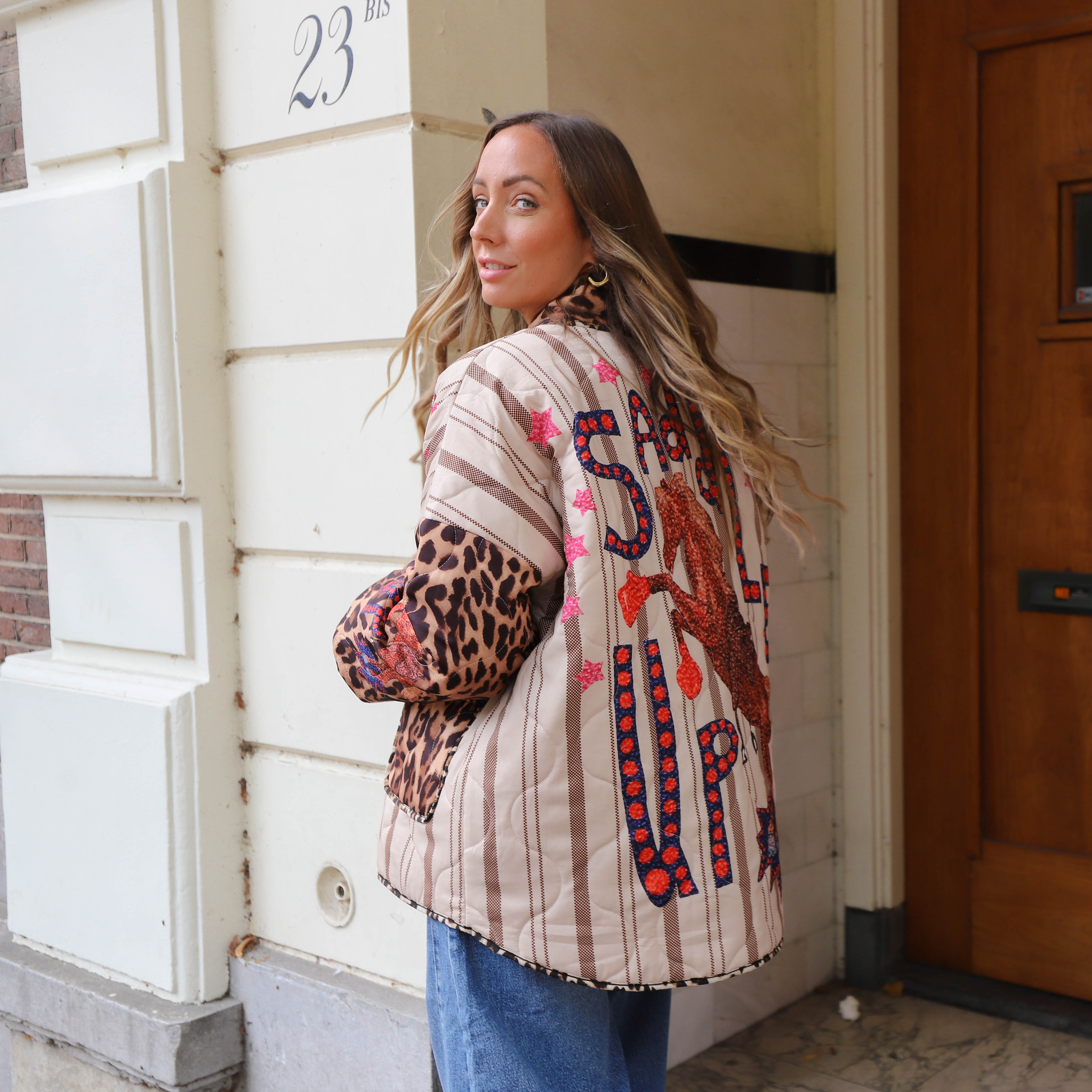 Geef je outfit een trendy twist met dit unieke multi print jasje. Dit jasje heeft een oversized pasvorm en een opvallende mix van prints, waaronder luipaardprint, strepen en een geborduurd 'saddle' design met een paard. De kraag en de opgestikte zakken zijn ook gedetailleerd met een luipaardprint. Gemaakt van een comfortabel materiaal en perfect als statement piece!