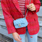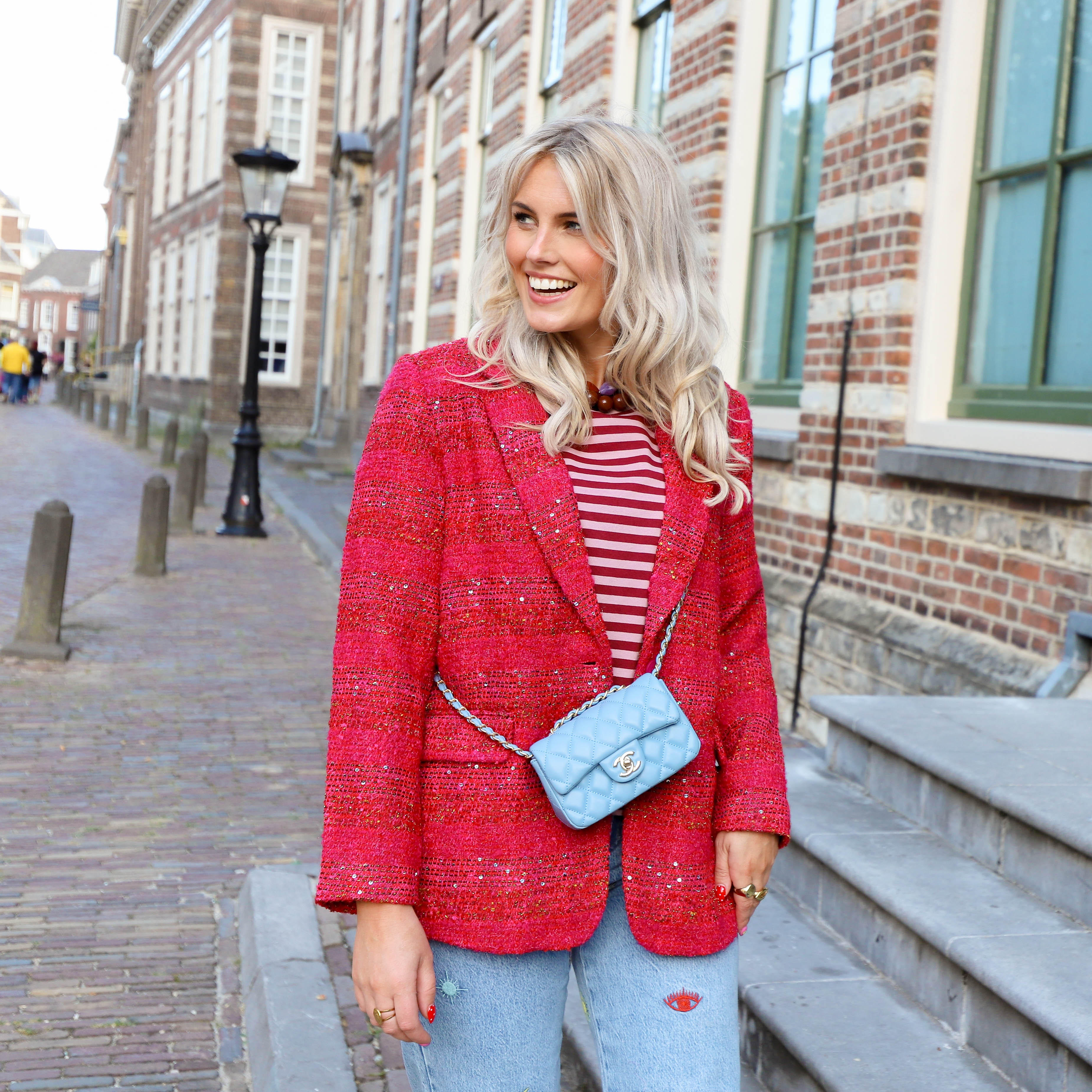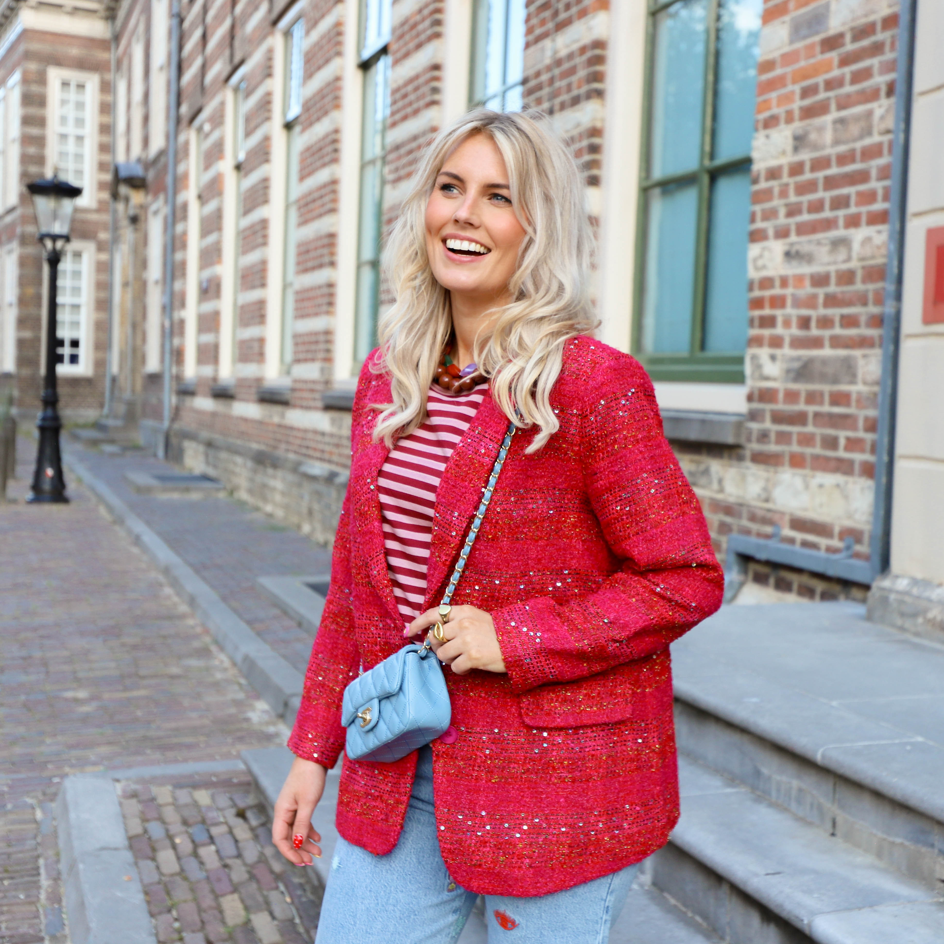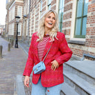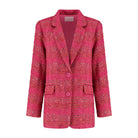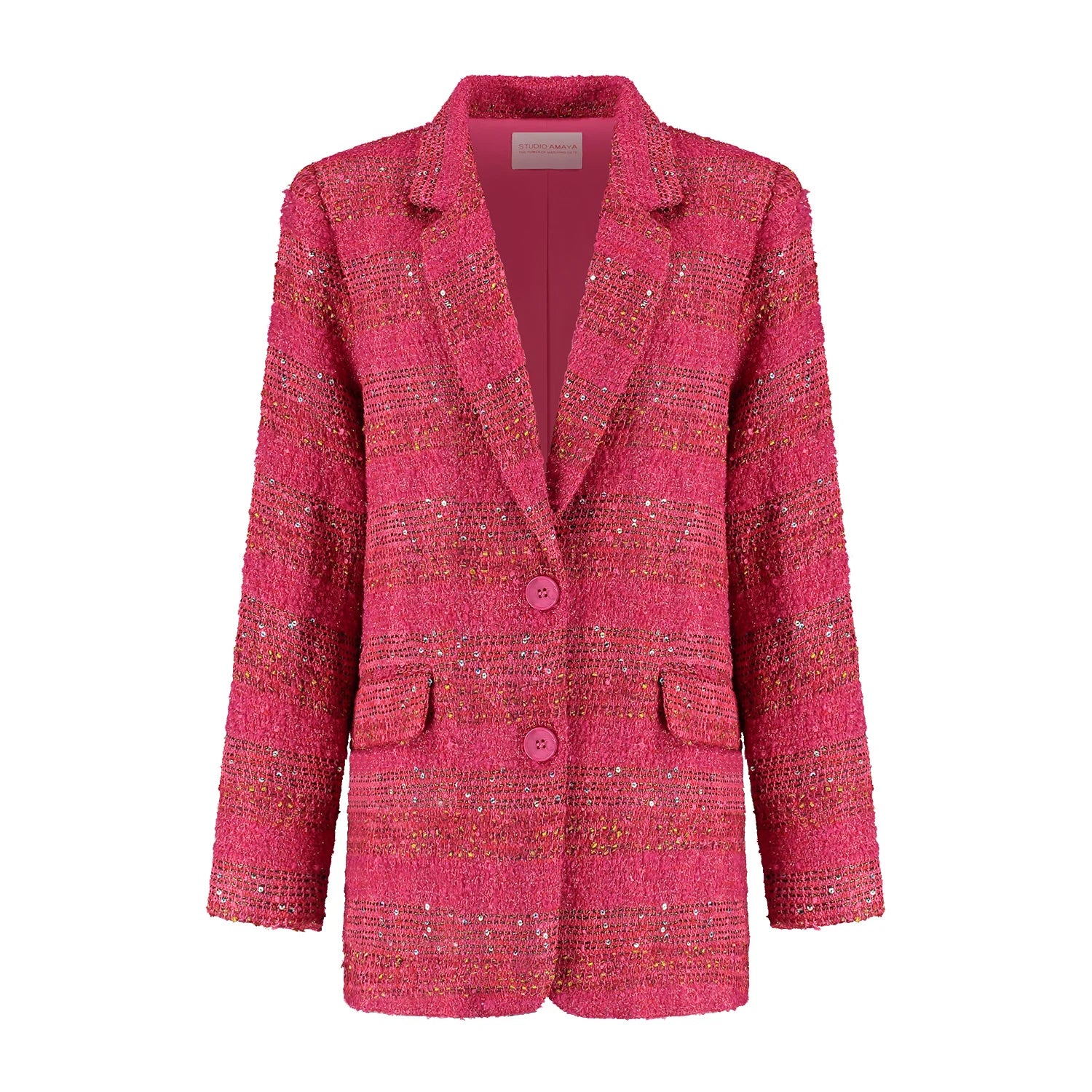 Dit roze bouclé jasje van Studio Amaya is een elegante en veelzijdige toevoeging aan je garderobe. Het jasje, gemaakt van een rijke boucléstof, heeft een opvallende roze kleur met ingeweven gouden en zilveren glitters, wat zorgt voor een subtiele, feestelijke touch. Het is ontworpen met een klassieke kraag en twee knopen aan de voorkant, en wordt gekenmerkt door de opgestikte zakken aan de voorzijde. Dit jasje combineert klassieke elegantie met moderne flair, waardoor het perfect is voor zowel formele gelegenheden als casual chique looks.