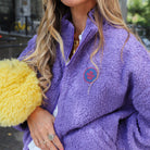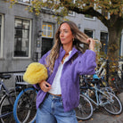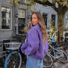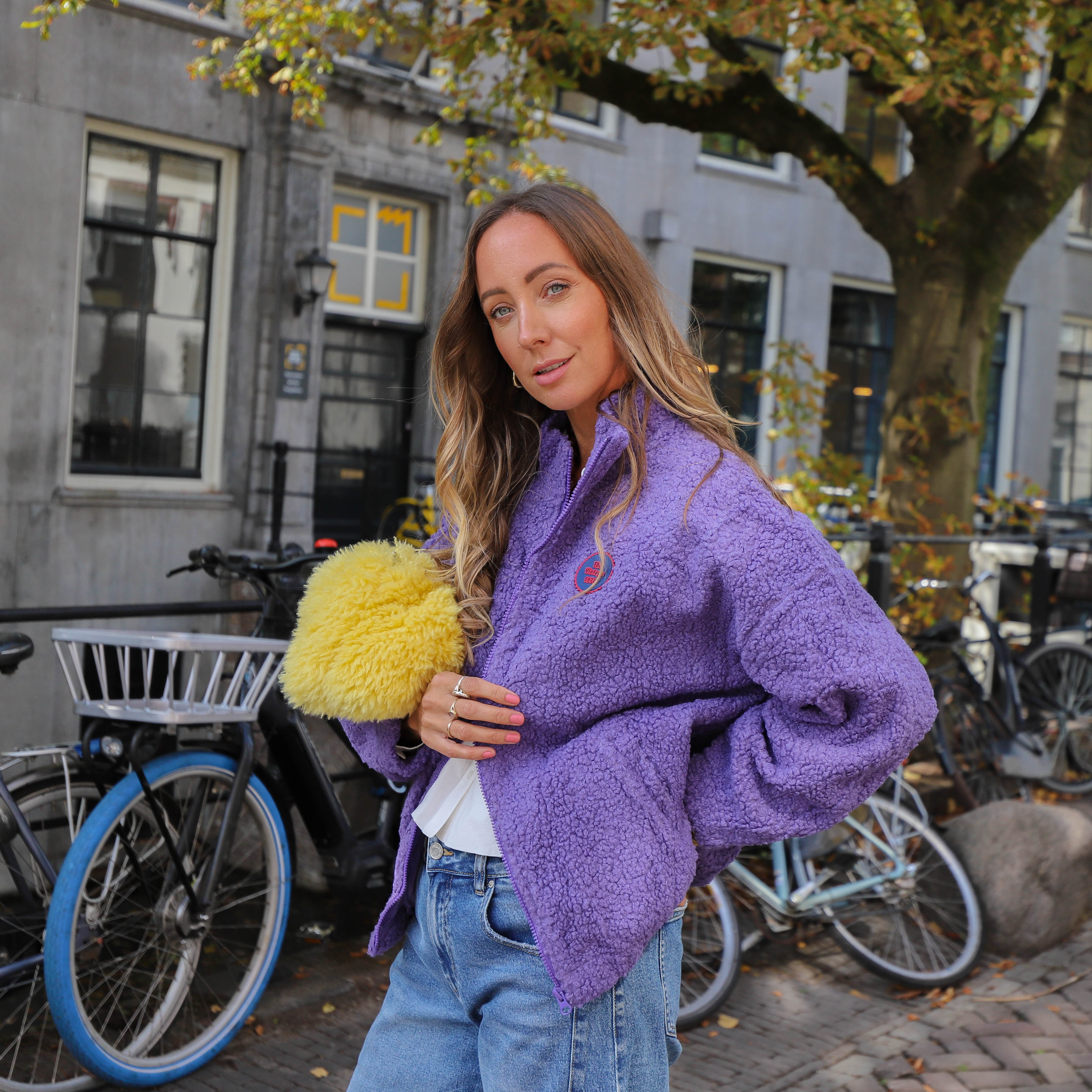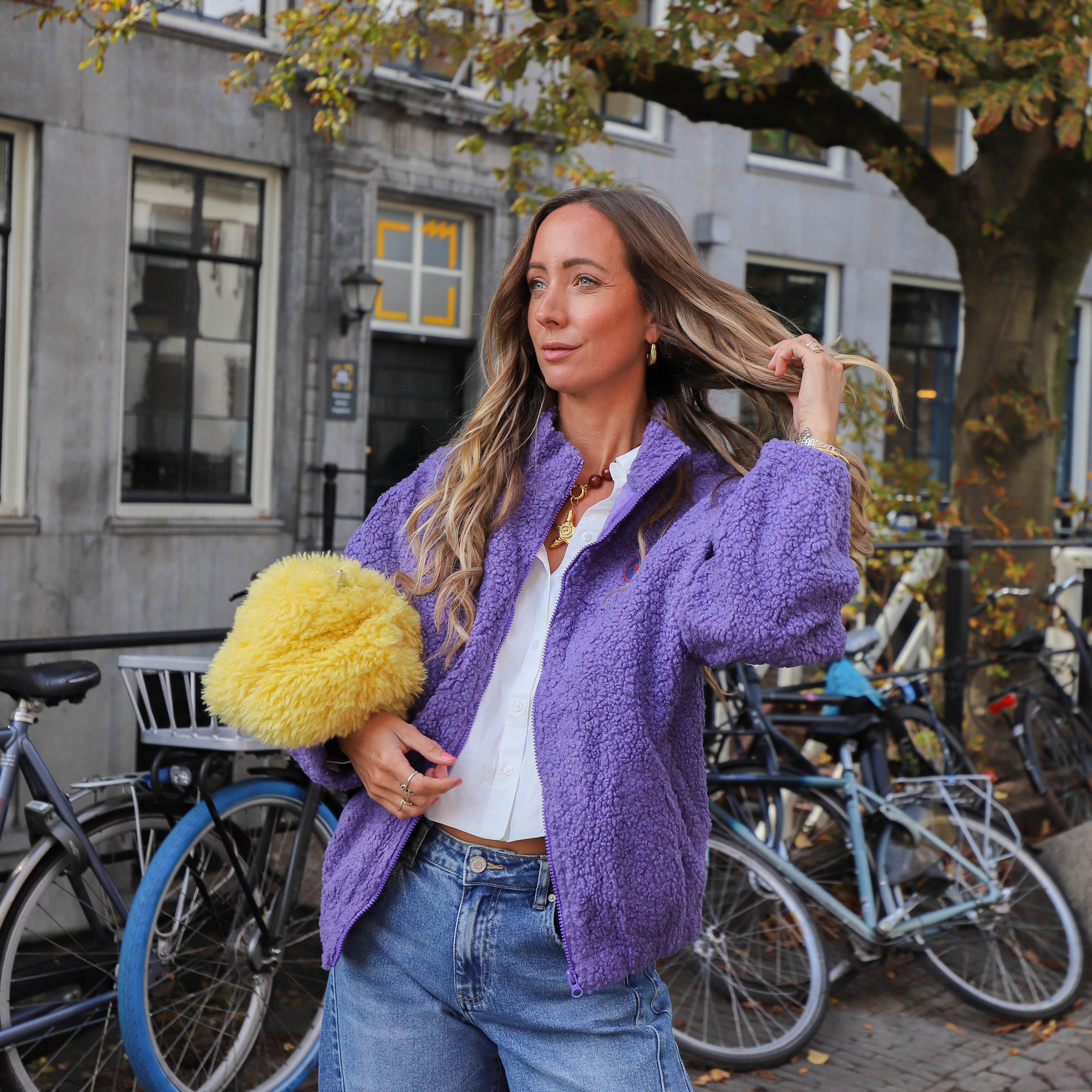 Geef je outfit een comfortabele en trendy twist met dit leuke paarse teddy jasje. Het jasje heeft een oversized pasvorm en een opvallende textuur, wat zorgt voor een unieke look. De klassieke kraag en de ritssluiting aan de voorkant maken het jasje zowel stijlvol als functioneel. Binnenin vind je een leuke patch met de tekst "for teddy lovers".
