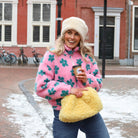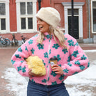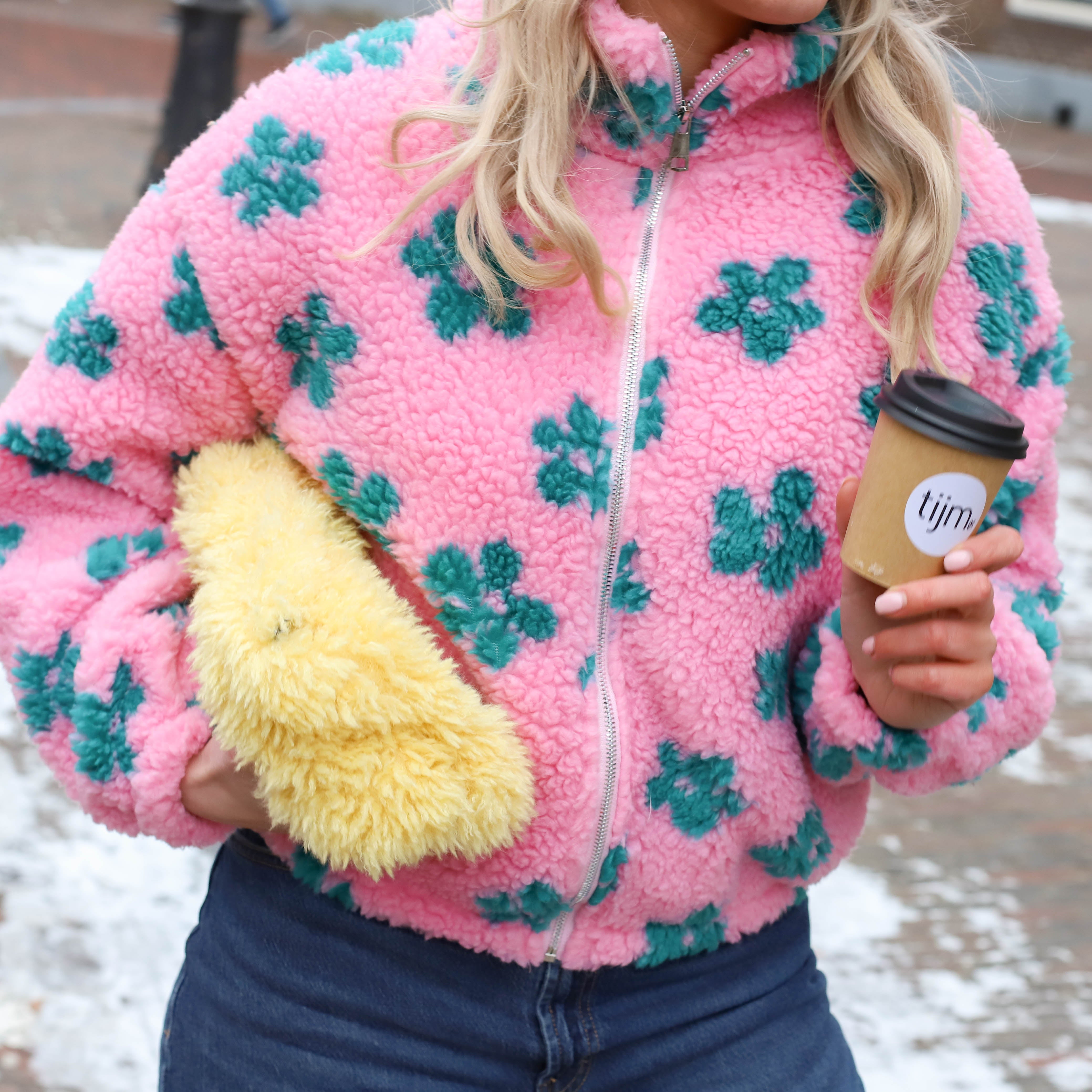 Deze Teddy Jas is een leuke jas, perfect om kleur toe te voegen aan je look. De jas is gemaakt van zachte teddy fleece en heeft een opvallende roze met een all-over patroon van groene bloemen. De ritssluiting, de hoge opstaande kraag en de comfortabele pasvorm maken dit een ideale cropped tussenjas.