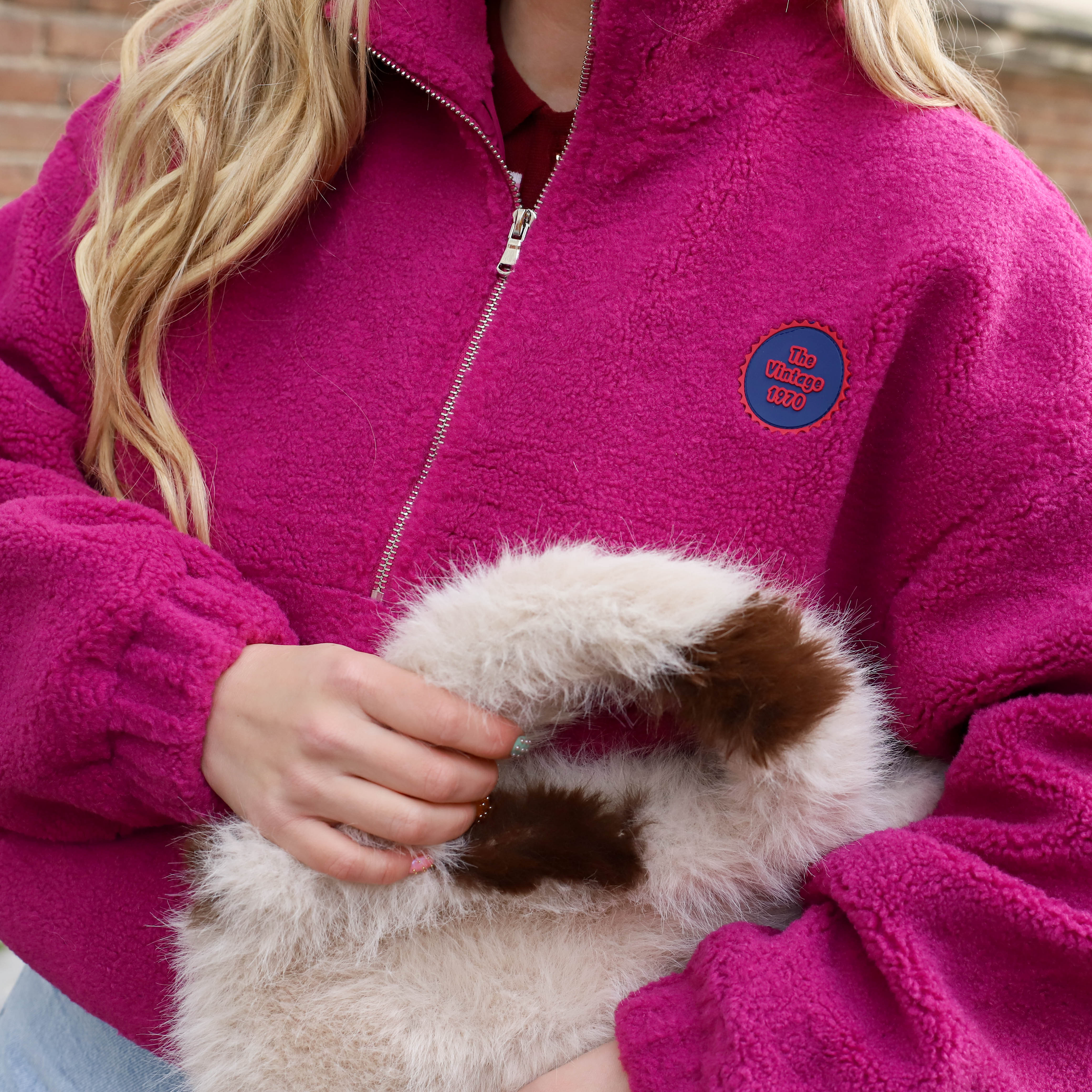 Dit Teddy Jack in magenta is de ultieme comfy en warme toevoeging aan je wintergarderobe. De oversized pasvorm, de hoge kraag met een halve rits en de ruime kangoeroezak aan de voorkant zorgen voor een sportieve en nonchalante uitstraling. De ronde, geborduurde patch op de borst geeft een speels kleuraccent.
