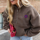 De oversized pasvorm, de hoge kraag met een halve rits en de ruime kangoeroezak aan de voorkant zorgen voor een sportieve en nonchalante uitstraling. De ronde, geborduurde patch op de borst geeft een speels kleuraccent. Draag dit jack zowel binnen als buiten voor extra warmte.