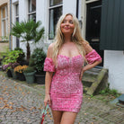 Mooie lichtroze jurk met pailletten. Het jurkje is perfect voor naar een feestje en zit heerlijk door de binnenvoering.
