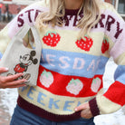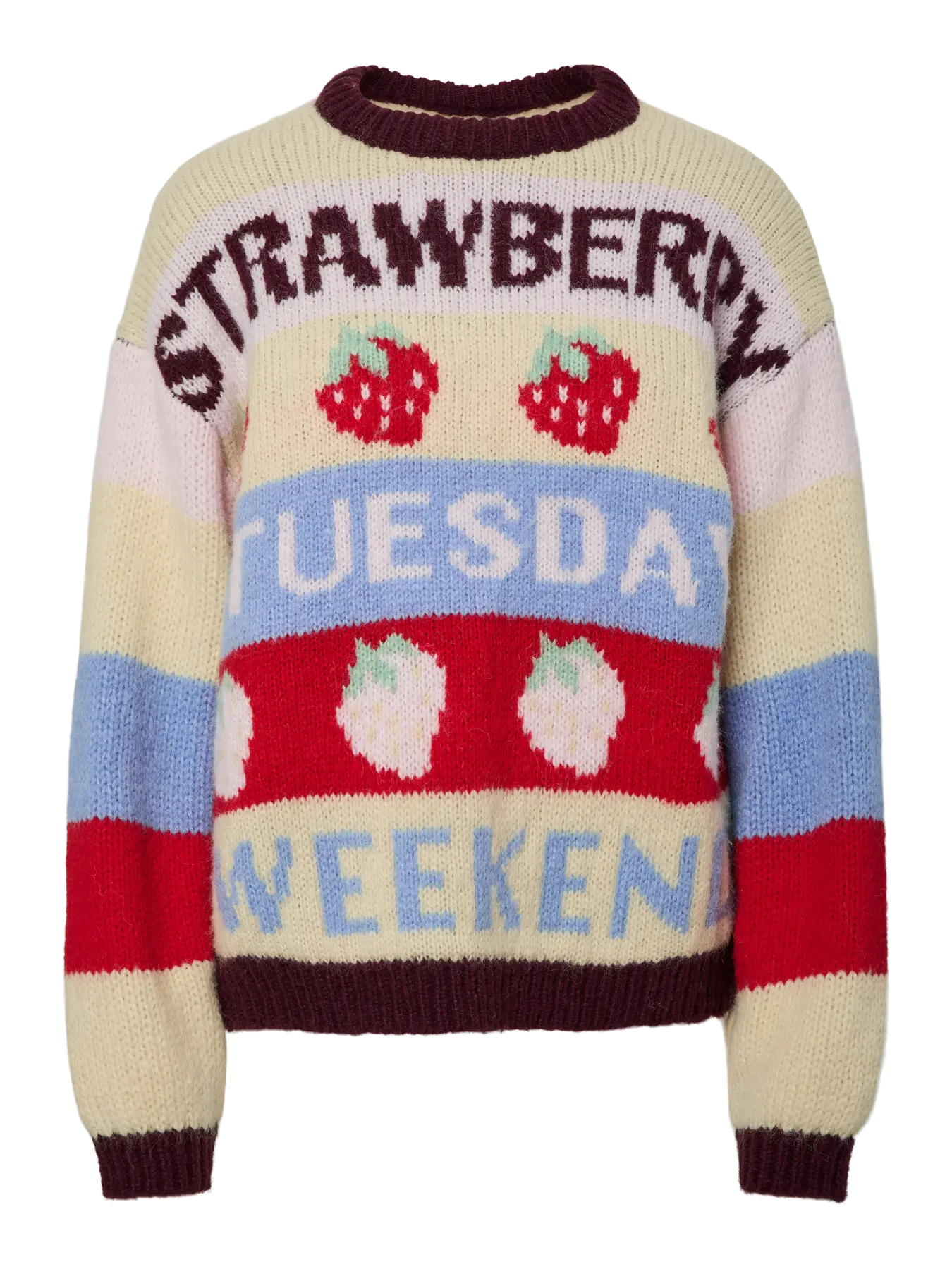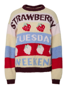 Deze PC Bikka LS Oneck Knit is een speelse en kleurrijke trui die direct een vrolijke noot aan je garderobe toevoegt. De trui is uitgevoerd in een uniek design met verschillende kleurvlakken en patronen, waaronder rode aardbeien en de teksten "STRAWBERRY", "TUESDAY" en "WEEKEND". Het gebreide ontwerp heeft een klassieke ronde hals en lange mouwen, wat zorgt voor een comfortabele en opvallende uitstraling voor elke dag.